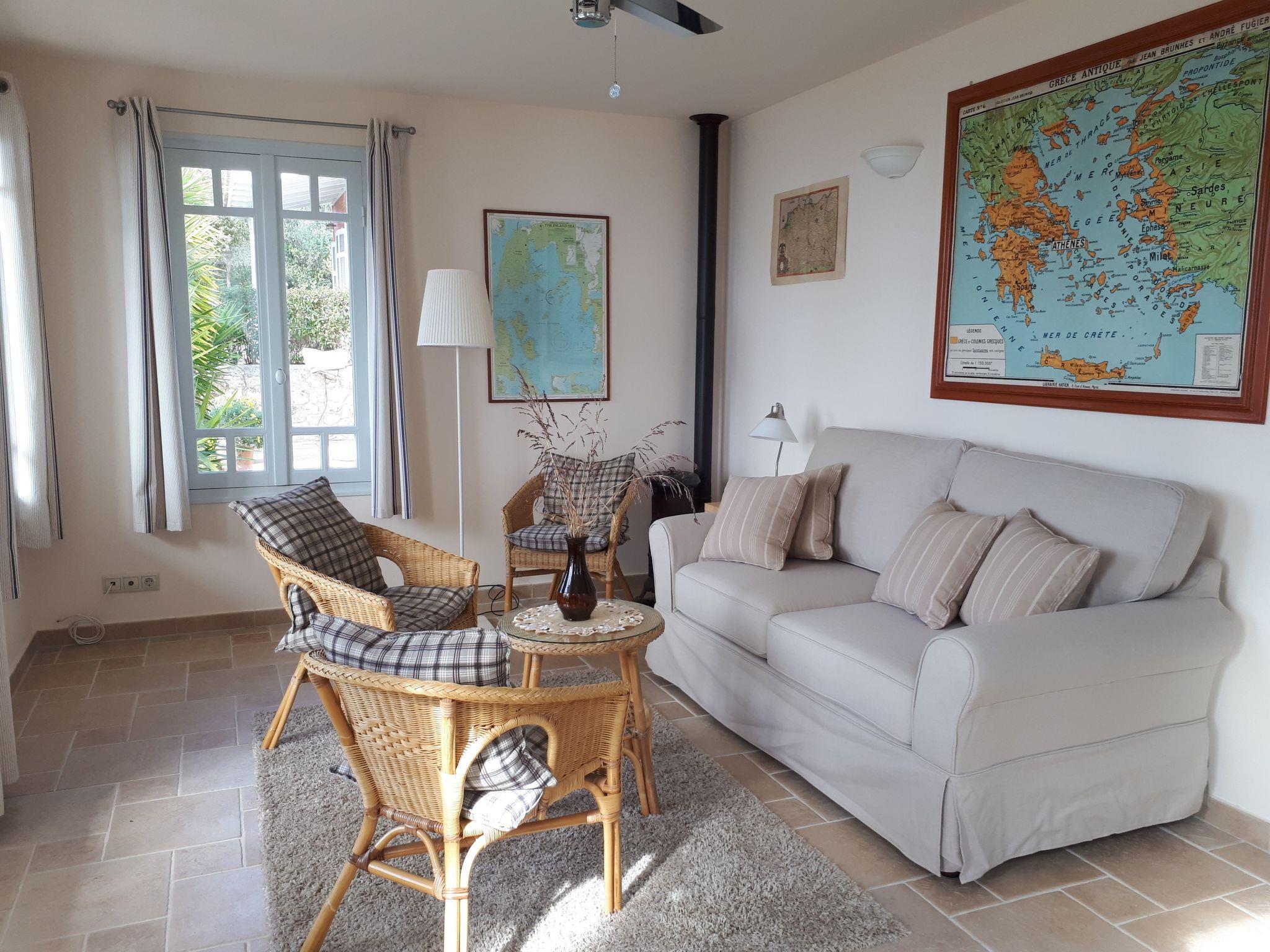 In the two-storey main house you will find the large living room with integrated, fully equipped kitchen, a dining table for 6 people, the couch group by the fireplace and the balcony from which you can enjoy a fantastic view. On the lower floor there is an additional bathroom. There is also our bedroom, which is not rented out. Of course, we are not present while you are renting the property, so you can enjoy the wonderful privacy of the house undisturbed. In the Wing - which is connected to the upper floor of the main house by a glazed passage - on the sea side you will find a bedroom (walk-through room with a comfortable sofa bed) which can also be used as a second living room, a separate toilet room with washbasin and another bedroom with its own master-bathroom. This makes the Wing ideal for a couple or parents with one child. On the opposite side of the pool terrace (which offers the most beautiful views towards the sea and mountains) there is a detached studio with integrated living/bedroom, en-suite bathroom and mini-kitchen as well as its own small terrace. This is ideal for two adults or teenagers.