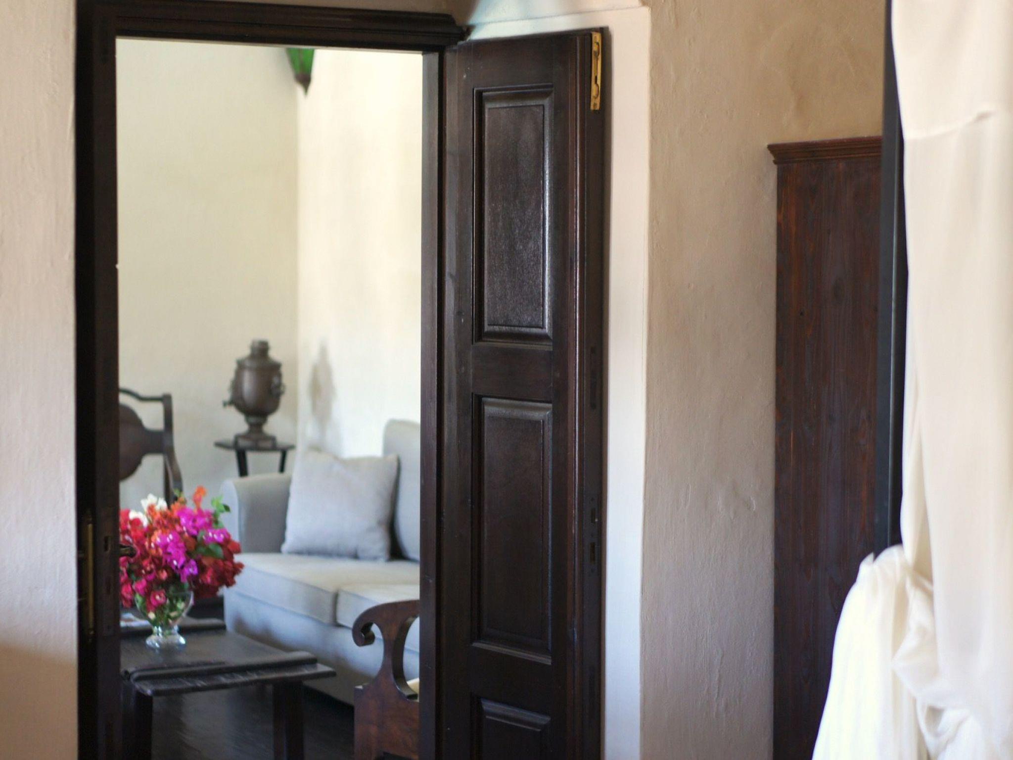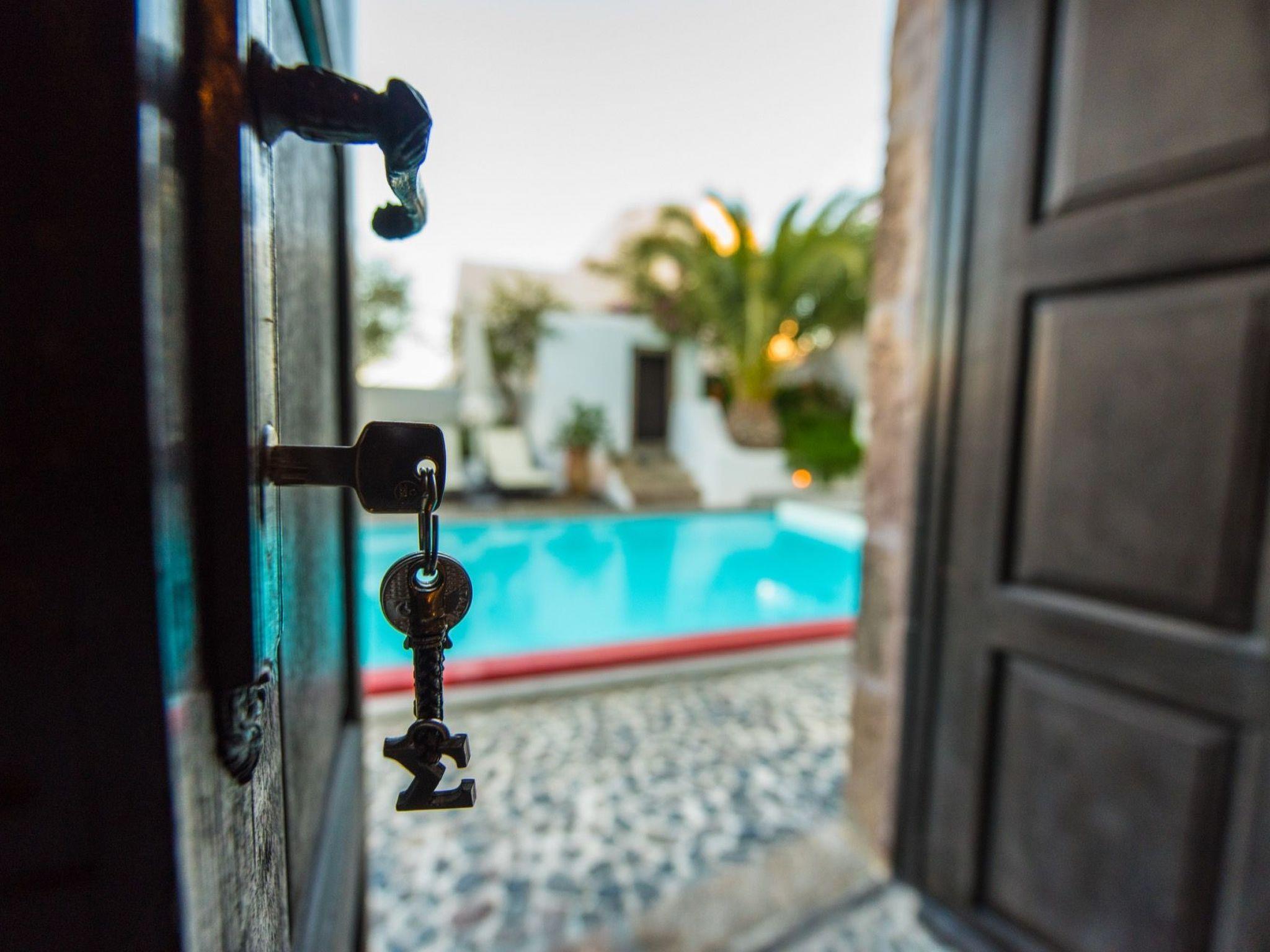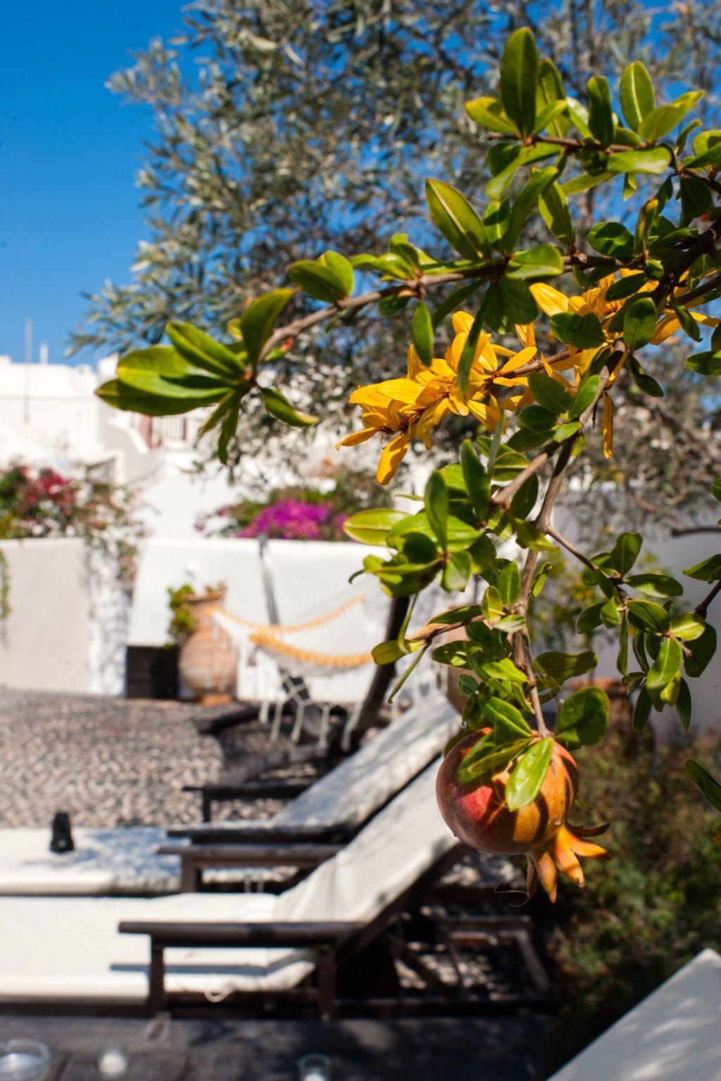 The outdoor area starts by going through the imposing entrance gate made of wood into a secluded courtyard with a garden, as well as a beautiful pool in a Moroccan style. Various lounge furniture, a hammock, deckchairs and a parasol are provided for relaxing. There is a second smaller terrace area with a dining table and chairs for dining outdoors under the Santorini sky.