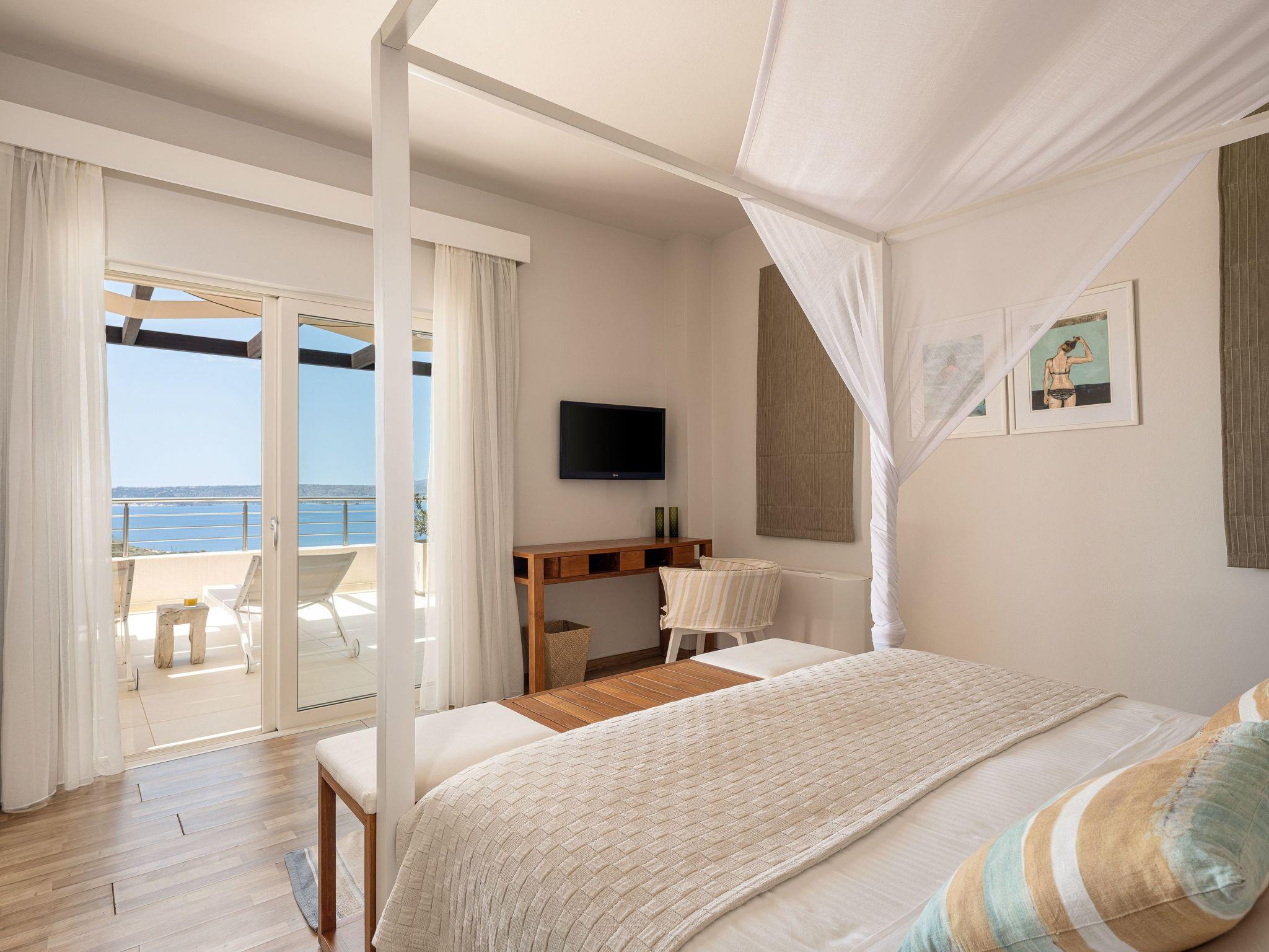 Bedroom 3: Two twin beds (90×200) that can be converted into a king-size bed upon request, en-suite bathroom with hydromassage shower, Satellite LED TV, access to a private balcony with sitting set, and sea views