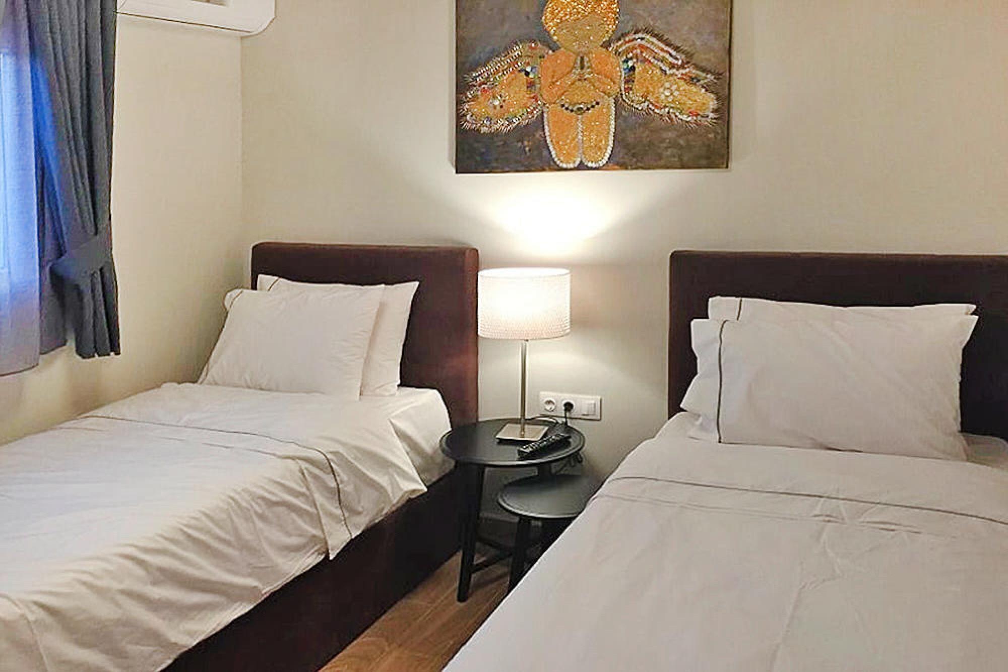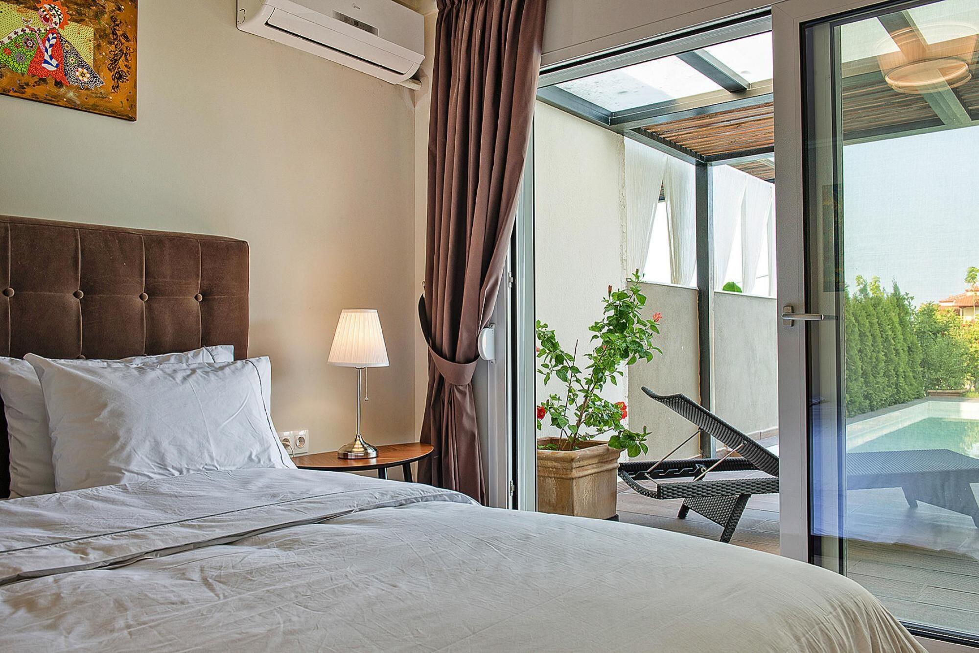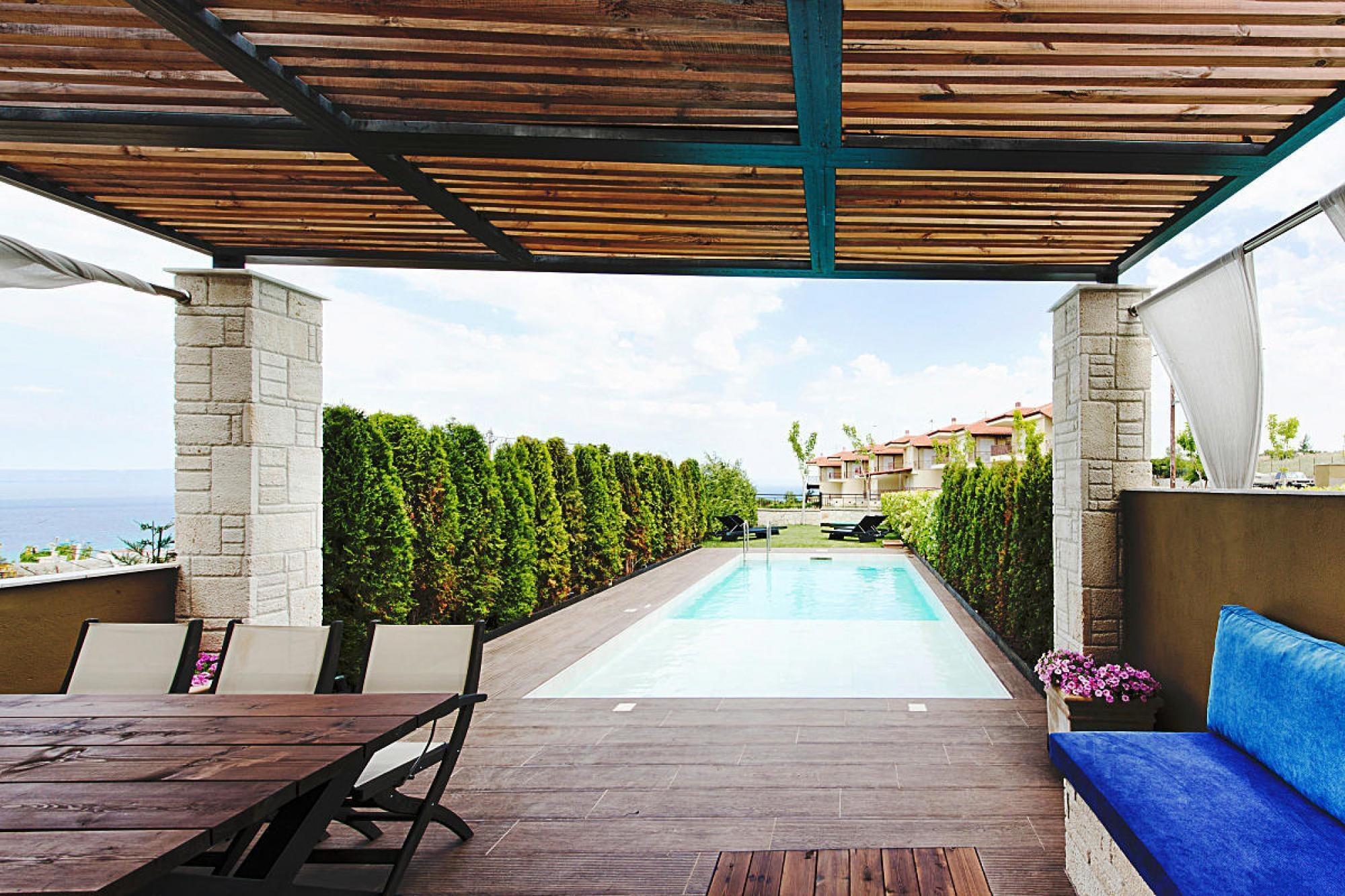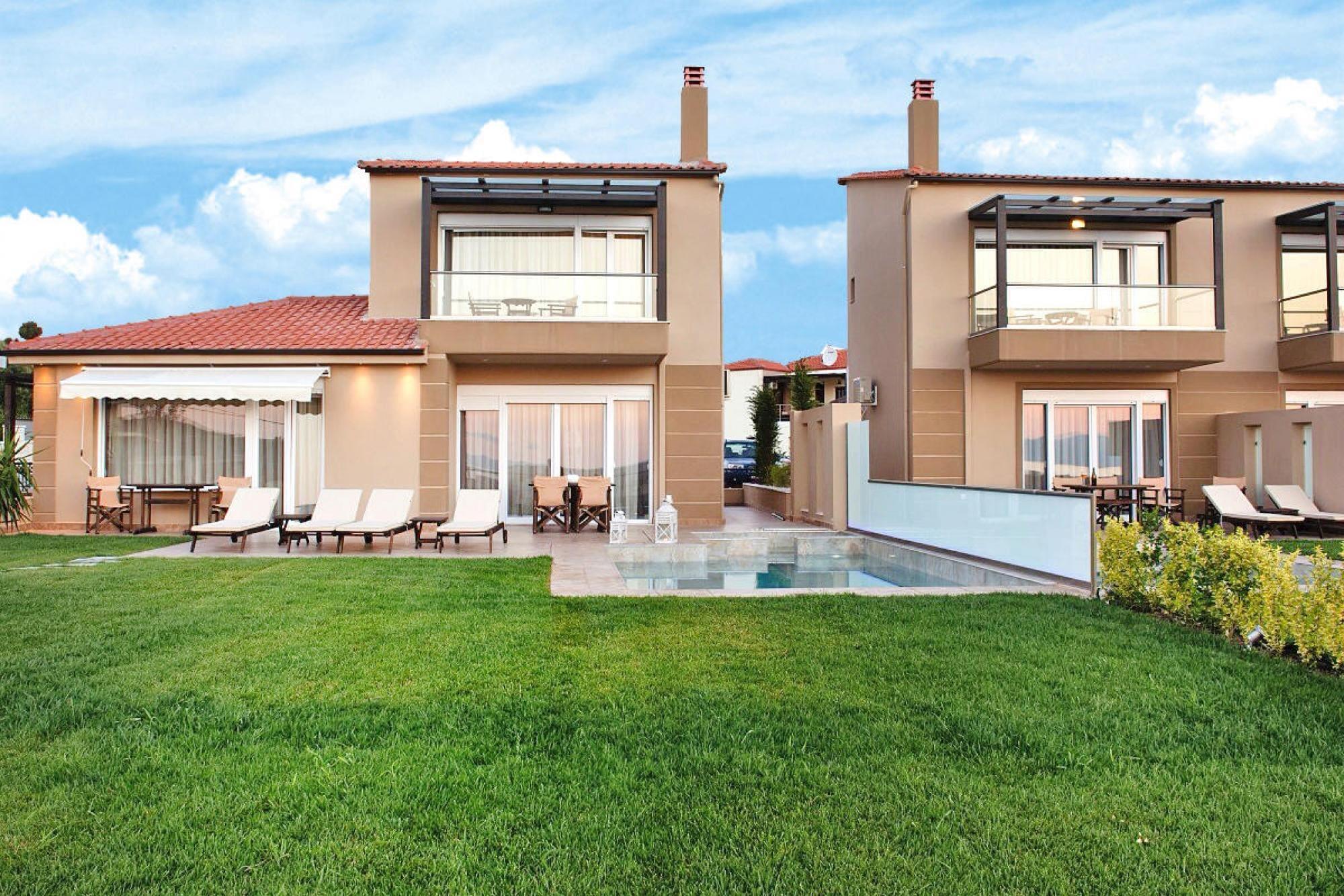 Luxurious villa complex in an impressive hilltop location above Chanioti with a wonderful view of the blue sea and the opposite Sithonia peninsula. The eight tastefully and comfortably furnished holiday homes (built in 2014) each have a well-kept garden with a furnished terrace and private swimming pool with hydromassage. Here you can relax with a cool drink and enjoy wonderful sunrises. A resort-owned SPA with indoor pool, sauna and fitness room is available to you free of charge. Various wellness treatments can be used for a fee. The lively tourist town of Chanioti with its long sandy beach and beautiful waterfront promenade is about 1 km away. Here you will find a good selection of taverns, cafes, bars and shops. Services included: Welcome package Wi-Fi Energy costs, bed linen, towels, final cleaning Daily cleaning included Mobility: Not suitable for people with limited mobility
