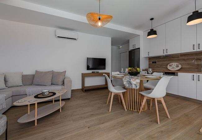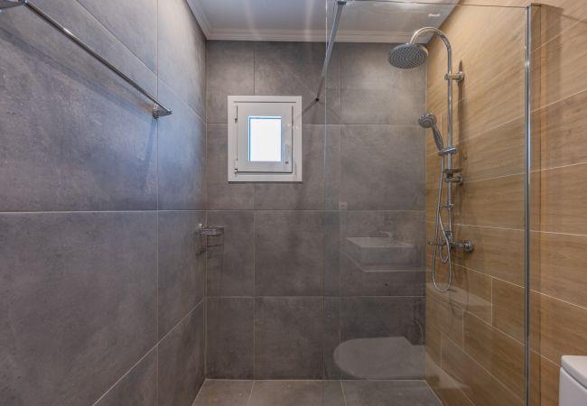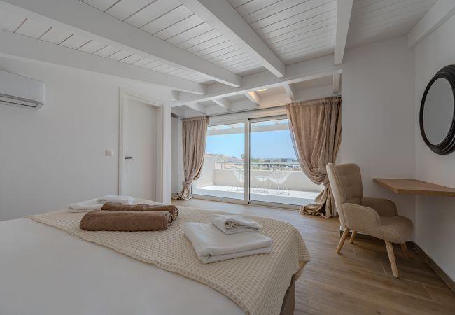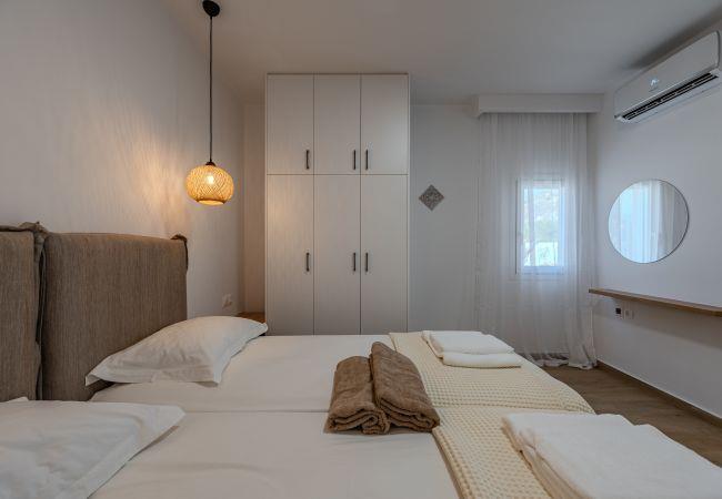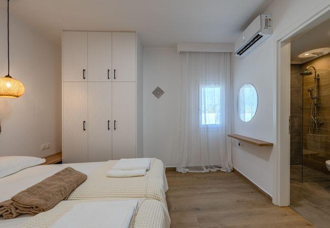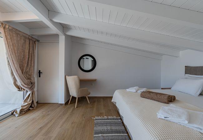 Mythos Villa is thoughtfully equipped with all the amenities needed for a comfortable and enjoyable stay. Relax in the beautiful garden or on the spacious terrace, perfect for outdoor dining and unwinding. The ground floor of this villa features an open-plan living area with a fully equipped kitchen, a dining table, a comfortable corner sofa, and a smart TV. On this level, there is one bedroom with 2 single beds that can be conveniently converted into a Queen-size bed (1.80 x 2.00 meters) and comes with an en-suite bathroom.