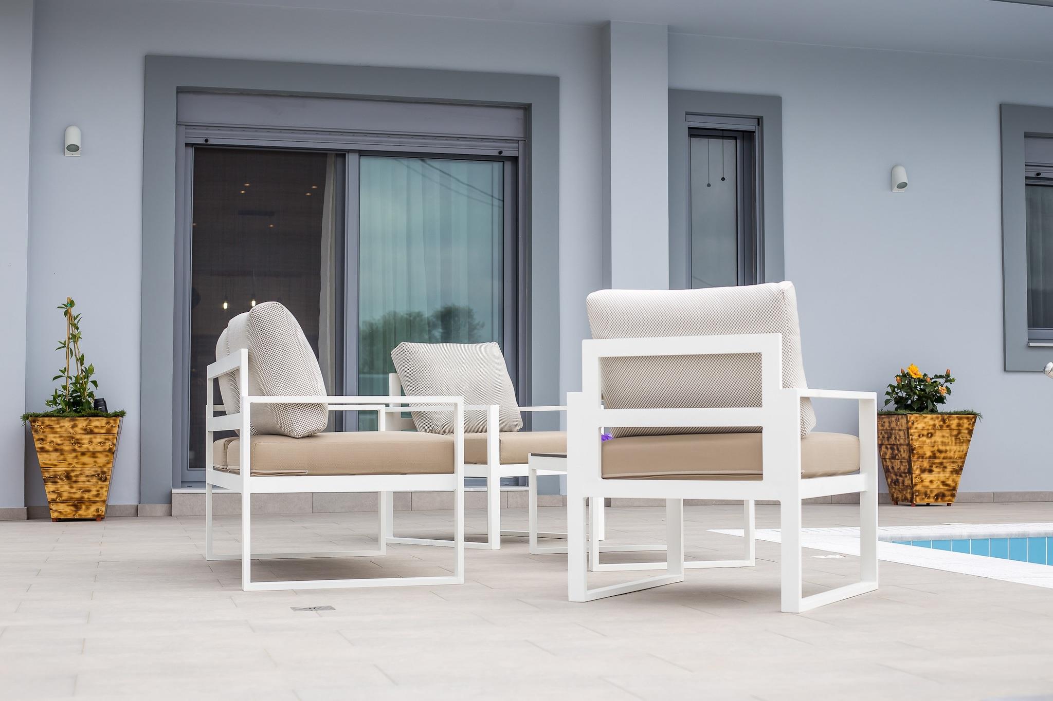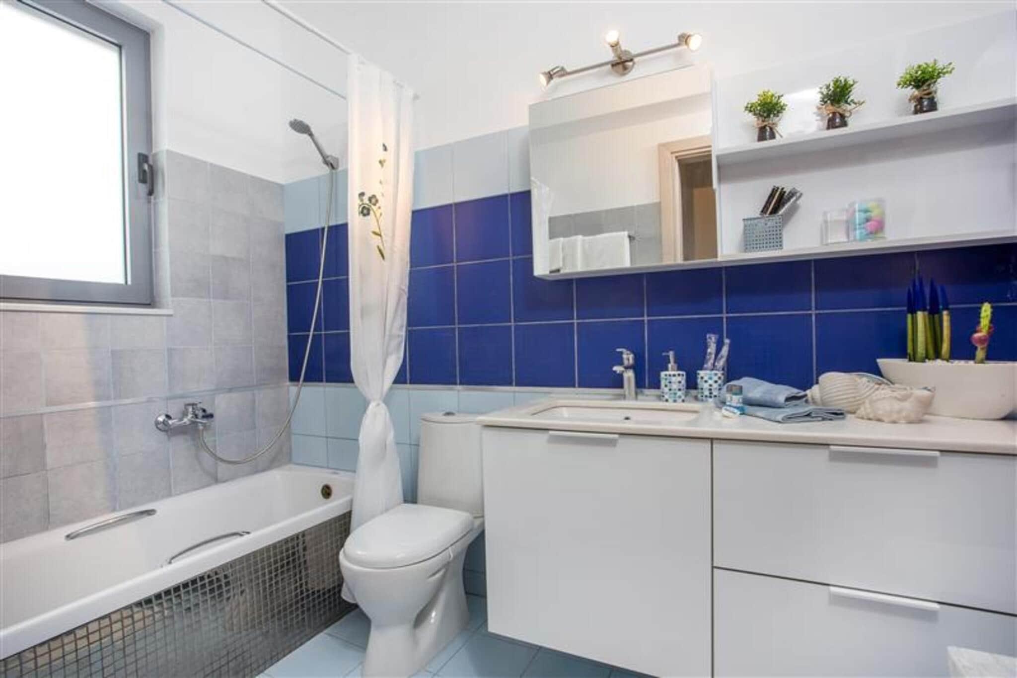 Open kitchen(hob(ceramic), electric kettle, toaster, coffee machine(filter), oven, dishwasher, fridge-freezer, dishes and cutlery, Cooking basics), Living/diningroom(single sofa bed, TV(flatscreen), dining table, seating area), bedroom(double bed, TV(flatscreen)), bedroom(double bed, TV(flatscreen)), bathroom(bath tub, washbasin, toilet), bathroom(bath tub, washbasin, toilet), Internet access, shower(outside), washing machine, balcony, patio, air conditioning, sun loungers, BBQ(gas), swimming pool(private)