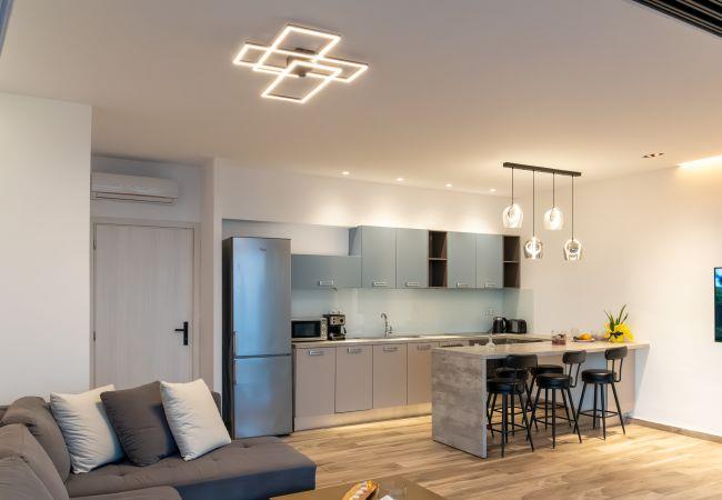 This single-level villa, covering 110 square meters, boasts high-end, contemporary luxury. It comprises a spacious, luminous living room with a comfortable sofa, complete with a flat screen TV and Wi-Fi connectivity. The modern, open-plan kitchen is equipped with a ceramic stovetop, oven, fridge, freezer, dishwasher, and all the necessary utensils.