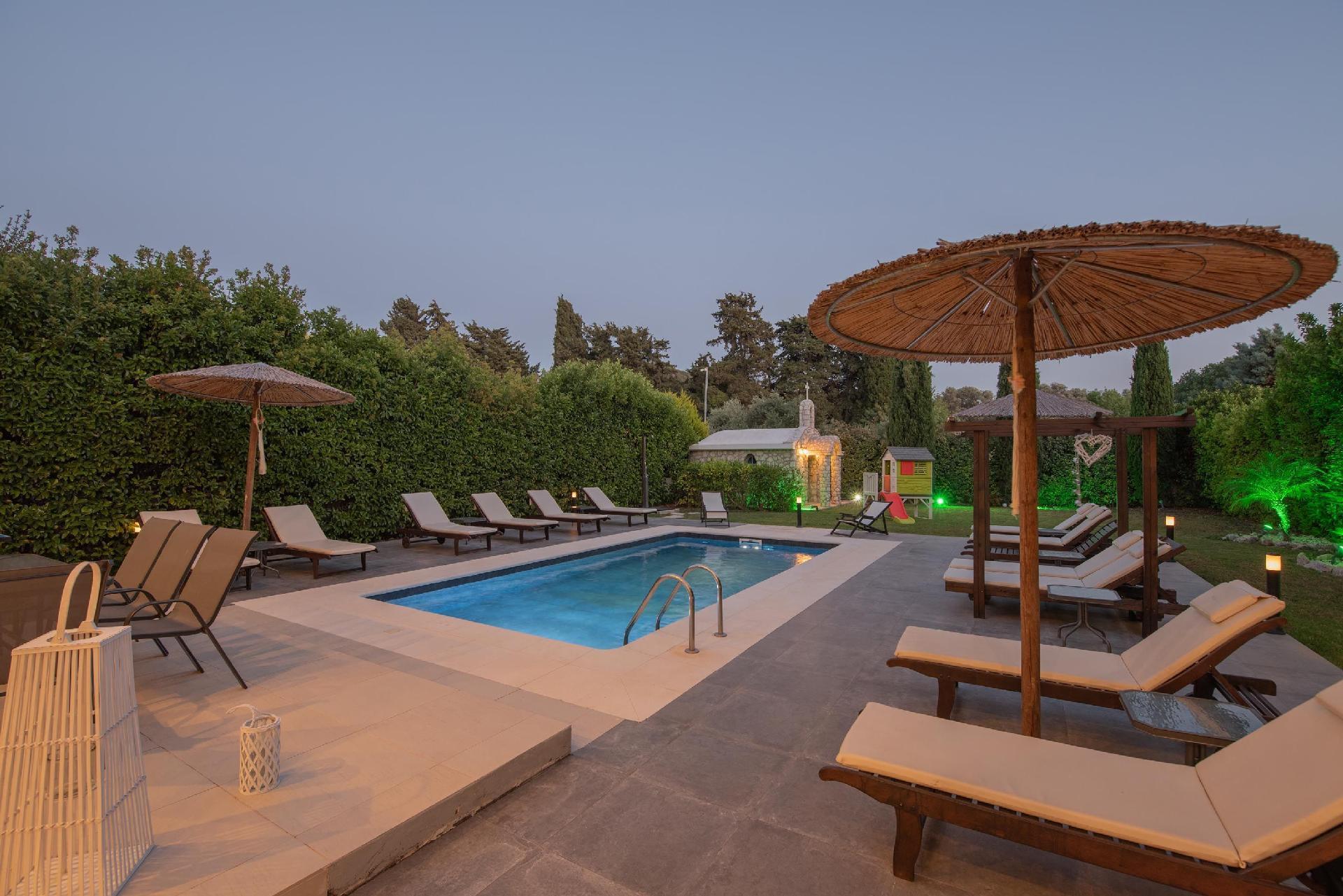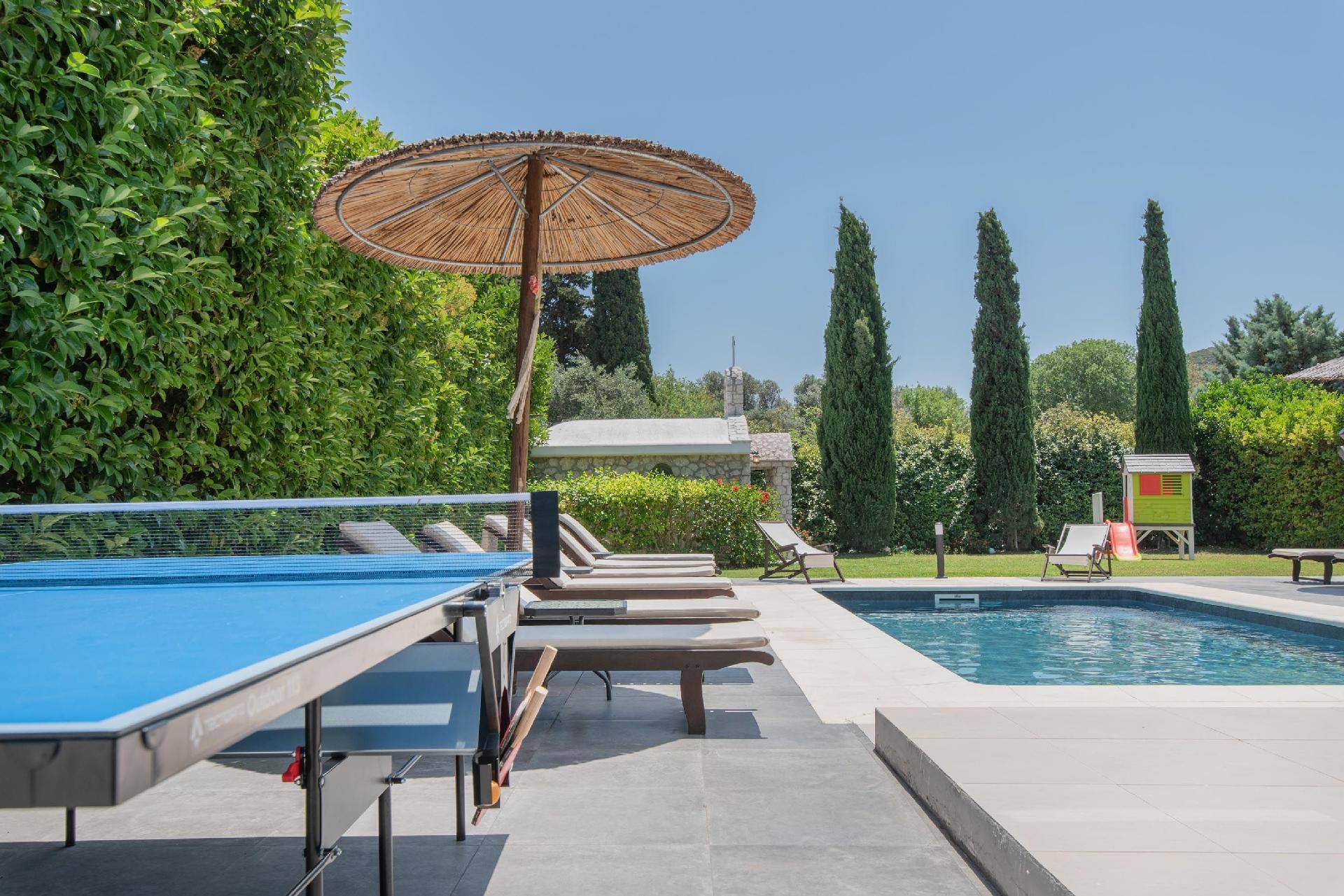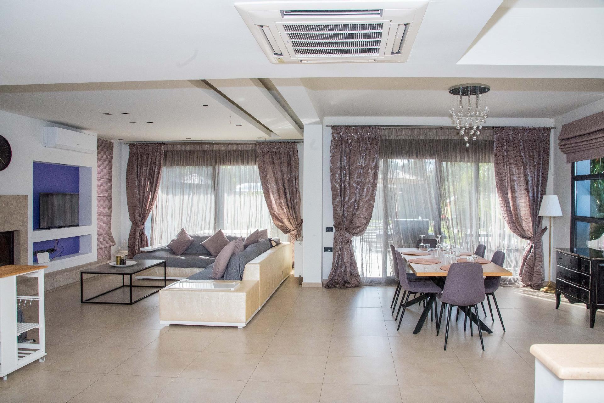 The villa’s interior offers comfortable and functional spaces with modern décor, creating a pleasant atmosphere, ideal to relax and enjoy your holidays. The villa offers 4 air-conditioned bedrooms, 3 double bedded rooms and one with twin beds. Two of the bedrooms include bathrooms. There are 3 bathrooms in total, one with a bathtub and 2 with a shower. There is a kitchen fully equipped for any meal preparation accompanied from the sitting area. Also, there is a comfy large living room with 2 separate sitting areas and a large flat screen TV with satellite channels and a game console. Outdoors, villa offers a private swimming pool with its sunbeds to relax in the hot summer days while working on your tan. There are also BBQ facilities where you can light up the fire and prepare a great meal for an evening gathering with family and friends.