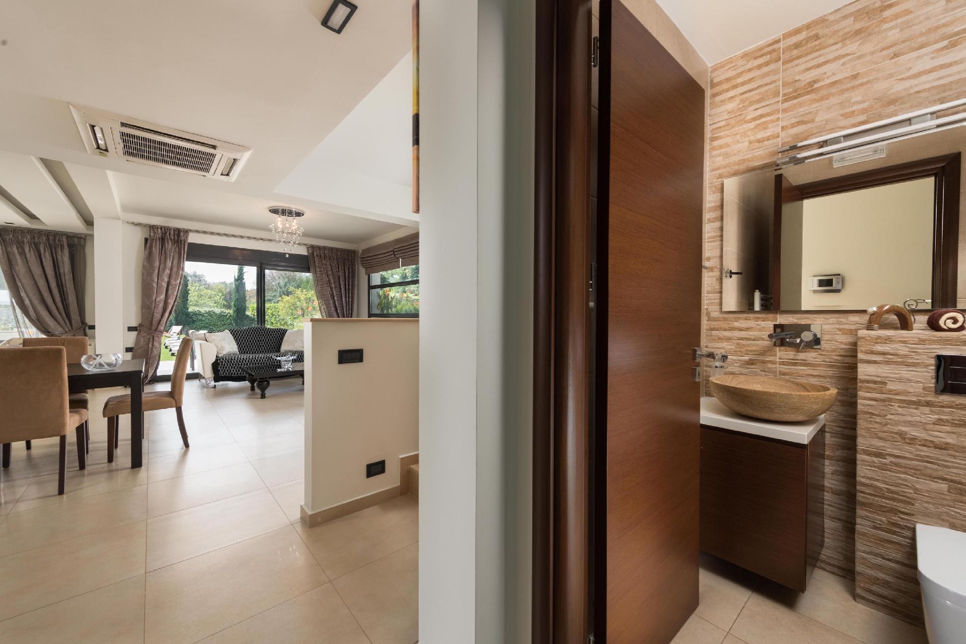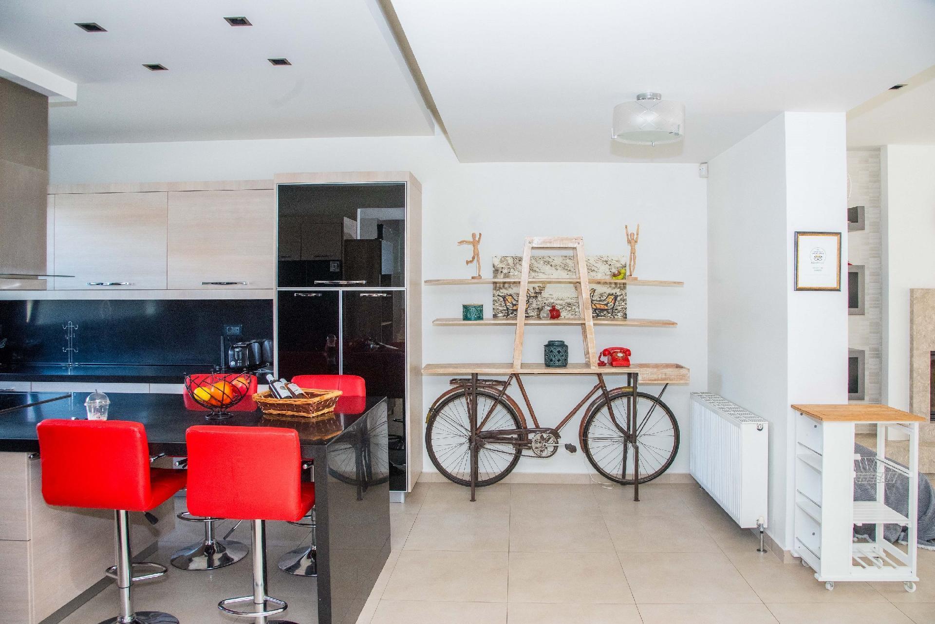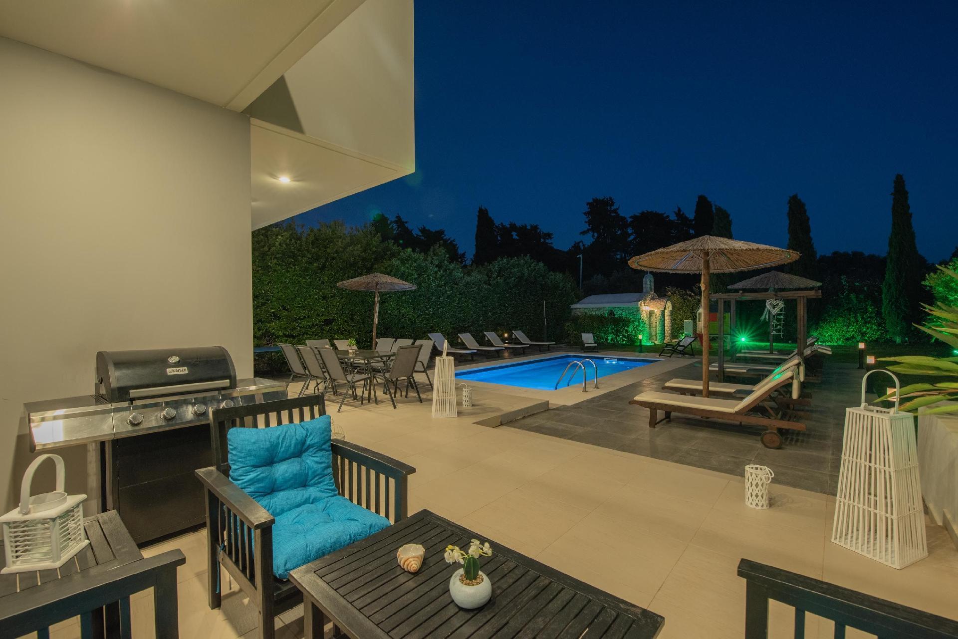 The villa’s interior offers comfortable and functional spaces with modern décor, creating a pleasant atmosphere, ideal to relax and enjoy your holidays. The villa offers 4 air-conditioned bedrooms, 3 double bedded rooms and one with twin beds. Two of the bedrooms include bathrooms. There are 3 bathrooms in total, one with a bathtub and 2 with a shower. There is a kitchen fully equipped for any meal preparation accompanied from the sitting area. Also, there is a comfy large living room with 2 separate sitting areas and a large flat screen TV with satellite channels and a game console. Outdoors, villa offers a private swimming pool with its sunbeds to relax in the hot summer days while working on your tan. There are also BBQ facilities where you can light up the fire and prepare a great meal for an evening gathering with family and friends.