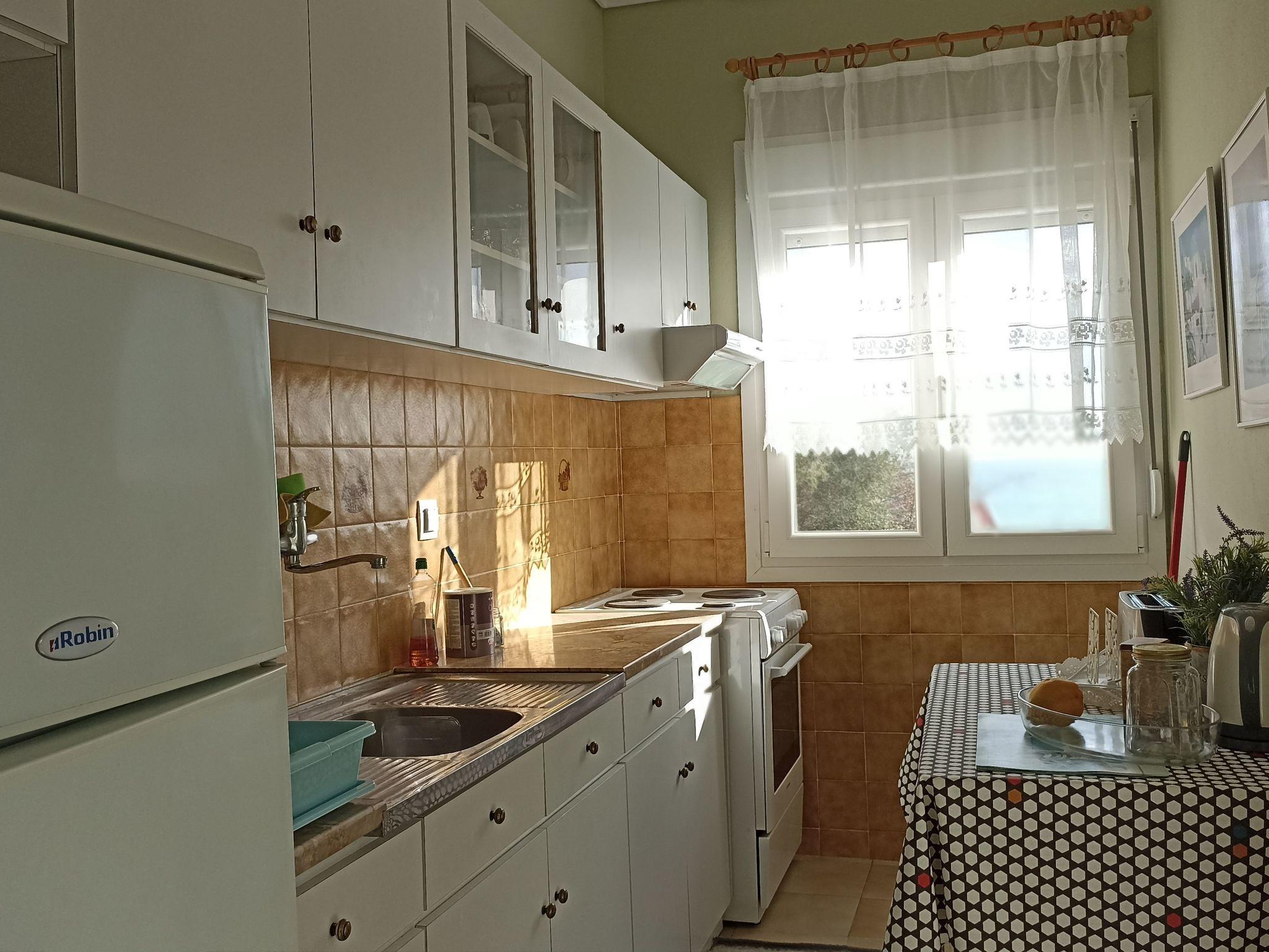 L'intérieur de la villa comprend deux chambres confortables, un salon spacieux, une cuisine entièrement équipée et une salle de bains. Chaque pièce a été meublée avec goût, mêlant pièces originales et décoration élégante pour créer une atmosphère chaleureuse, reflet du style grec local. Le balcon, offrant une vue directe sur la mer, complète cet intérieur harmonieux et accueillant.