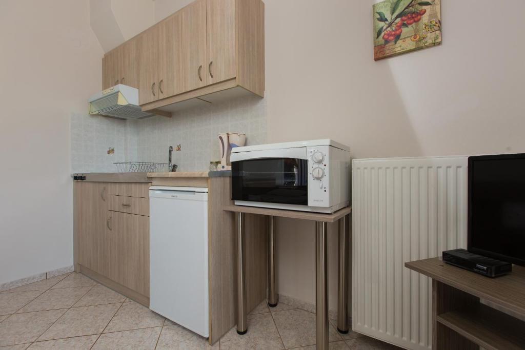 Each apartment features a double bedroom(1,60x2.00), a bathroom with shower, a cosy living area and a kitchenette for your daily needs. A large, fully equipped kitchen can also be found on the ground floor with a spacious wooden dining area, ideal for family gatherings and perfect if you want to have your meals at home.