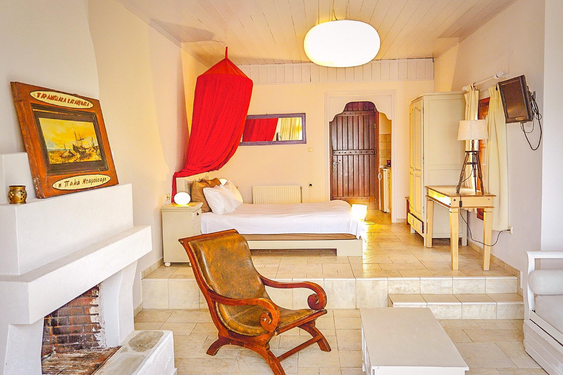 The houses are built in a 9,000 square meter property surrounded by olive trees and consist of three buildings. Each building has 4 studios (two upstairs and two on the ground floor). All are equally modern and tastefully furnished and offer a relaxing holiday. They are situated practically in the middle of nature between mountain and sea, between heaven and earth. The studios have a lovely living room with a fireplace, shower / WC, a properly equipped kitchenette, a double bed and a sofa bed, which also is suitable for a third adult or for 2 children. The studios also have air conditioning, Wi-Fi internet access, TV, balcony with garden furniture and view at the Aegean sea.