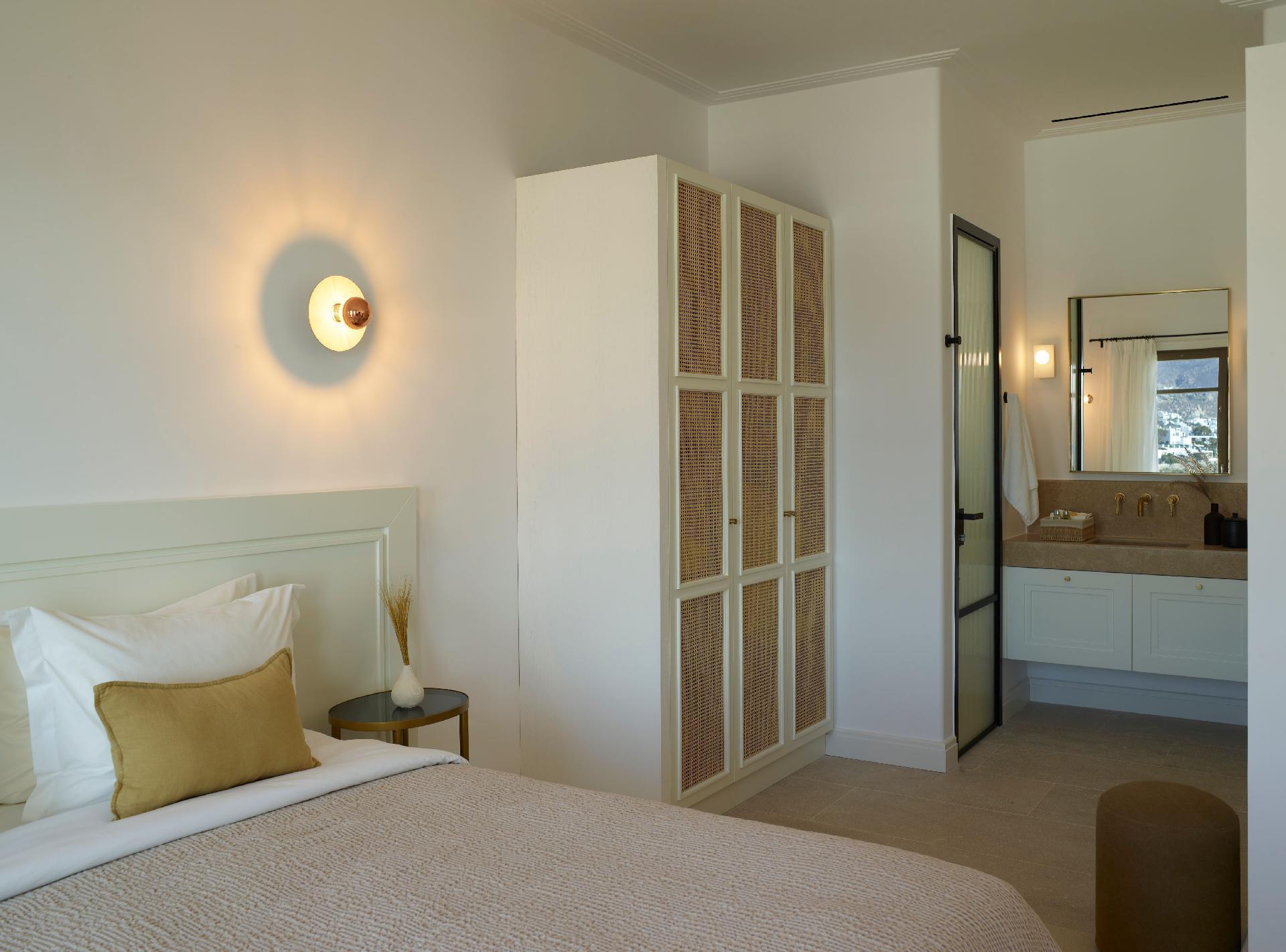 The interior of this holiday house has been meticulously designed to provide a comfortable and inviting atmosphere. Spanning across 100 sq.m./1076 sq.ft., the space is equipped with air conditioning throughout to ensure your utmost comfort during the warm Mykonian summers. The house comprises three generously sized bedrooms each with en-suite bathrooms, facilitating private spaces for all guests. These bathrooms stand out with bright lighting, golden washbasins, and chic black iron and glass doors adorned with intricate wavy patterns, ensuring every morning starts with a touch of elegance.