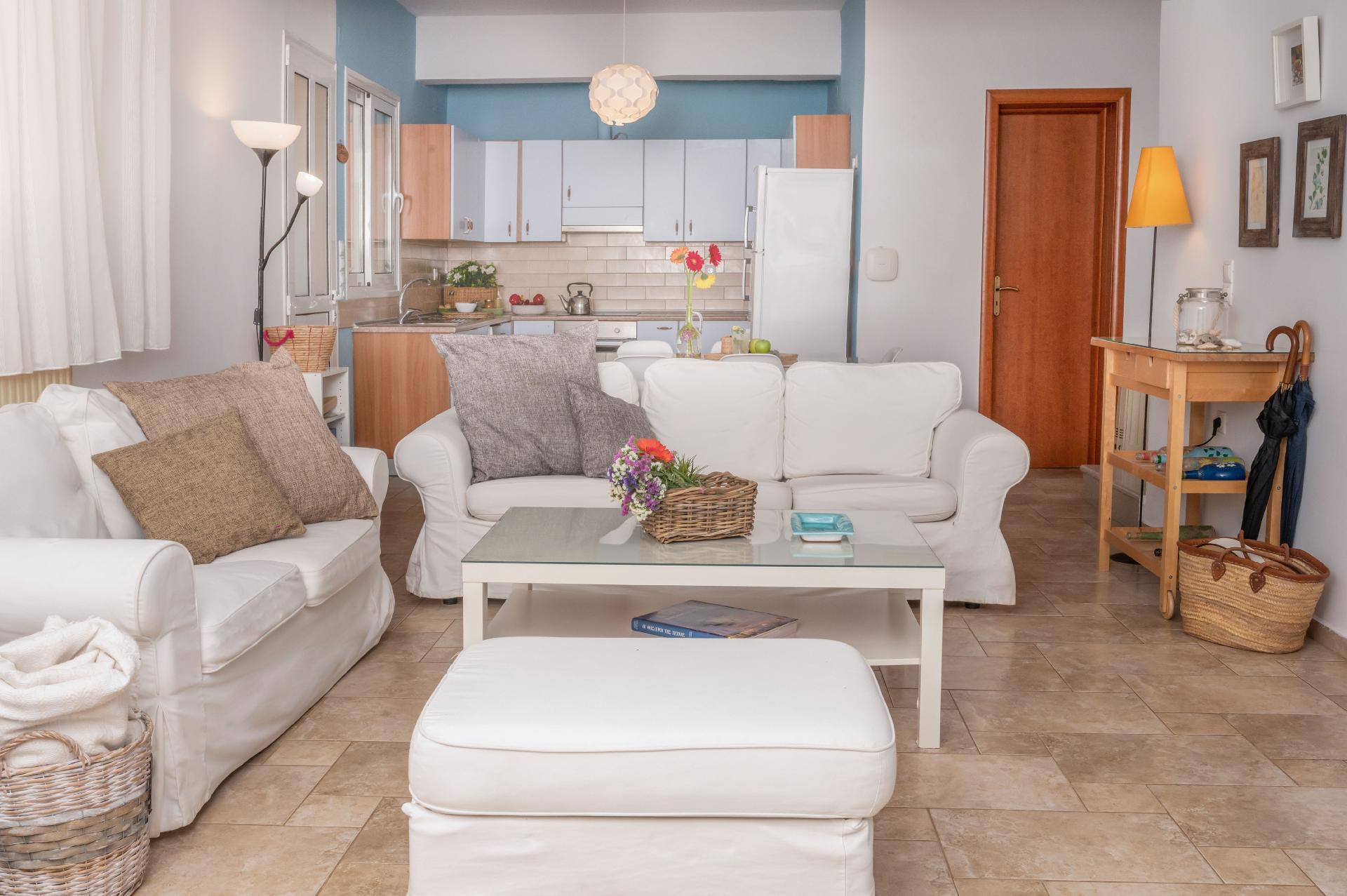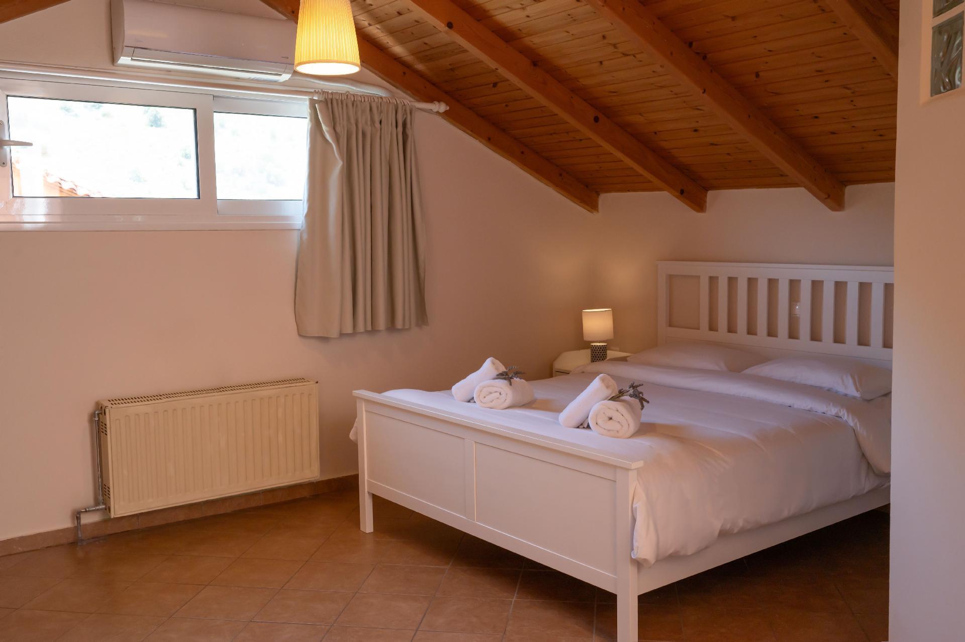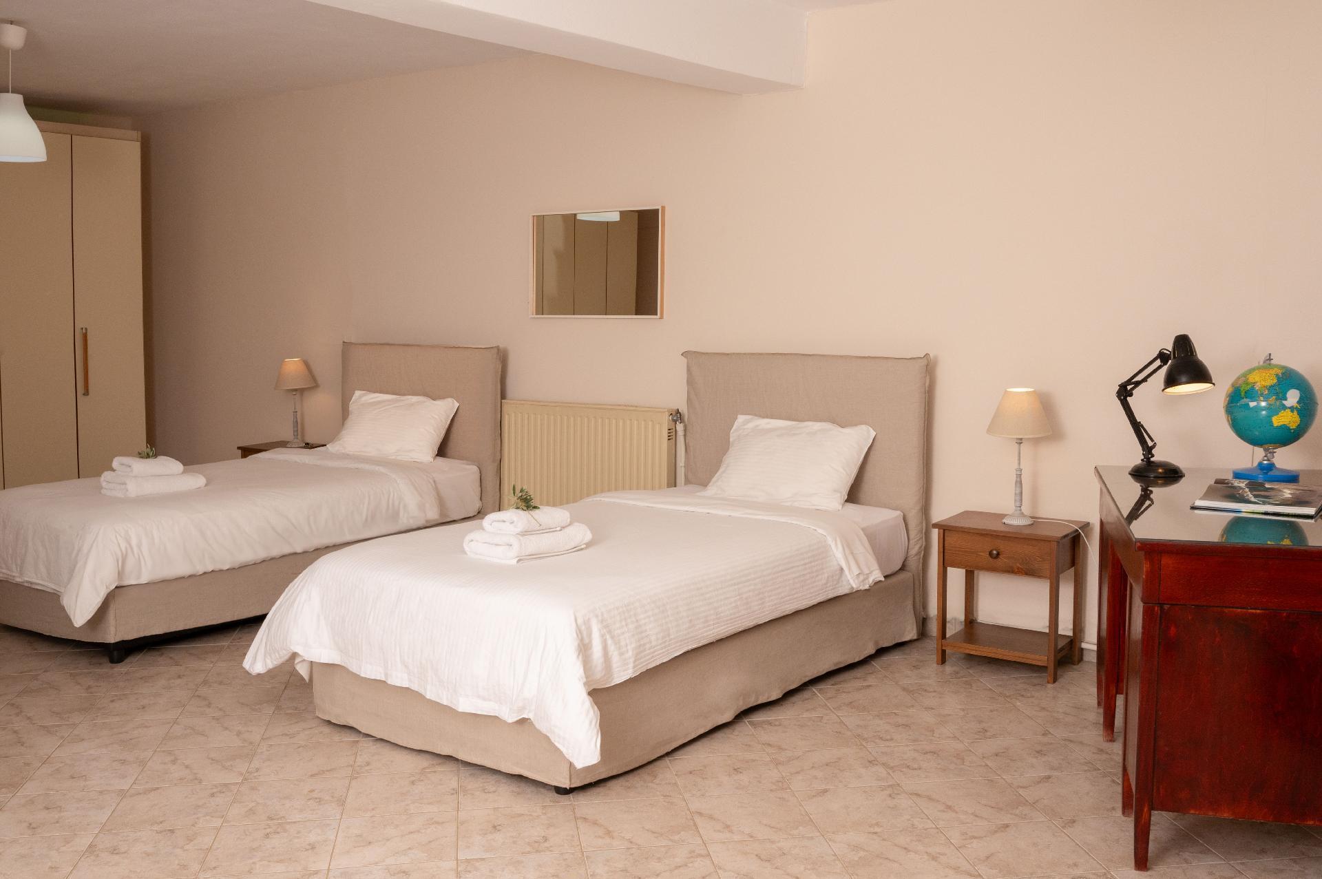 The ground floor is about 50 m² in size and comprises of the following rooms: A living room with a fireplace, a flat screen TV, a big sofa and chairs. There is also a fully-equipped kitchen with an oven, microwave, coffee machine, fridge, dishwasher and a dining area, as well as a bathroom with a shower. A marble staircase leads to the first floor, which includes: two separate bedrooms with double beds. The floor is complemented with a bathroom with shower and one extra toilet. There is also a 3rd bedroom with three single beds at the basement of the house, which can be accessed from the ground floor. There is central heating and AC for all the rooms, except the 3rd which is the coolest and has a fan.