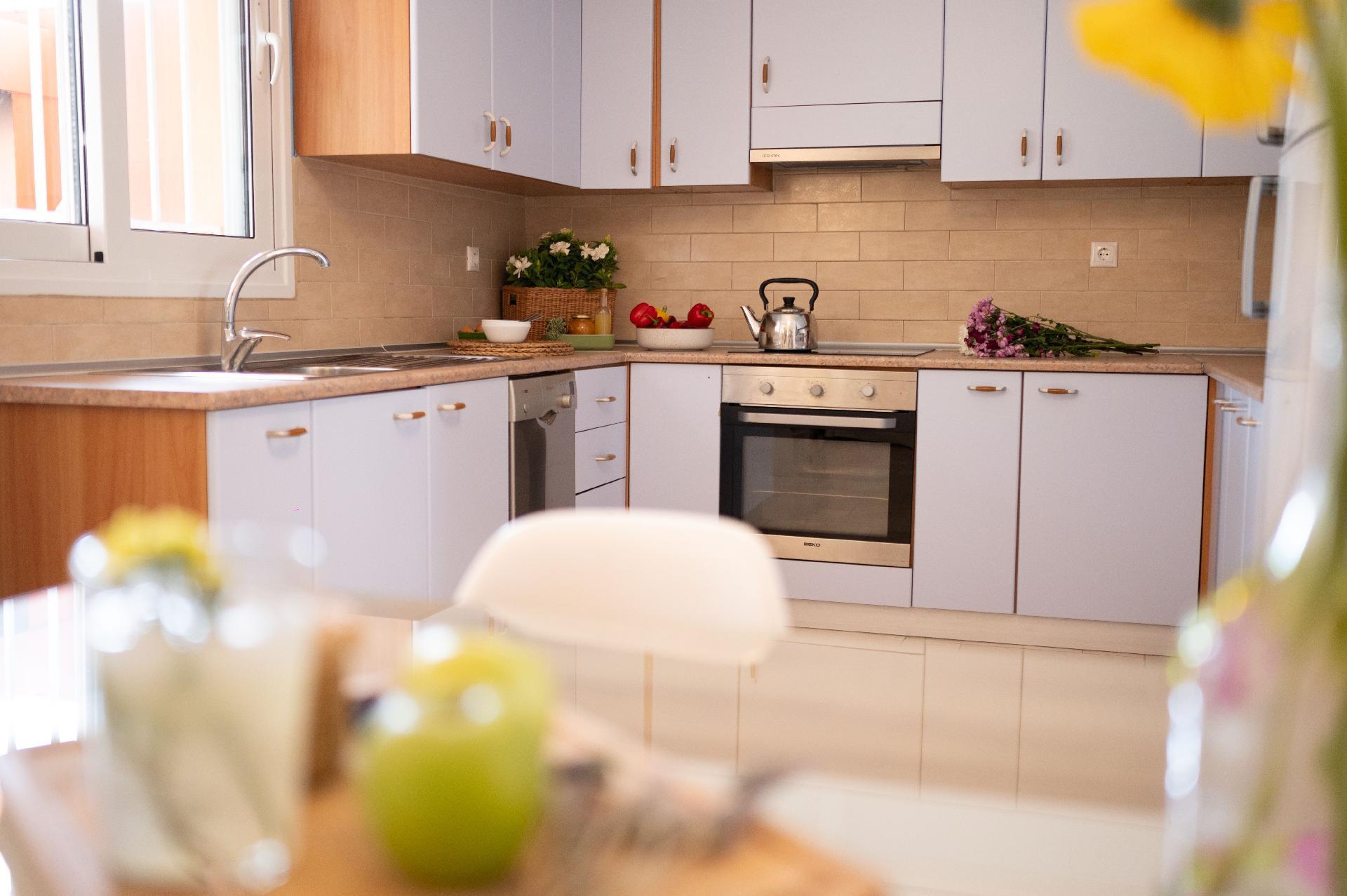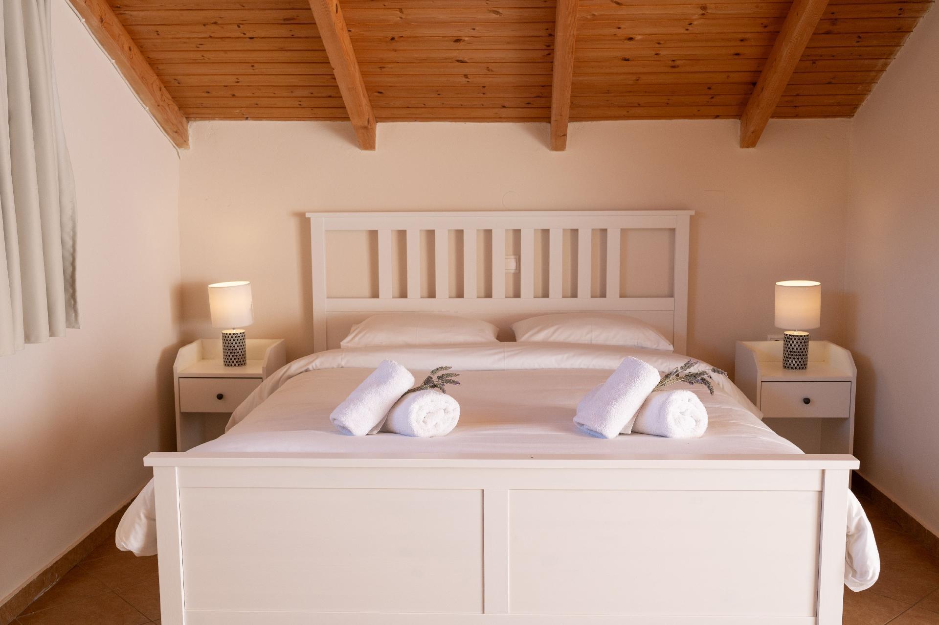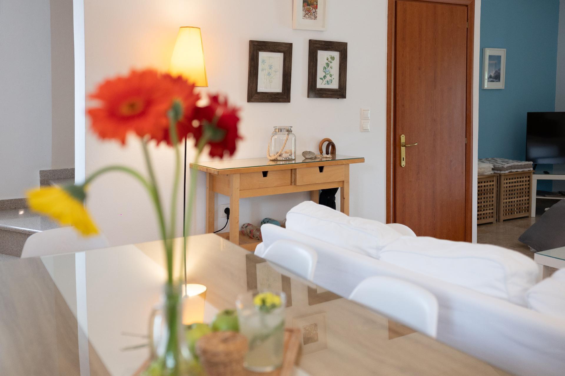The ground floor is about 50 m² in size and comprises of the following rooms: A living room with a fireplace, a flat screen TV, a big sofa and chairs. There is also a fully-equipped kitchen with an oven, microwave, coffee machine, fridge, dishwasher and a dining area, as well as a bathroom with a shower. A marble staircase leads to the first floor, which includes: two separate bedrooms with double beds. The floor is complemented with a bathroom with shower and one extra toilet. There is also a 3rd bedroom with three single beds at the basement of the house, which can be accessed from the ground floor. There is central heating and AC for all the rooms, except the 3rd which is the coolest and has a fan.