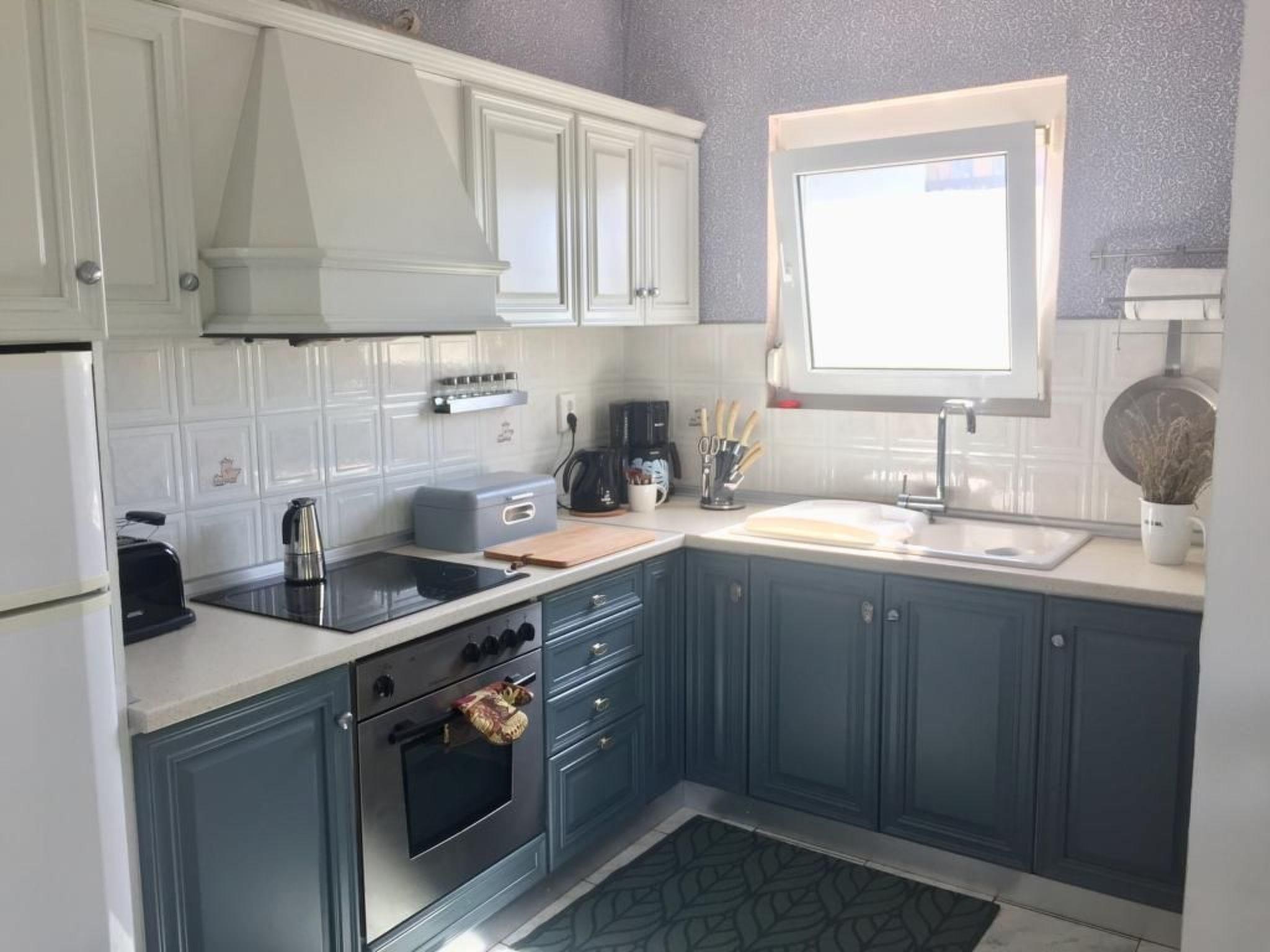In the front garden area there is a fireplace with a view of the sea and the stars at night, in the back garden area there is a barbecue area with a large, shaded dining area and from here you also have a fantastic view over the sea to the island of Thassos.