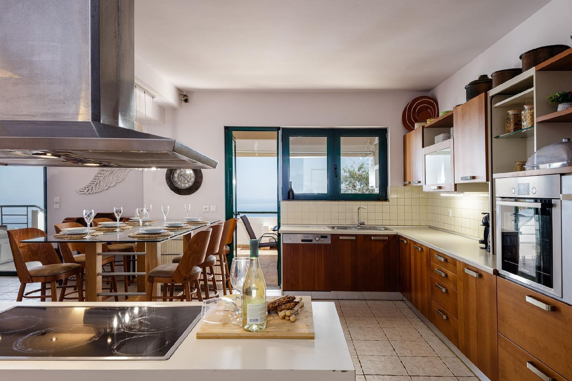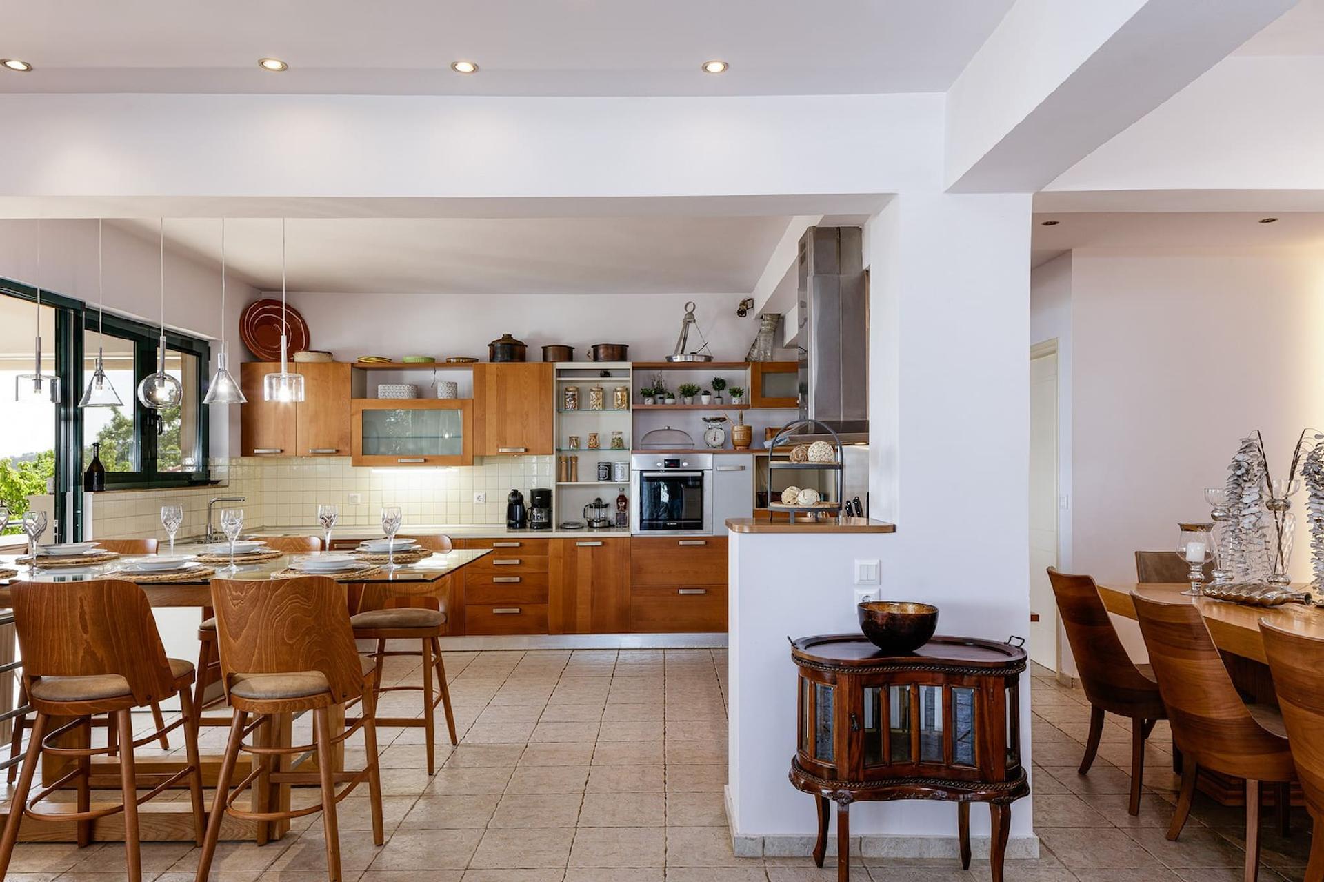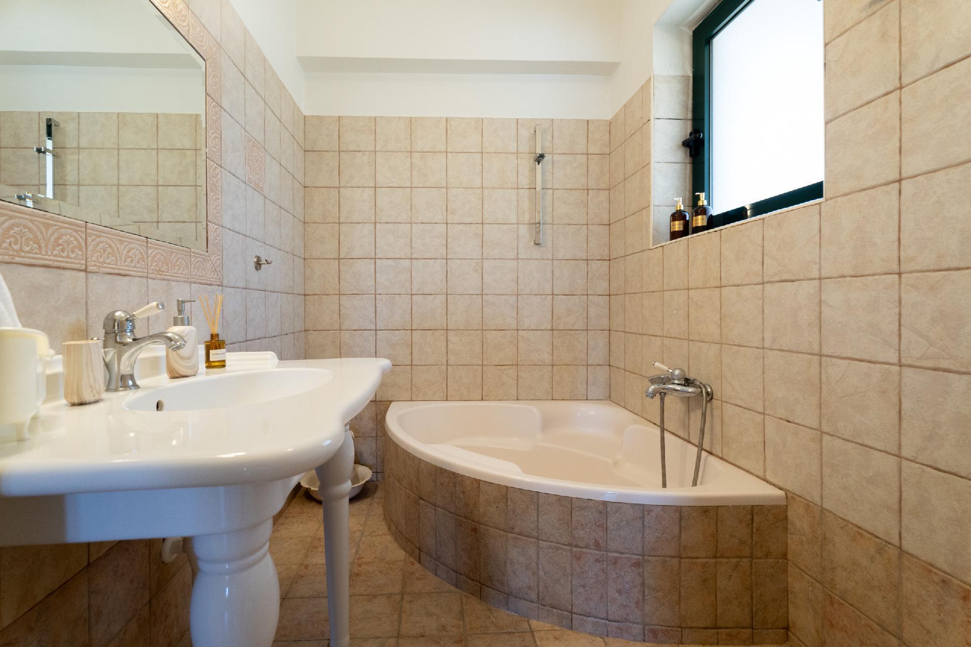 Entering the villa on the ground floor there is a spacious open plan area consisting of the living room with a fireplace, an indoor dining area and a fully equipped kitchen with all the necessary home appliances such as microwave, oven , cooker, dishwasher, a big fridge/ freezer, coffee maker, kettle, toaster, mixer, grill/sandwich maker and blender. There is a full set of cutlery, cooking utensils and glassware. In the storage rooms you will also find an iron, ironing board, first aid kit. Then, in front there is a spacious living room/dining room with furniture, lighting and decoration of the highest standard and specially selected to create an atmosphere of intimacy and familiarity for moments of warmth and relaxation. There's an LCD HD satellite ?V , a Playstaion 4 console ,music system and air conditioners in every bedroom (use of a/c is included in the price). Downstairs there is also a bedroom (air-conditioned) with a double bed , satellite TV and a full bathroom with bathtub.