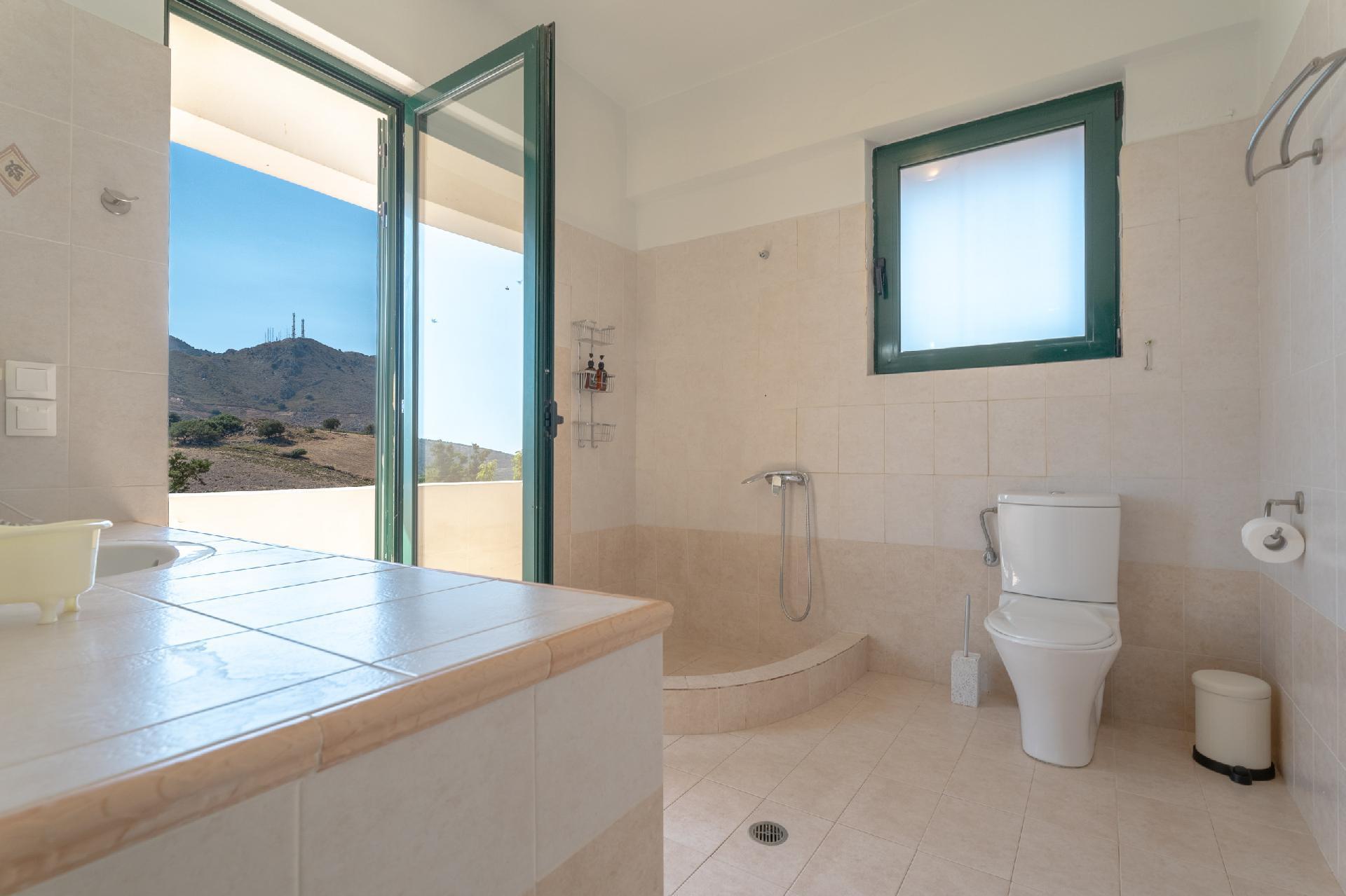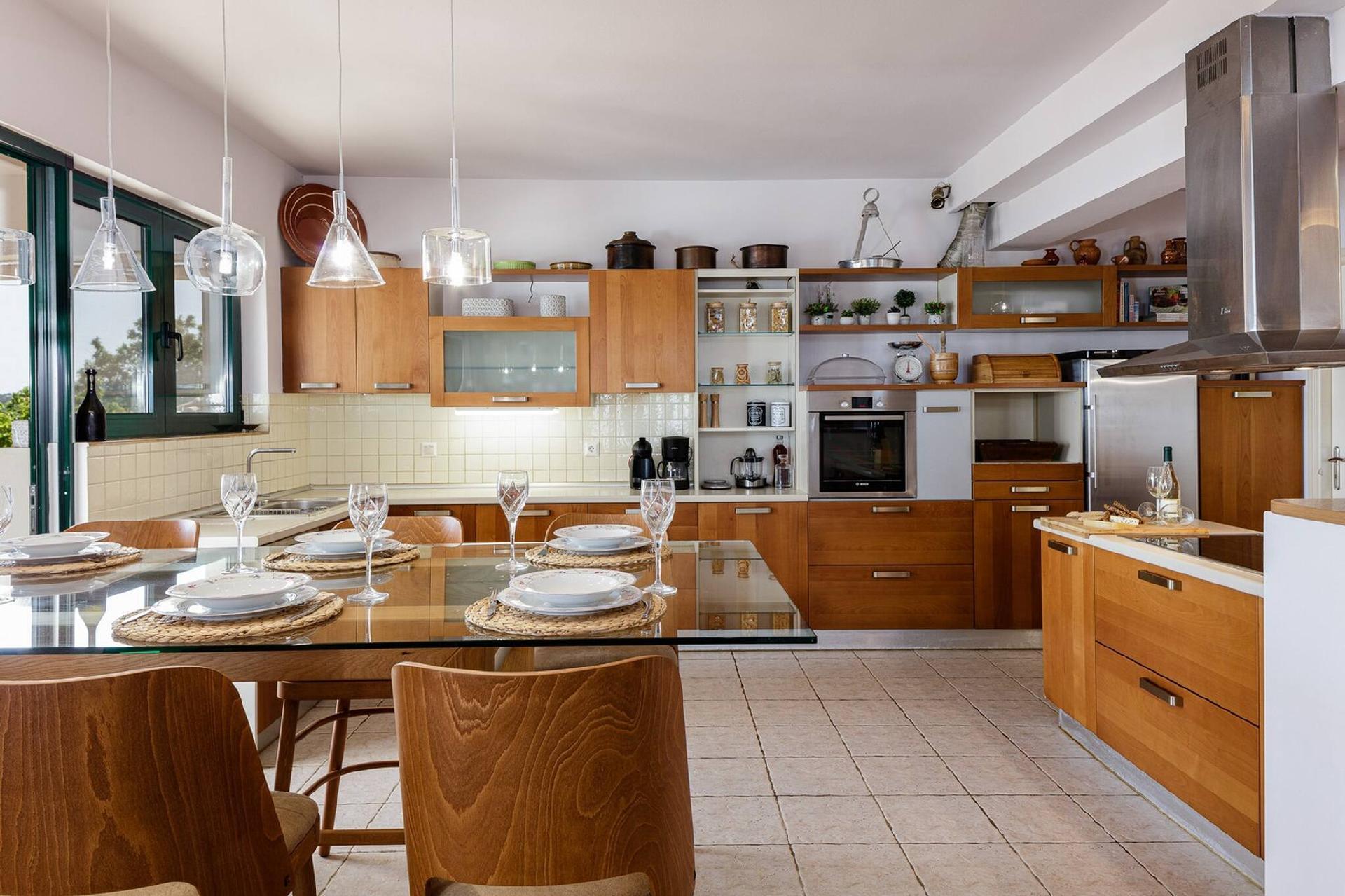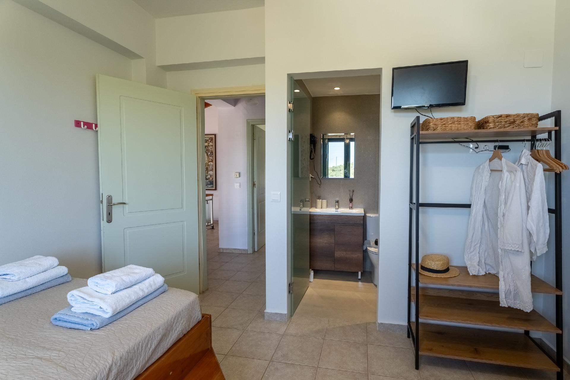 Entering the villa on the ground floor there is a spacious open plan area consisting of the living room with a fireplace, an indoor dining area and a fully equipped kitchen with all the necessary home appliances such as microwave, oven , cooker, dishwasher, a big fridge/ freezer, coffee maker, kettle, toaster, mixer, grill/sandwich maker and blender. There is a full set of cutlery, cooking utensils and glassware. In the storage rooms you will also find an iron, ironing board, first aid kit. Then, in front there is a spacious living room/dining room with furniture, lighting and decoration of the highest standard and specially selected to create an atmosphere of intimacy and familiarity for moments of warmth and relaxation. There's an LCD HD satellite ?V , a Playstaion 4 console ,music system and air conditioners in every bedroom (use of a/c is included in the price). Downstairs there is also a bedroom (air-conditioned) with a double bed , satellite TV and a full bathroom with bathtub.