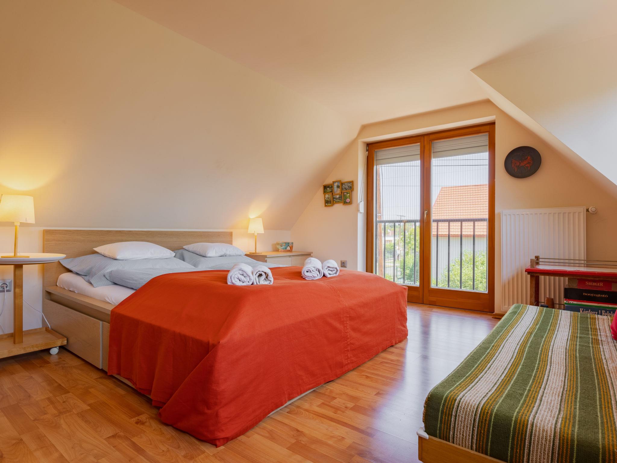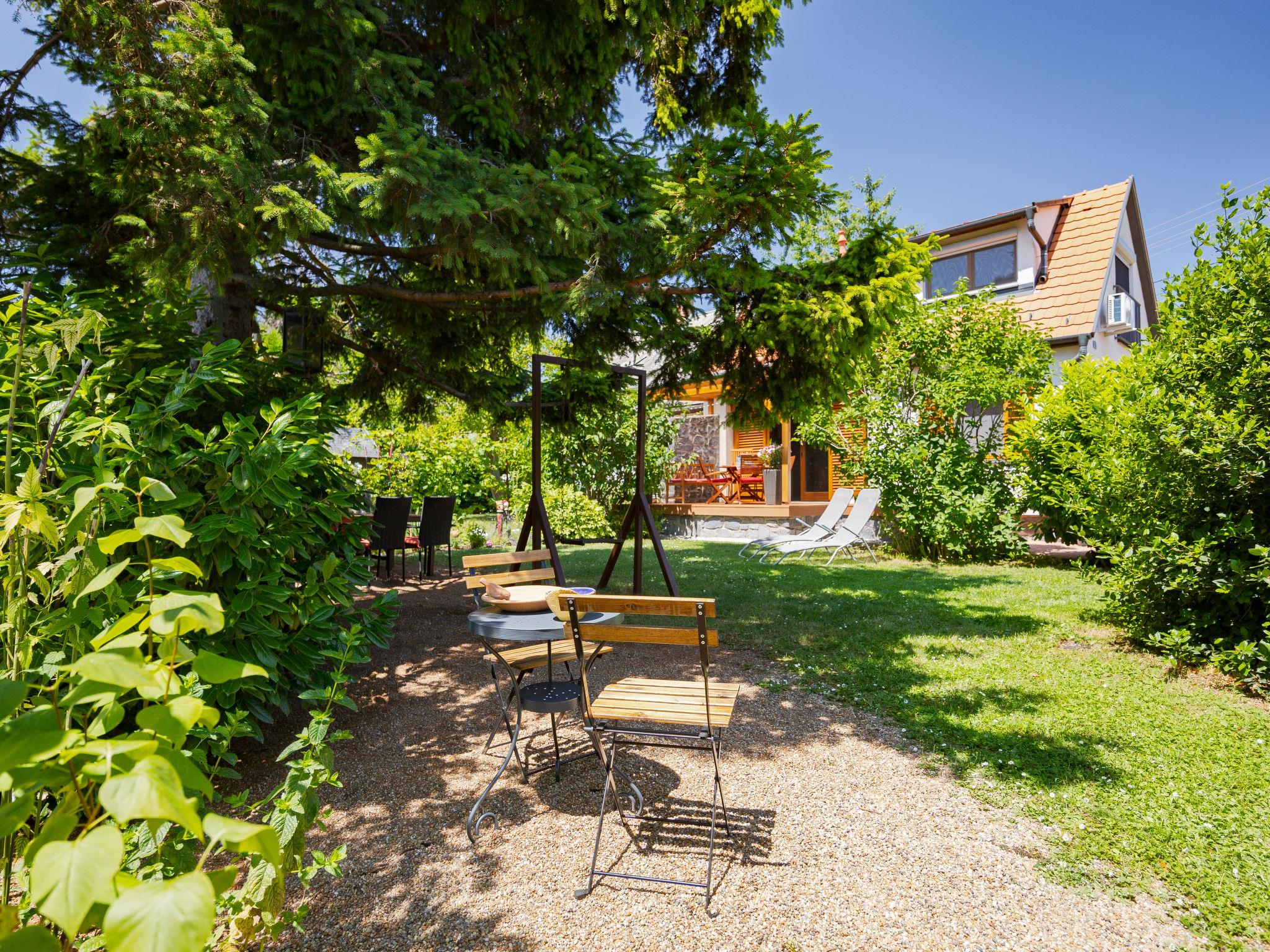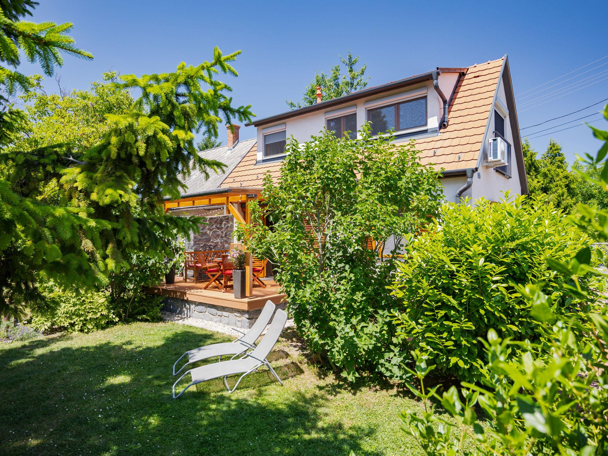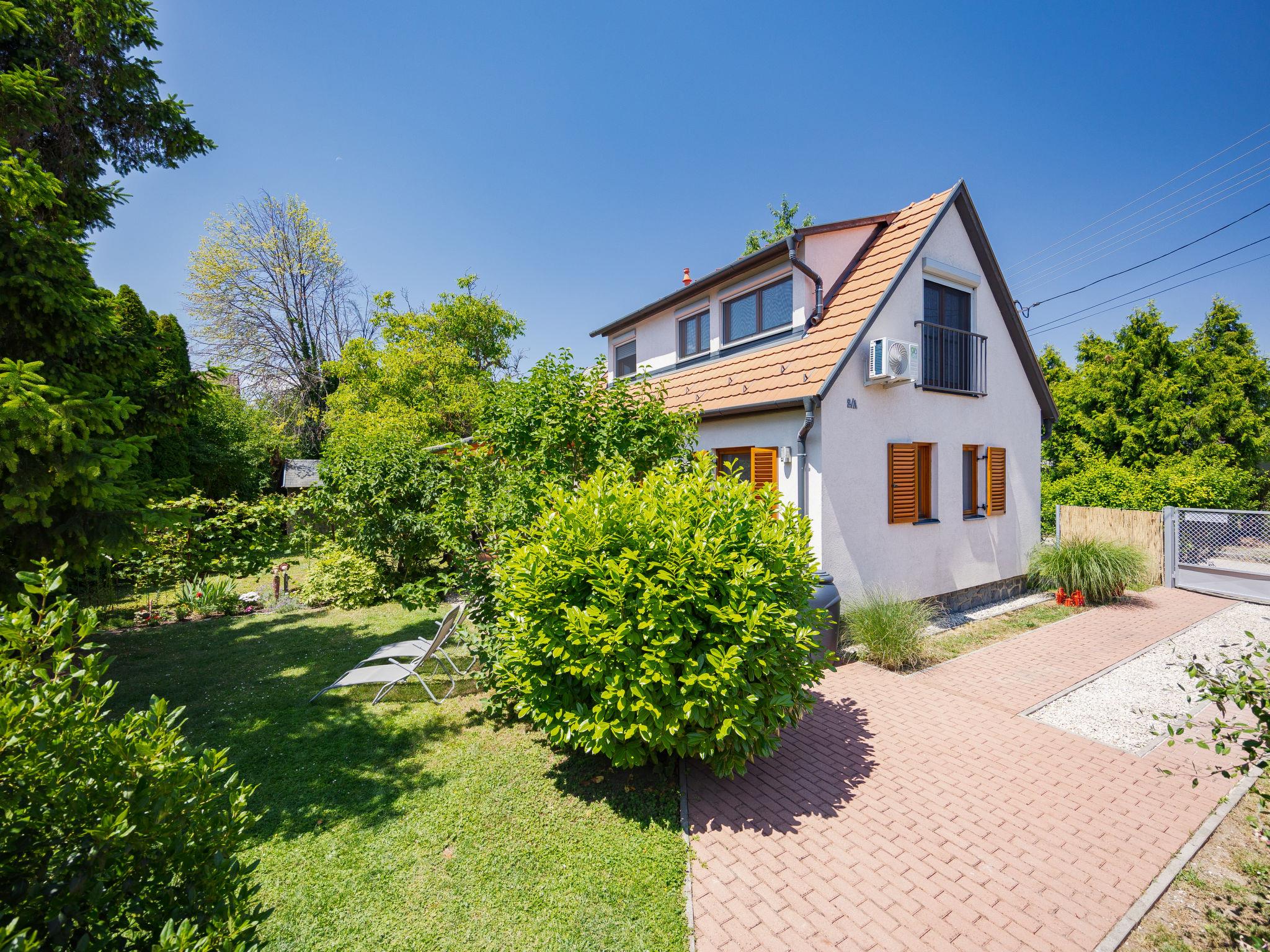 Balatonakali 15 km from Balatonfüred: Cosy, comfortable semi-detached house "Clarissa", 2 storeys. In the resort, 200 m from the lake, 1 km from the beach. Private: property (fenced), garden (not fenced) flowers and trees. (swing). In the house: WiFi, central heating system, air conditioning, washing machine. Parking on the premises. Supermarket 550 m, restaurant 280 m, bakery, café 550 m, bicycle rental 900 m, bus stop "Balatonakali, bejárati út" 400 m, railway station "Balatonakali-Dörgicse" 650 m, thermal baths "Hévíz" 52 km. Marina 400 m, golf course (18 hole) 6 km, tennis 4 km, indoor tennis centre 14 km, riding stable 15 km, sports centre 14 km, cycle lane 50 m, children's playground 350 m. Nearby attractions: Balatonudvari Golf Club 60 km, Tihany templom 13 km, Balatonfüred Annagora Aquapark 14 km, Badacsony 25 km, Folly Arboretum 20 km, Veszprém Zoo 40 km. Please note: baby equipment on request (included). The owner does not accept any youth groups. The keys‘ handover takes place by the agency Interhome in Balatonfüred, 15 km. Railway line closeby 100 m from the property.