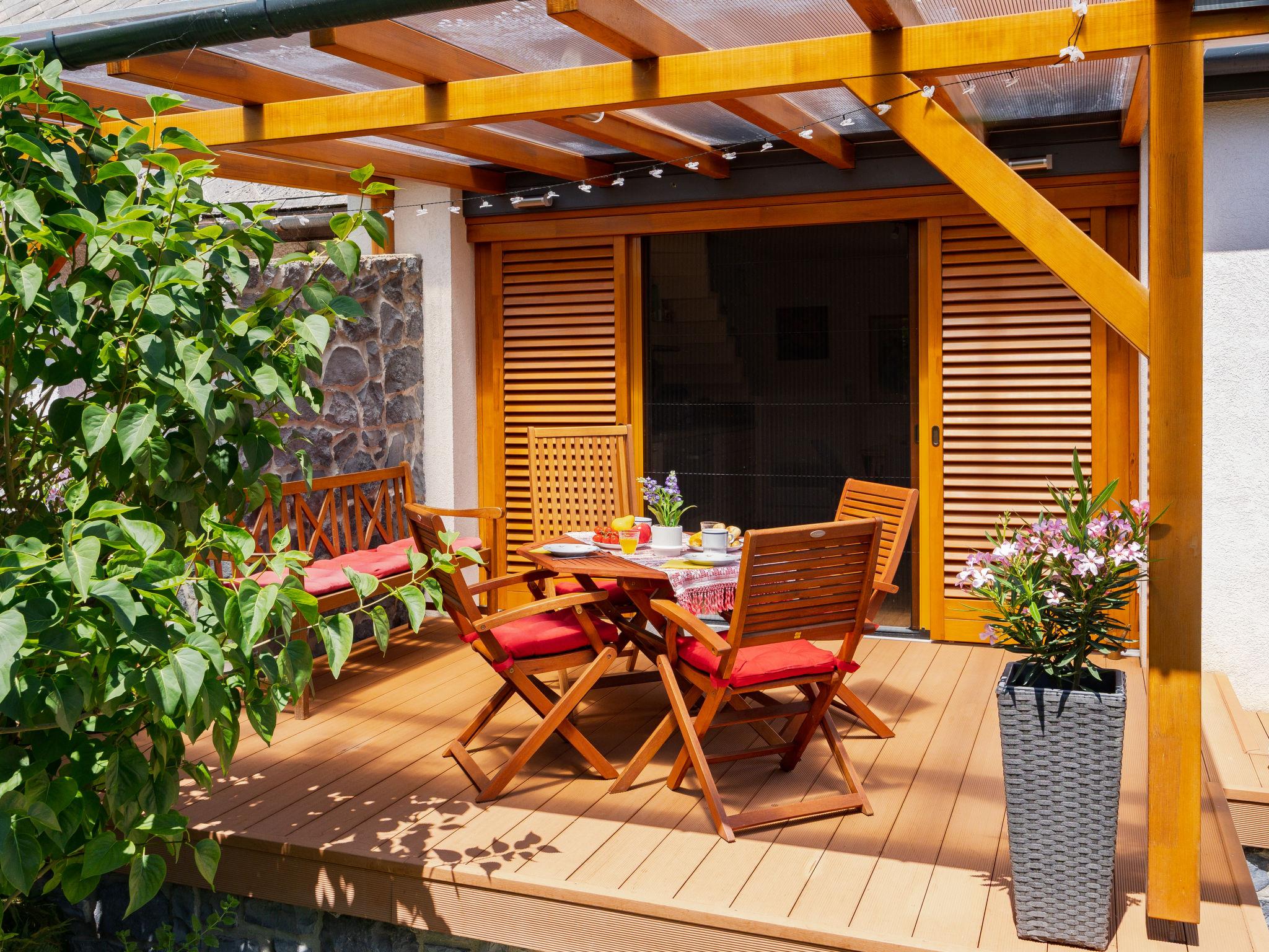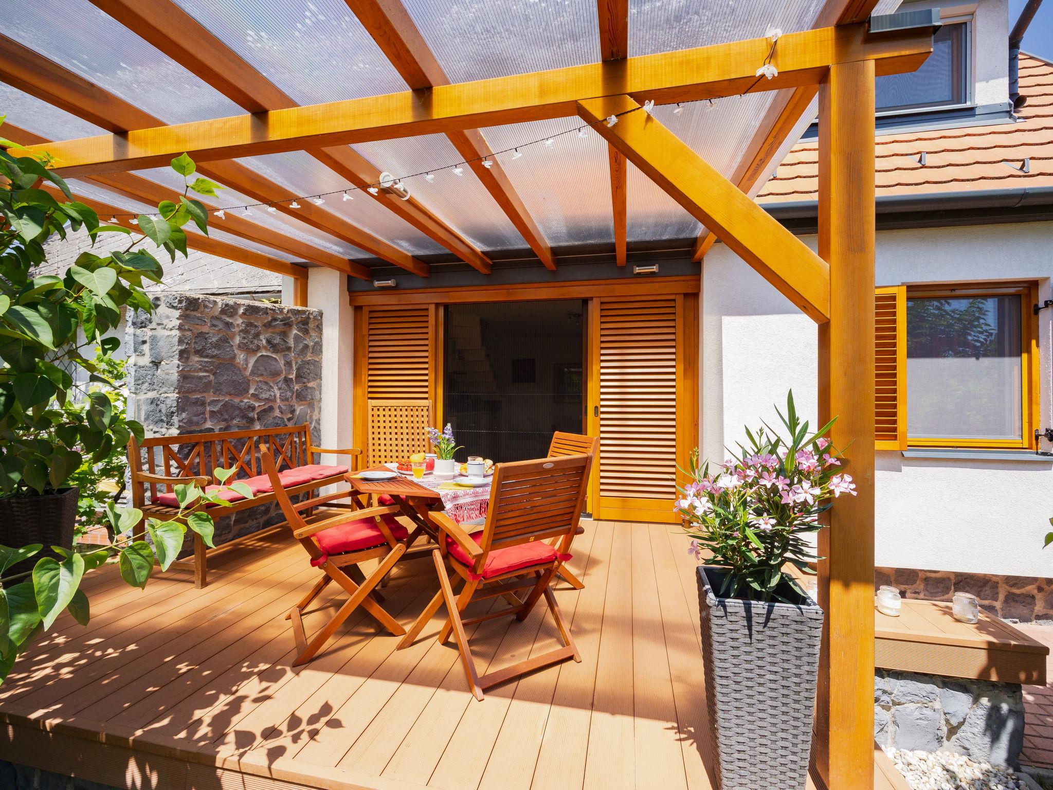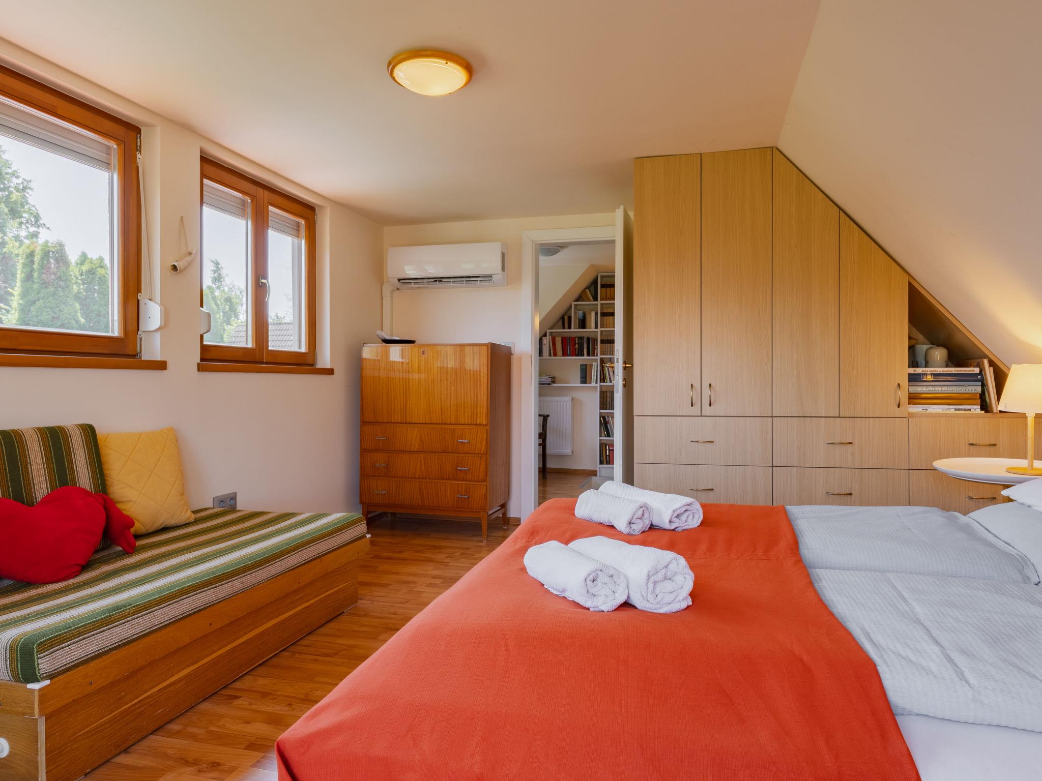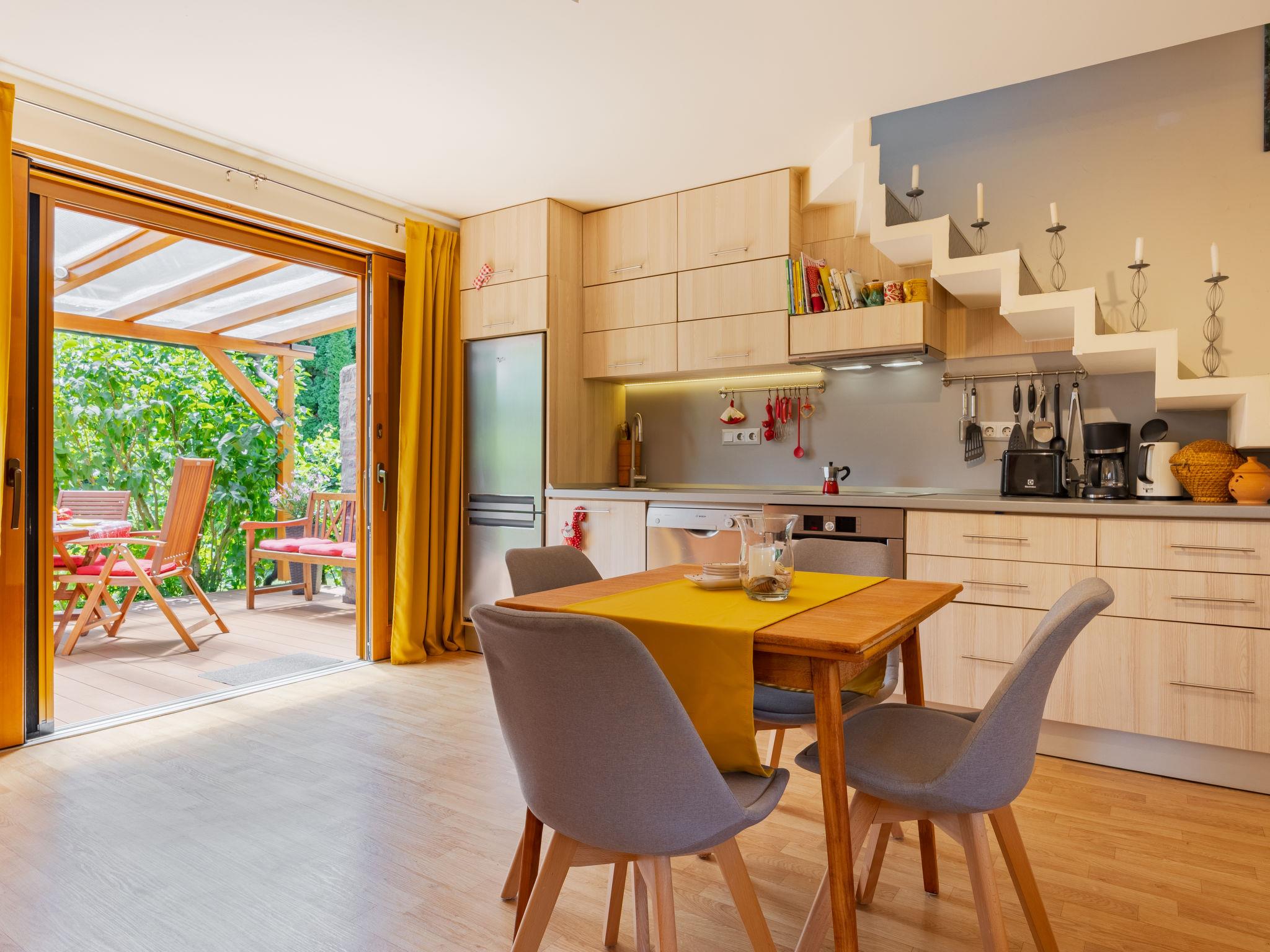Balatonakali 15 km from Balatonfüred: Cosy, comfortable semi-detached house "Clarissa", 2 storeys. In the resort, 200 m from the lake, 1 km from the beach. Private: property (fenced), garden (not fenced) flowers and trees. (swing). In the house: WiFi, central heating system, air conditioning, washing machine. Parking on the premises. Supermarket 550 m, restaurant 280 m, bakery, café 550 m, bicycle rental 900 m, bus stop "Balatonakali, bejárati út" 400 m, railway station "Balatonakali-Dörgicse" 650 m, thermal baths "Hévíz" 52 km. Marina 400 m, golf course (18 hole) 6 km, tennis 4 km, indoor tennis centre 14 km, riding stable 15 km, sports centre 14 km, cycle lane 50 m, children's playground 350 m. Nearby attractions: Balatonudvari Golf Club 60 km, Tihany templom 13 km, Balatonfüred Annagora Aquapark 14 km, Badacsony 25 km, Folly Arboretum 20 km, Veszprém Zoo 40 km. Please note: baby equipment on request (included). The owner does not accept any youth groups. The keys‘ handover takes place by the agency Interhome in Balatonfüred, 15 km. Railway line closeby 100 m from the property.