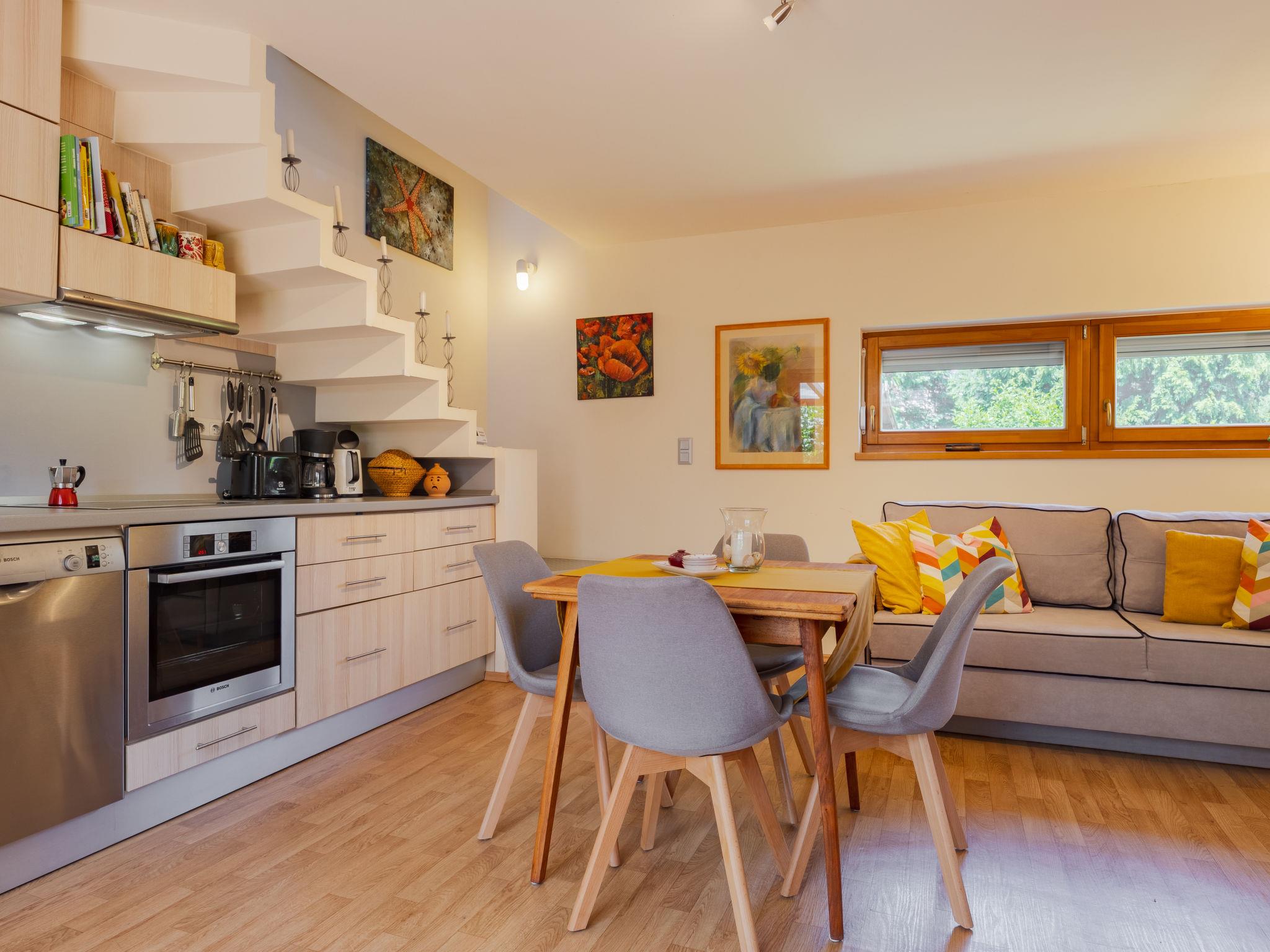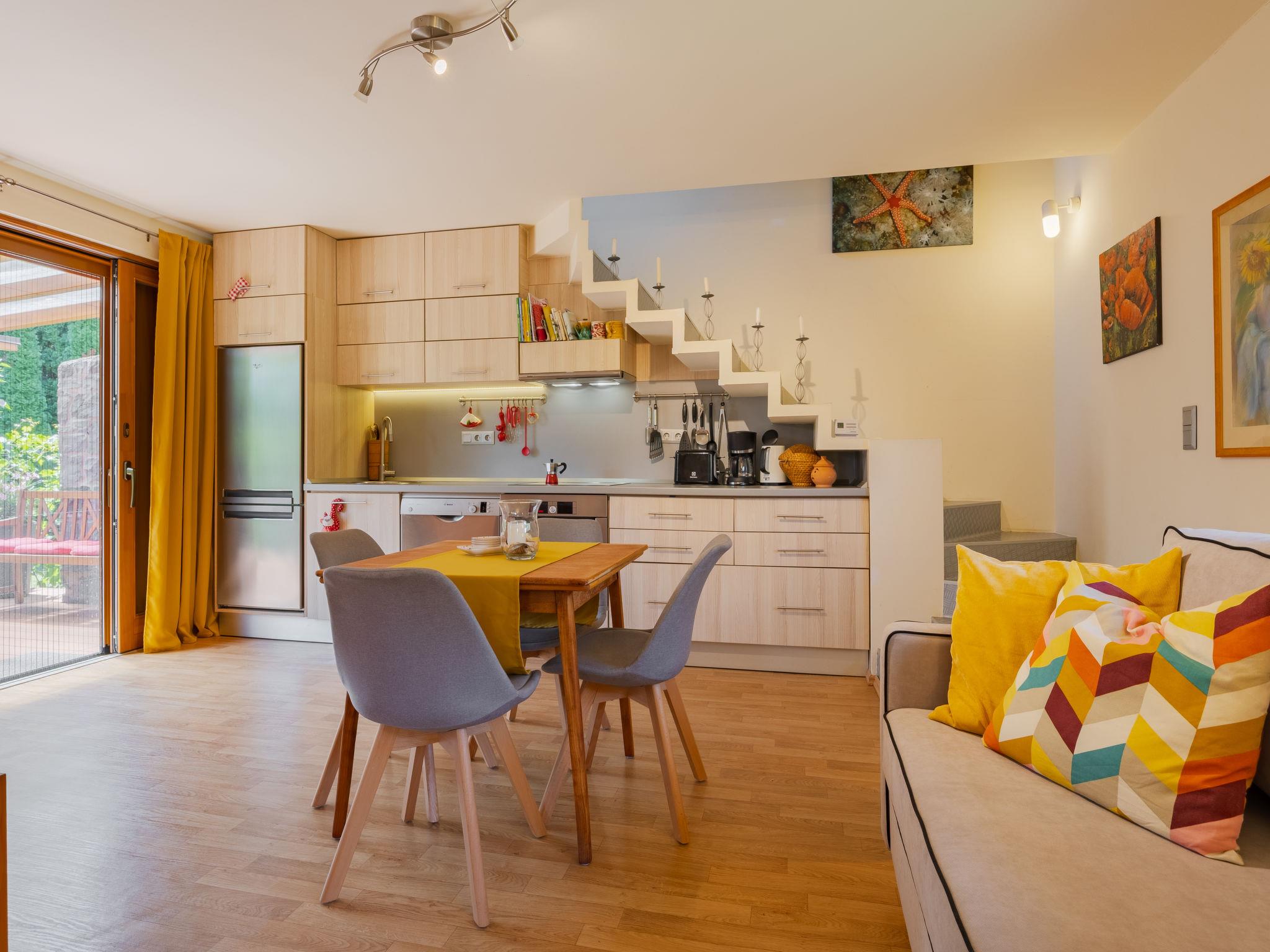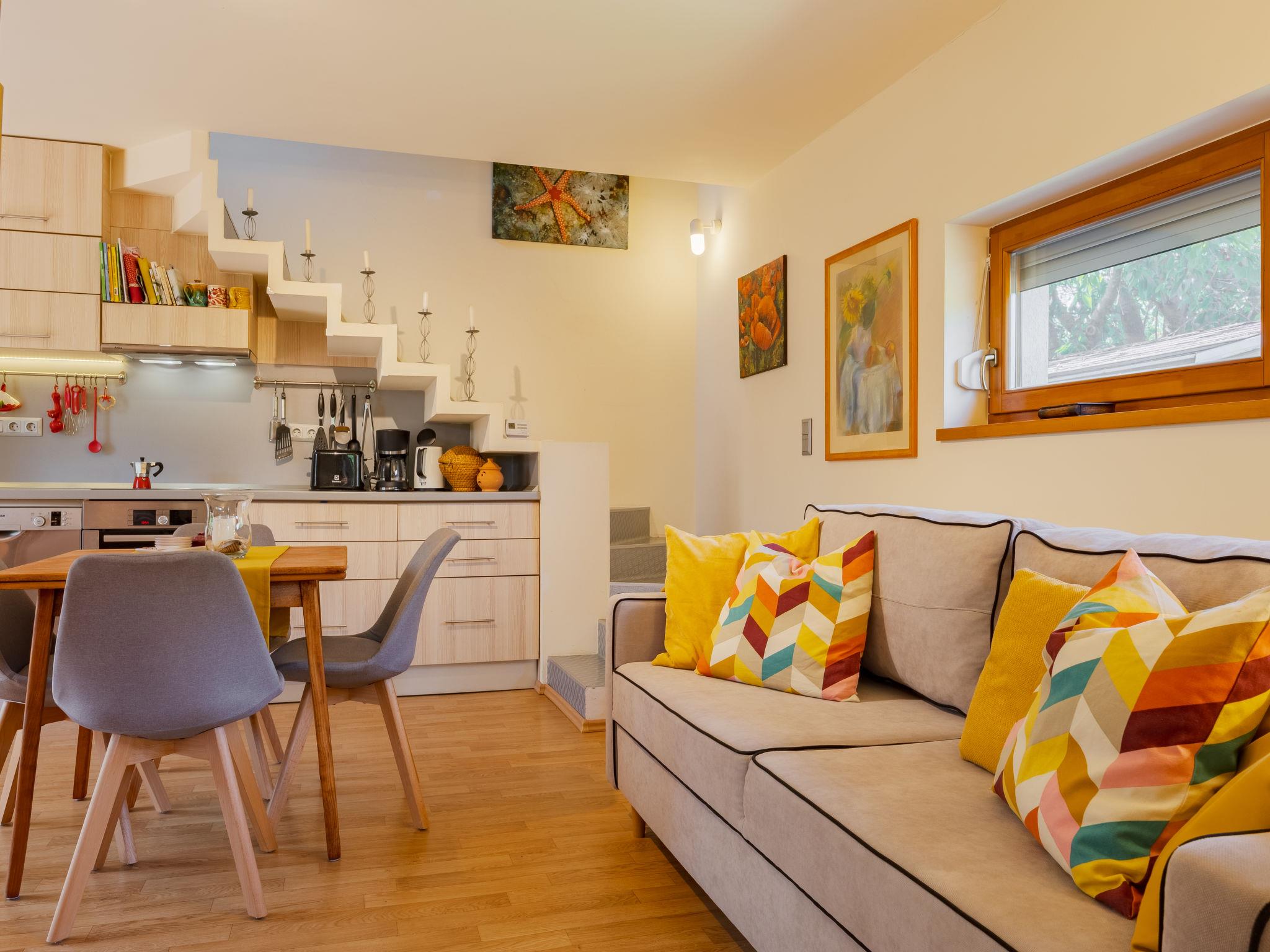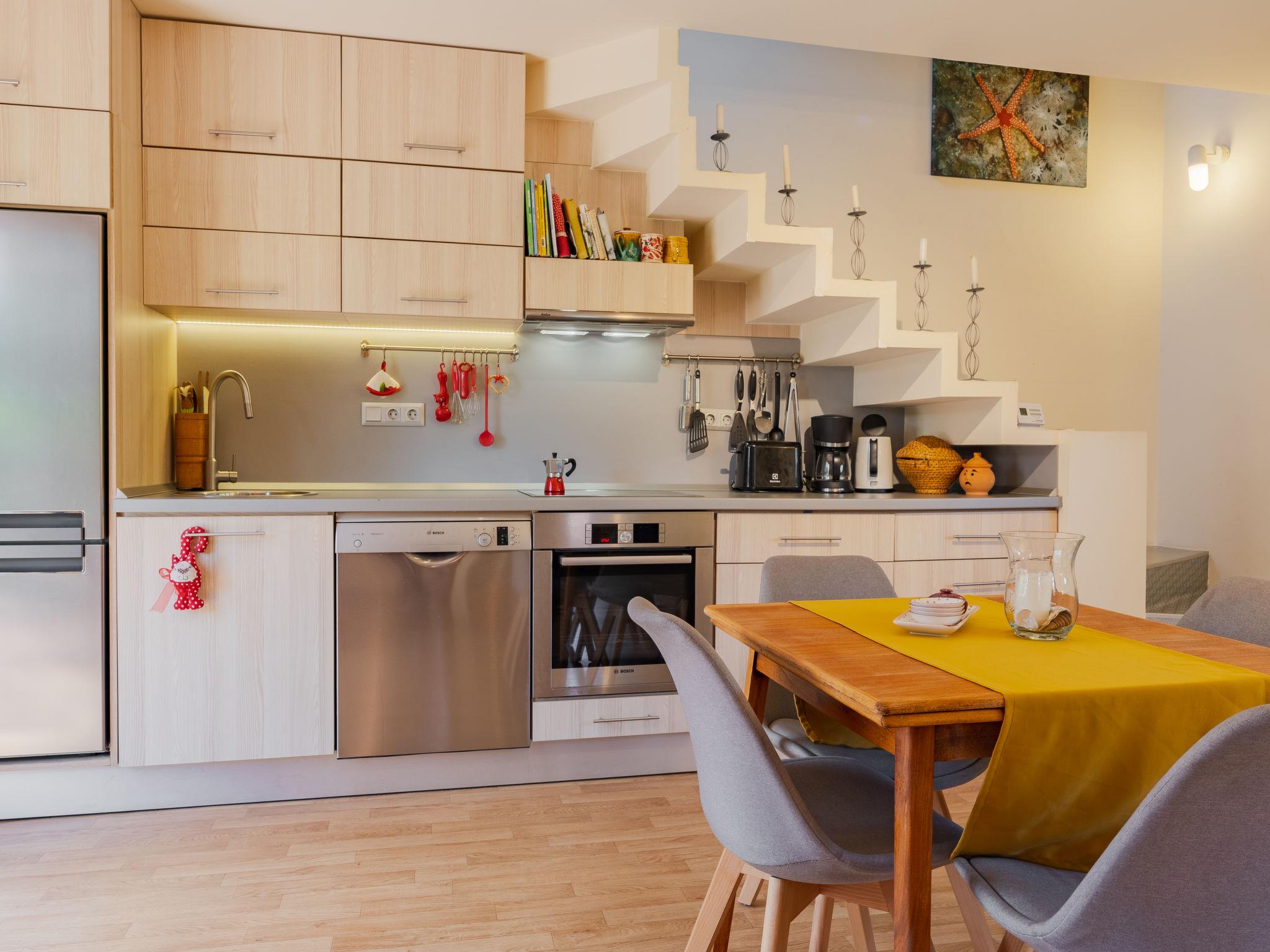 3-room semi-detached house on 2 levels, south facing position. Object suitable for 5 adults + 1 child. Modern and cosy furnishings: open living/dining room with 1 sofabed and dining table. Exit to the terrace. 1 small double bedroom with 1 french bed (160 cm, length 200 cm). (oven, dishwasher, 4 ceramic glass hob hotplates, toaster, kettle, freezer, electric coffee machine). Shower/WC. Heating. Upper floor: 1 double bedroom with 1 bed (80 cm, length 180 cm), 1 french bed (160 cm, length 200 cm), air conditioning. Shower/WC. Terrace, south-east facing position. Terrace furniture, barbecue (portable), deck chairs (2). Facilities: washing machine, mosquito net. Internet (WiFi). Parking (fenced). Please note: suitable for families. Non-smoking house.