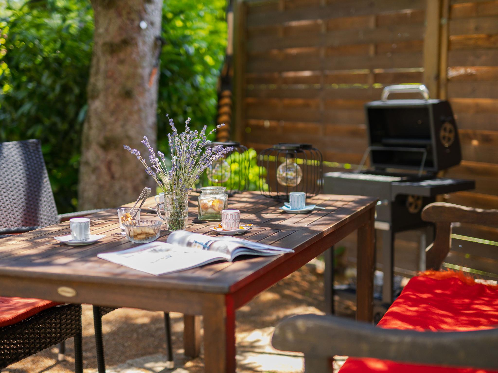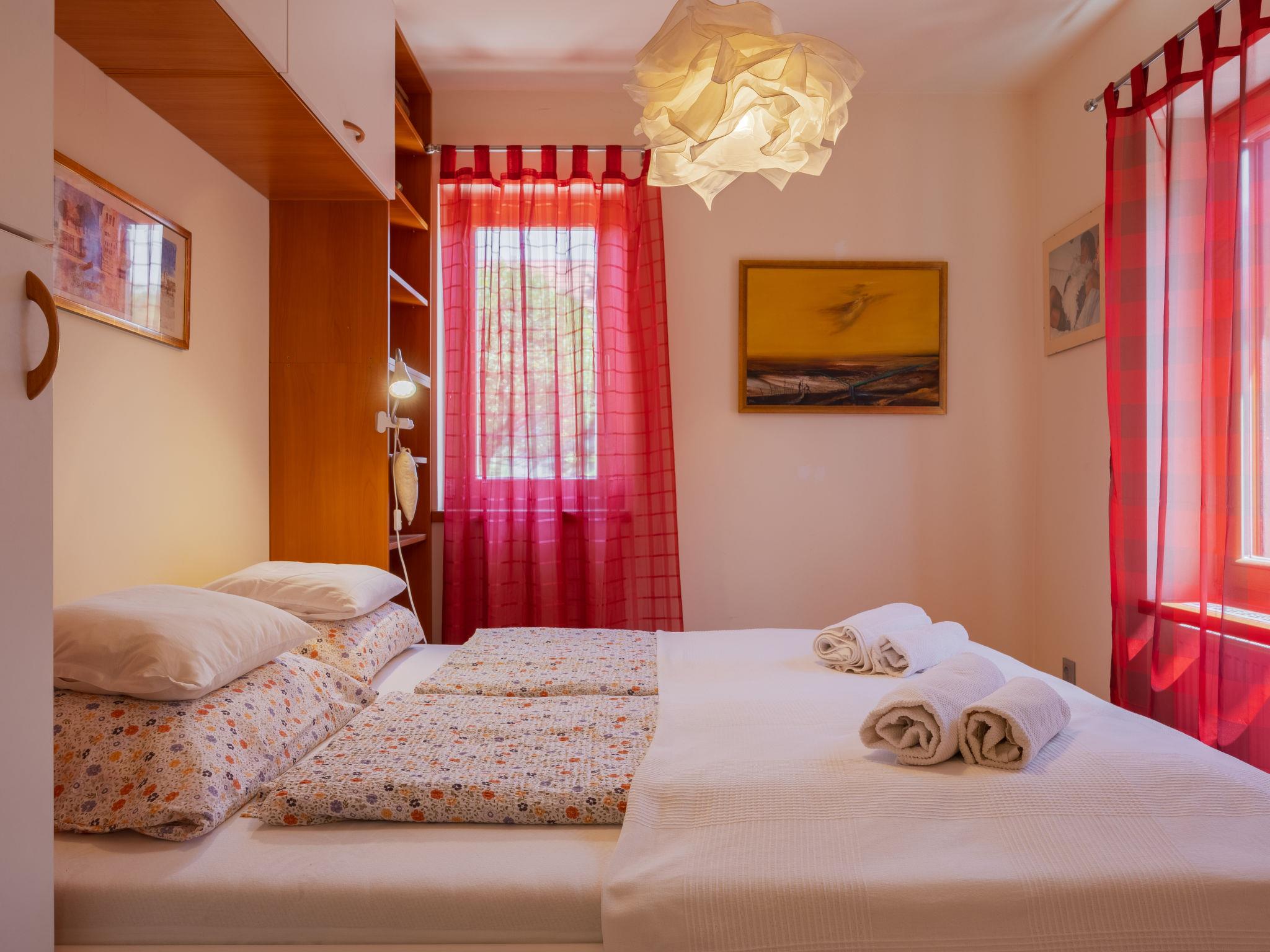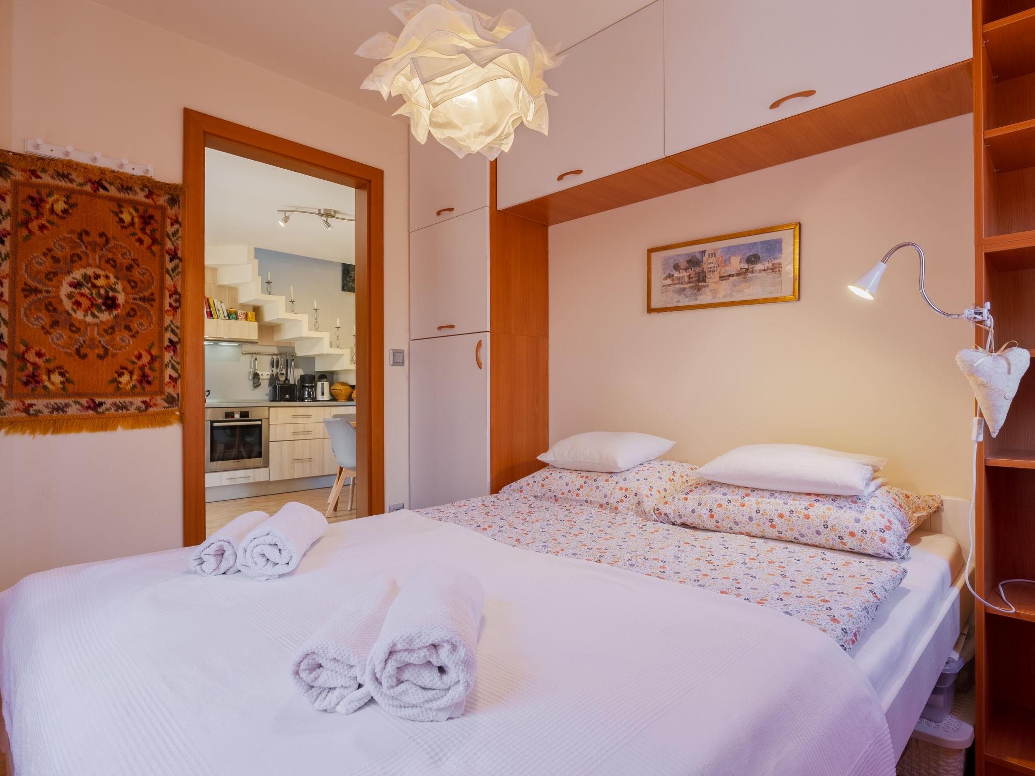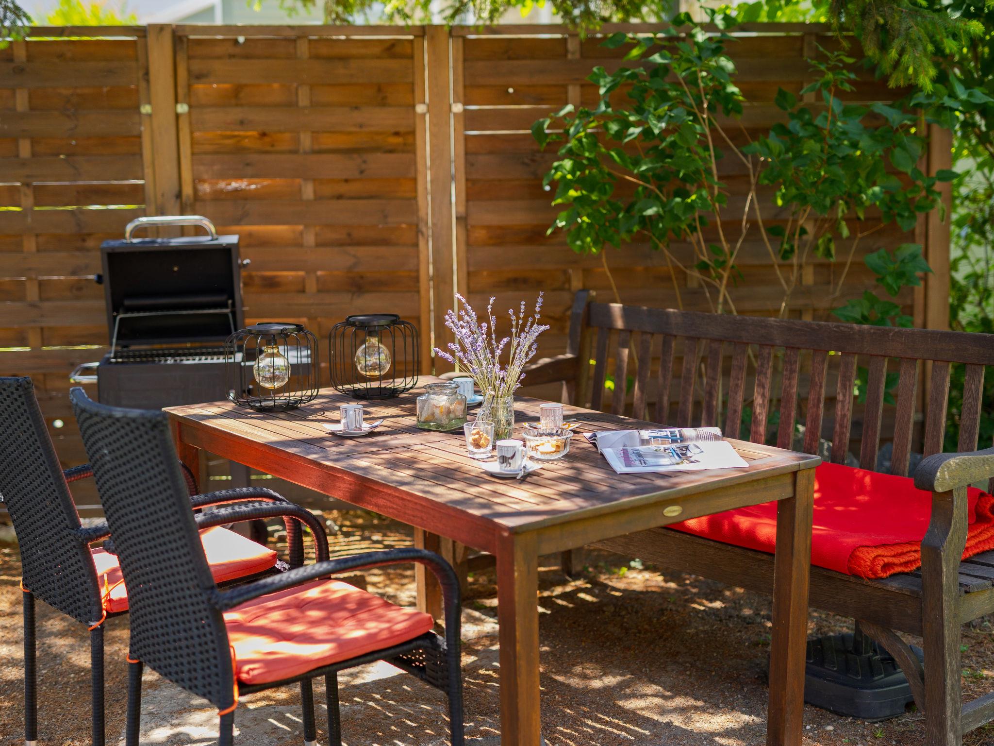 3-room semi-detached house on 2 levels, south facing position. Object suitable for 5 adults + 1 child. Modern and cosy furnishings: open living/dining room with 1 sofabed and dining table. Exit to the terrace. 1 small double bedroom with 1 french bed (160 cm, length 200 cm). (oven, dishwasher, 4 ceramic glass hob hotplates, toaster, kettle, freezer, electric coffee machine). Shower/WC. Heating. Upper floor: 1 double bedroom with 1 bed (80 cm, length 180 cm), 1 french bed (160 cm, length 200 cm), air conditioning. Shower/WC. Terrace, south-east facing position. Terrace furniture, barbecue (portable), deck chairs (2). Facilities: washing machine, mosquito net. Internet (WiFi). Parking (fenced). Please note: suitable for families. Non-smoking house.