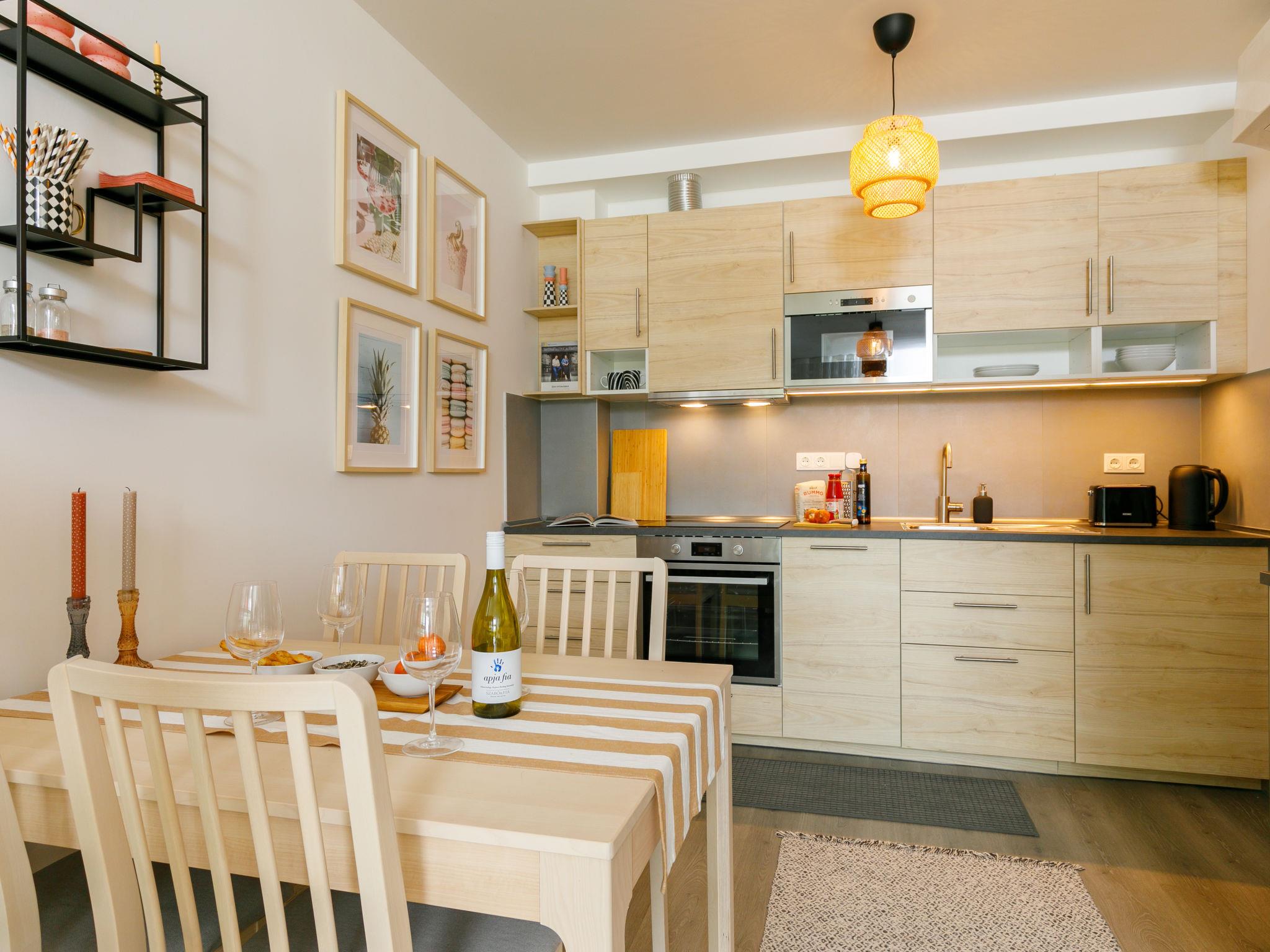 "Mistral", 2-room apartment on 1st floor, east facing position. Modern and stylish furnishings: living/dining room with 1 double sofabed, dining table, digital TV, flat screen, air conditioning and electric shutters. Exit to the balcony. 1 double bedroom with 1 french bed (160 cm, length 200 cm), electric shutters. Exit to the balcony. Open kitchen (oven, dishwasher, 4 ceramic glass hob hotplates, toaster, kettle, microwave, freezer, electric coffee machine). Bath/WC. Heating (extra). Balcony 10 m2, east facing position. Balcony furniture, covered balcony, sitting area. Facilities: washing machine, children's high chair, baby cot (extra). Internet (WiFi). Parking space n 8. Please note: smoke alarm.