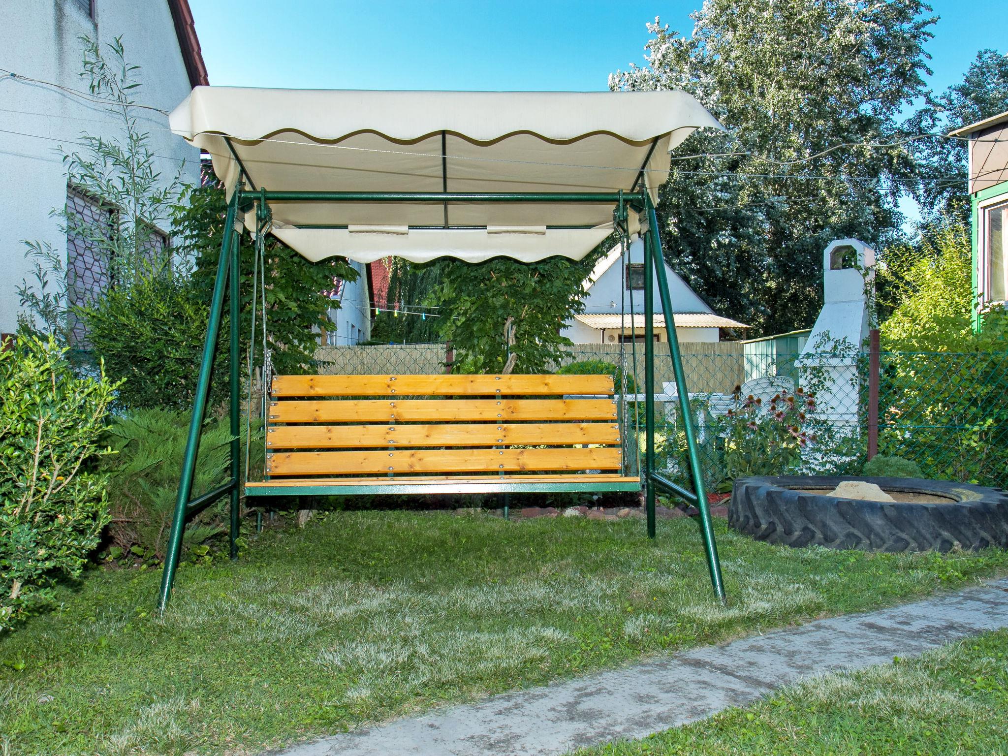 Balatonfenyves: Cosy semi-detached house "Gerle", 2 storeys. In the resort, 100 m from the lake. Private: property 400 m2, garden (fenced) with lawn, lawn for sunbathing. Grocery 400 m, restaurant, grass beach 150 m.
