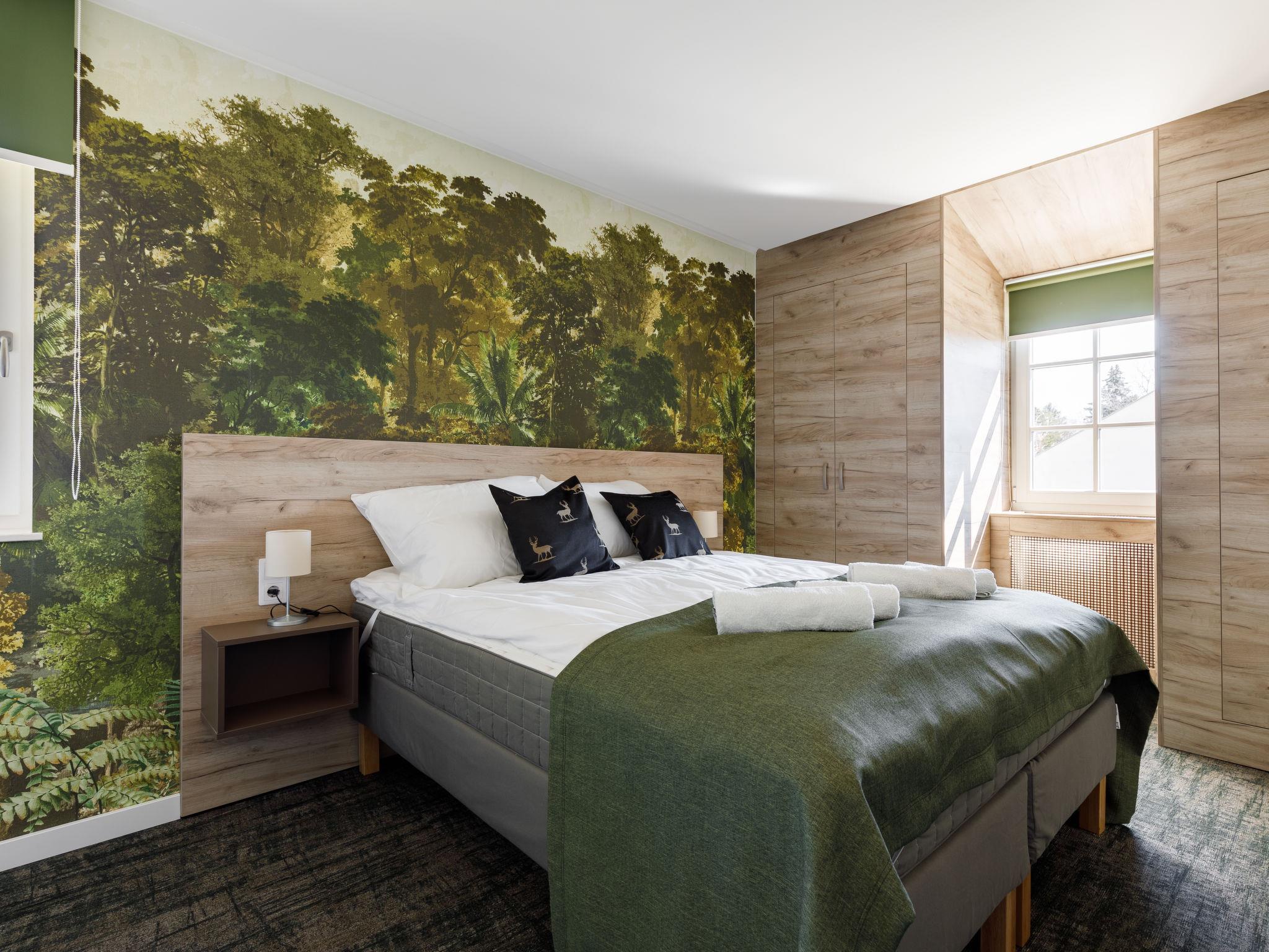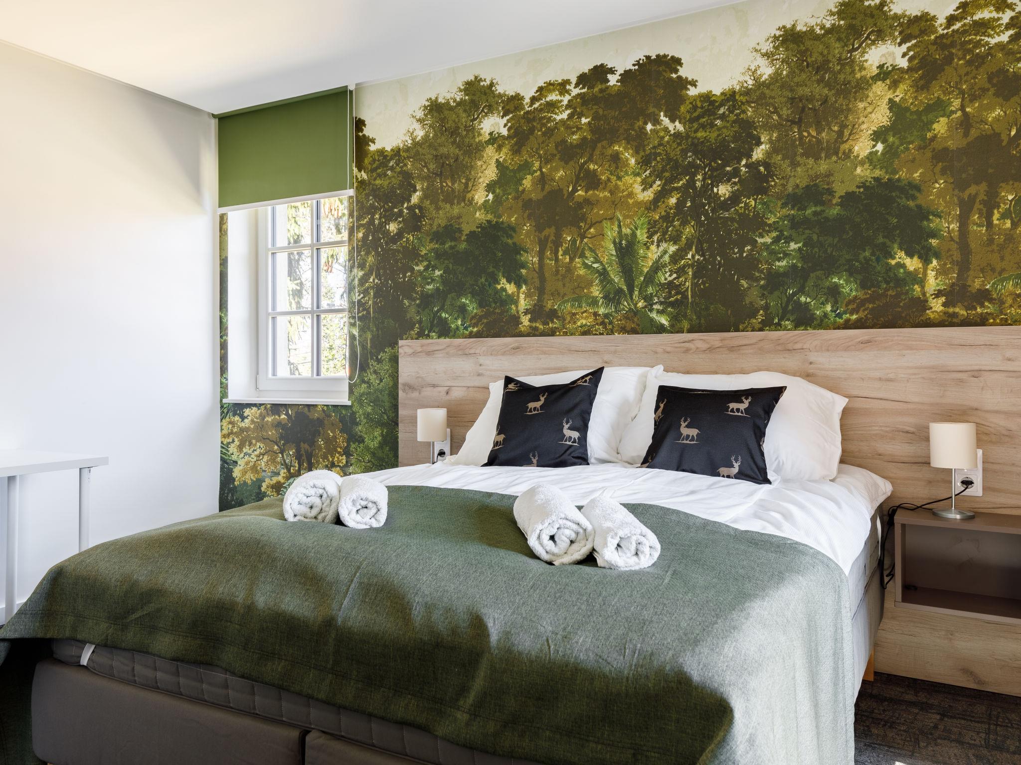 "Park 5", apartment on the upper floor. Beautiful and modern furnishings: open living/dining room with 2 sofabeds and cable TV (flat screen). 1 double bedroom with 1 french bed (160 cm, length 200 cm). Small, open kitchen (2 ceramic glass hob hotplates, microwave, electric coffee machine). Shower/WC. Floor heating. Solar power. North-west facing position. Facilities: children's high chair, baby cot (extra), hair dryer. Internet (WiFi). Please note: apartment courtyard side. Type of coffee machine: Nespresso.