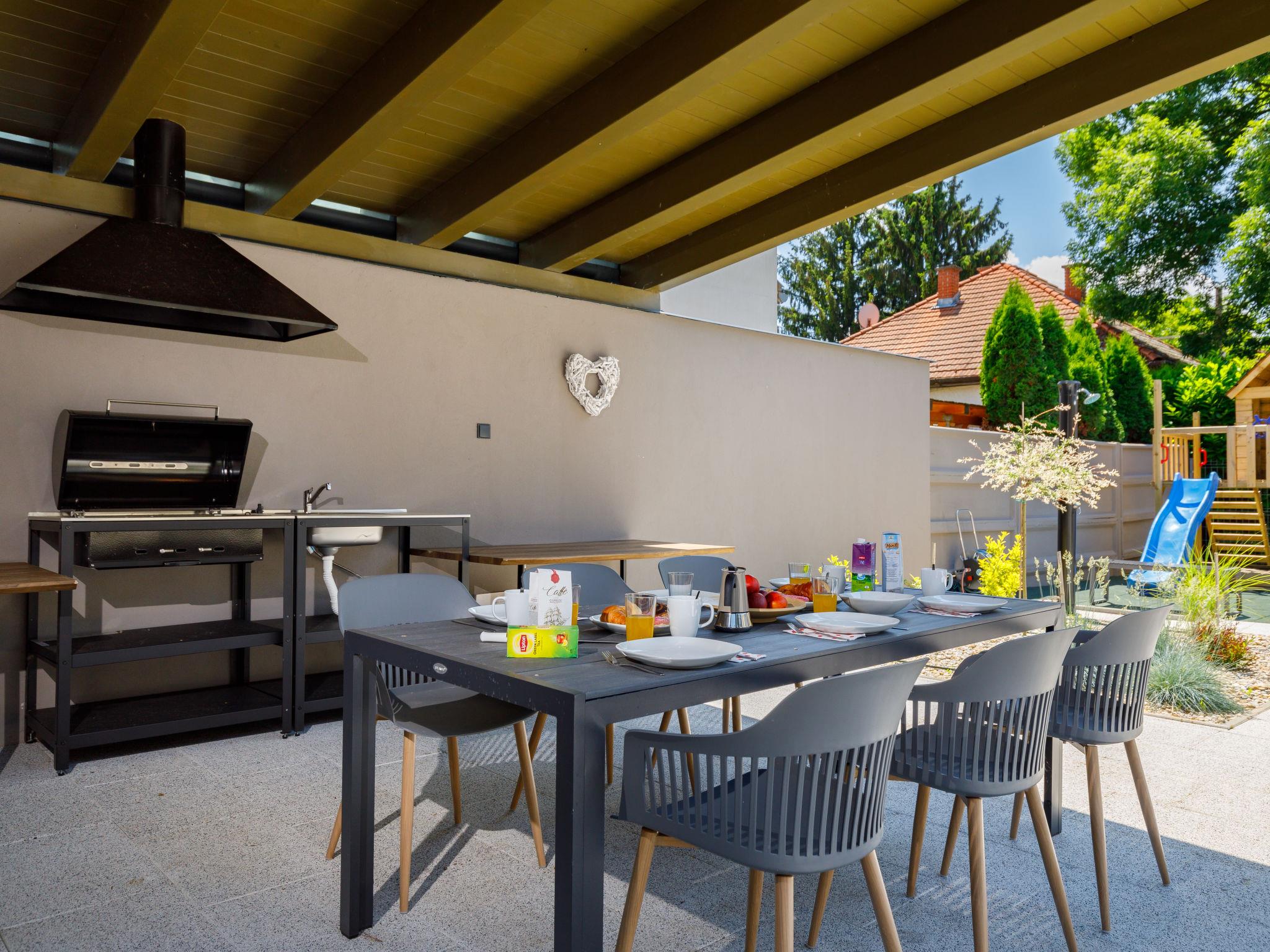 Balatonszárszó 5 km from Balatonföldvár: Modern, beautiful apartment house, built in 2023. 5 apartments in the residence. Excellent location: right in the centre but still quiet, 290 m from the lake, 350 m from the beach. For shared use: property (fenced). Outdoor shower, table tennis, pergola, garden furniture, barbecue, children's playground (slide, sandbox). In the house: WiFi, table tennis, billiard table, table football, sun terrace, central heating system, air conditioning, washing machine, tumble dryer. Breakfast on request (extra). Parking at the house. Grocery 90 m, supermarket 7 km, restaurant, café 140 m, bicycle rental 150 m, bus stop 850 m, railway station, 200 m, thermal baths "Csiszta" 36 km. Surf school 4 km, sailing school 1 km, tennis 500 m, riding stable 9 km, children's playground 600 m. Nearby attractions: Siófok Bella Zoo 24 km, Tihany 12 km, Siófok Theme Pak 24 km, Festetics Castle 57 km, Hévíz 61 m. The common area has a kitchen with a dishwasher, 4 ceramic hobs and an oven.