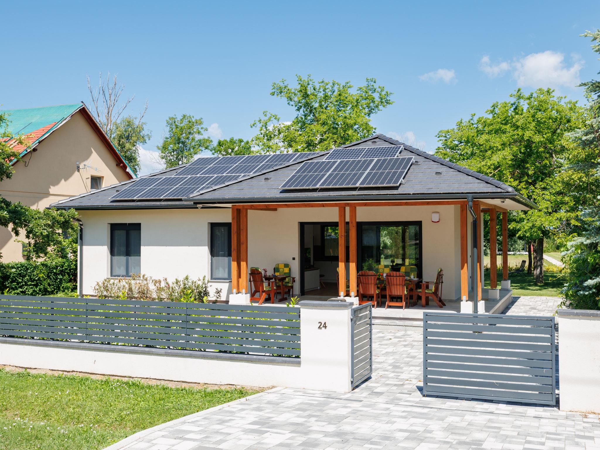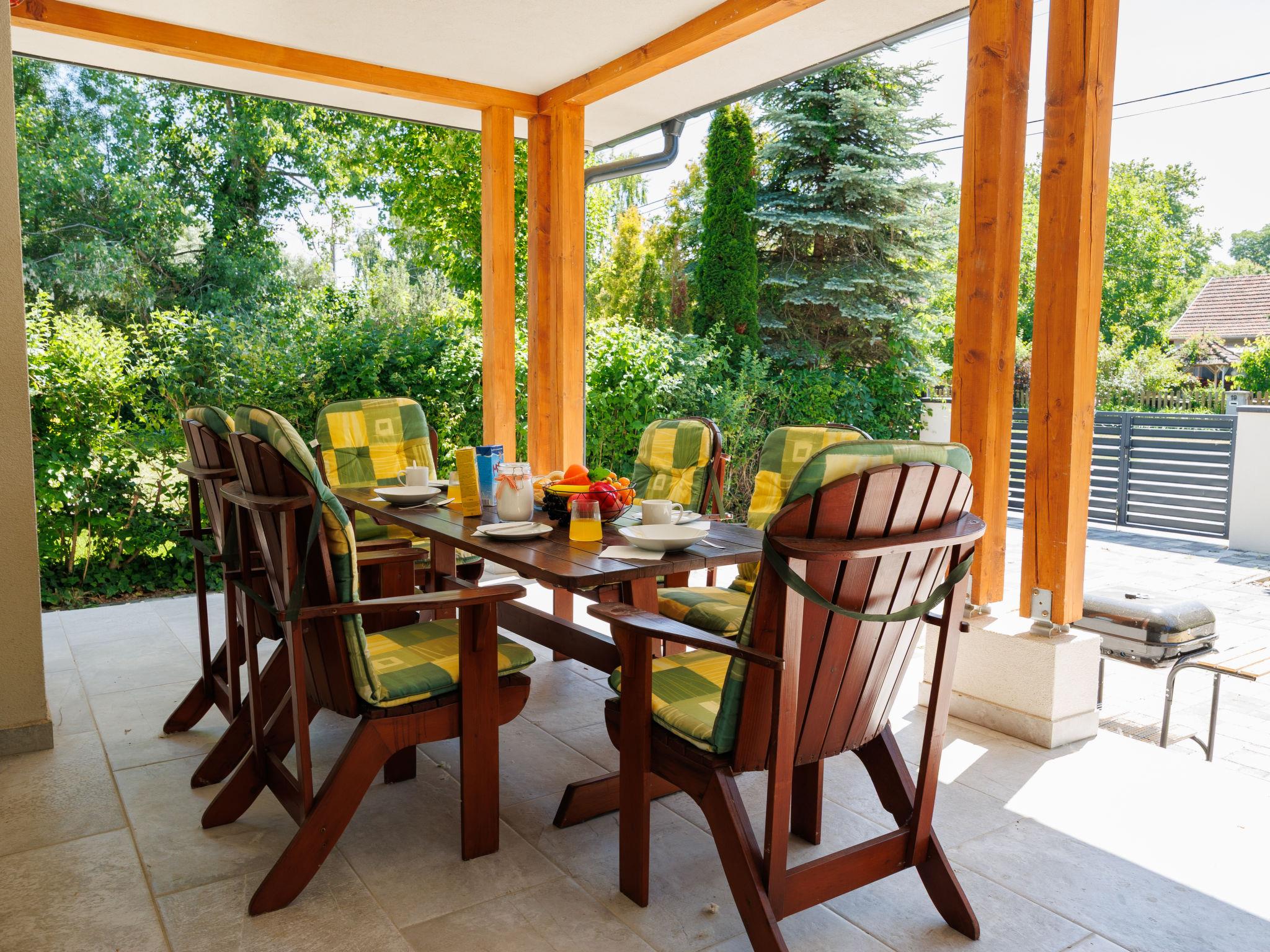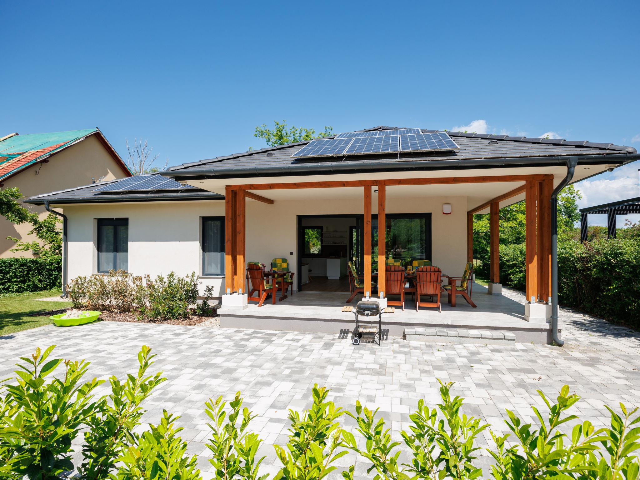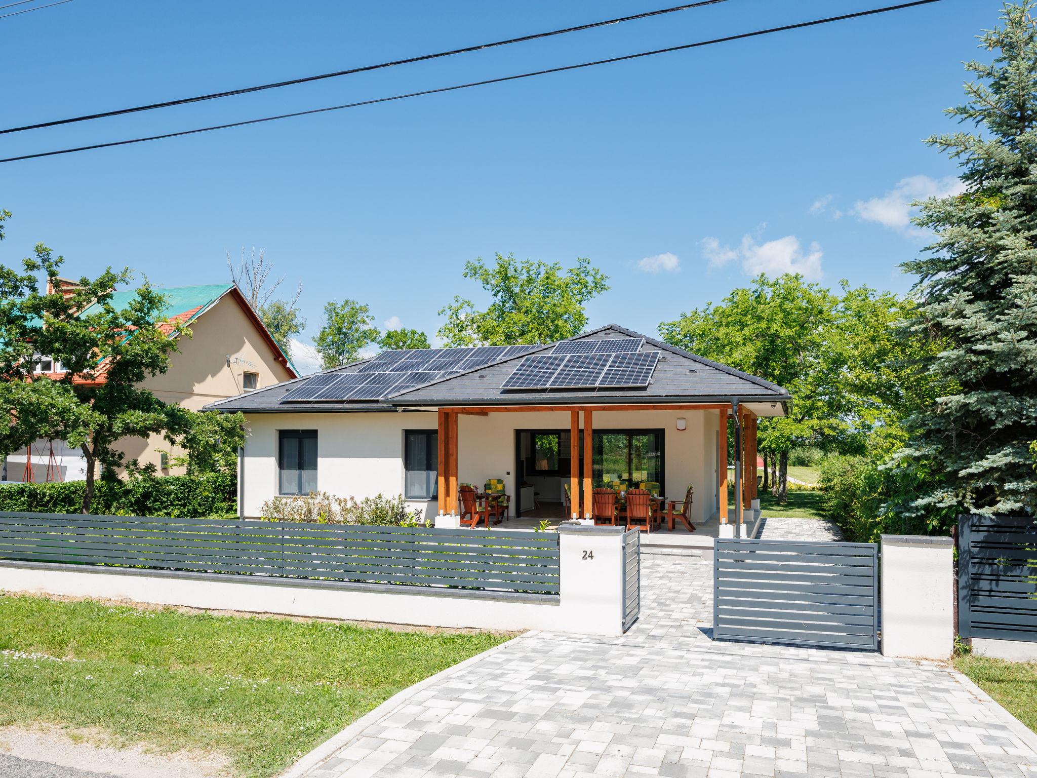 Balatonszárszó 5 km from Balatonföldvár: Modern, comfortable house "Daniel", built in 2024. In a sunny position residential area (villas), 80 m from the lake, 500 m from the beach. For shared use: (sandbox). Private: property (fenced), large, well-kept garden with lawn and trees. Badminton, barbecue (sandbox). In the house: WiFi, central heating system, air conditioning, burglar alarm system. Parking (for 2 cars) on the premises. Grocery 1 km, restaurant, café 750 m, bicycle rental 1 km, railway station 950 m, grass beach 400 m, thermal baths "Igal" 47 km. Tennis 650 m, riding stable 14 km, cycle lane 10 m, children's playground 1 km. Nearby attractions: Kis-Balaton Visitor Center 60 km, Turtle Park 7 km, Balatonlelle Giant Wheel 12 km, Zamárdi Adventure Park 26 km, Hévíz Thermal Bath 68 km, Bella Zoo Siófok 39 km.