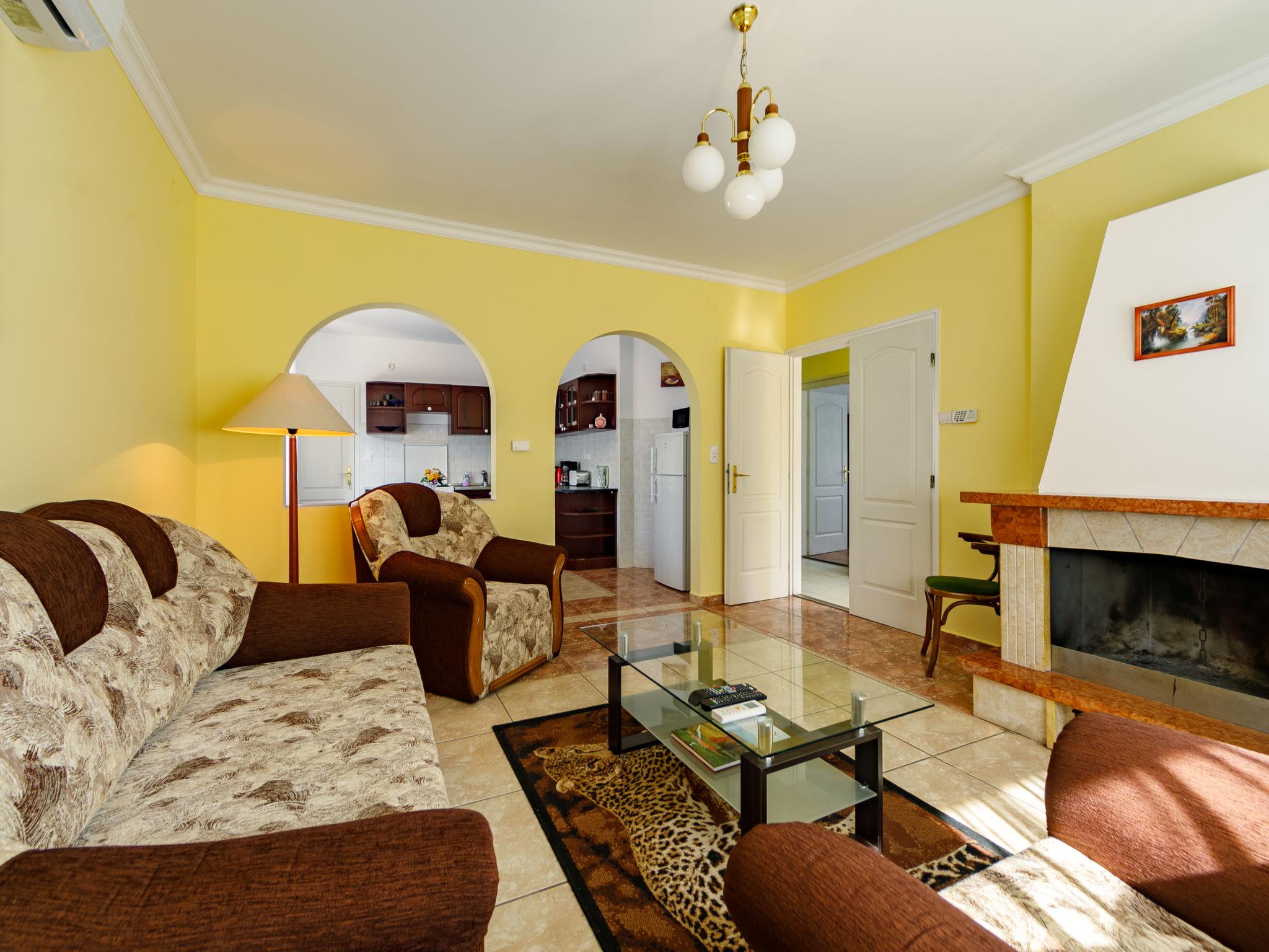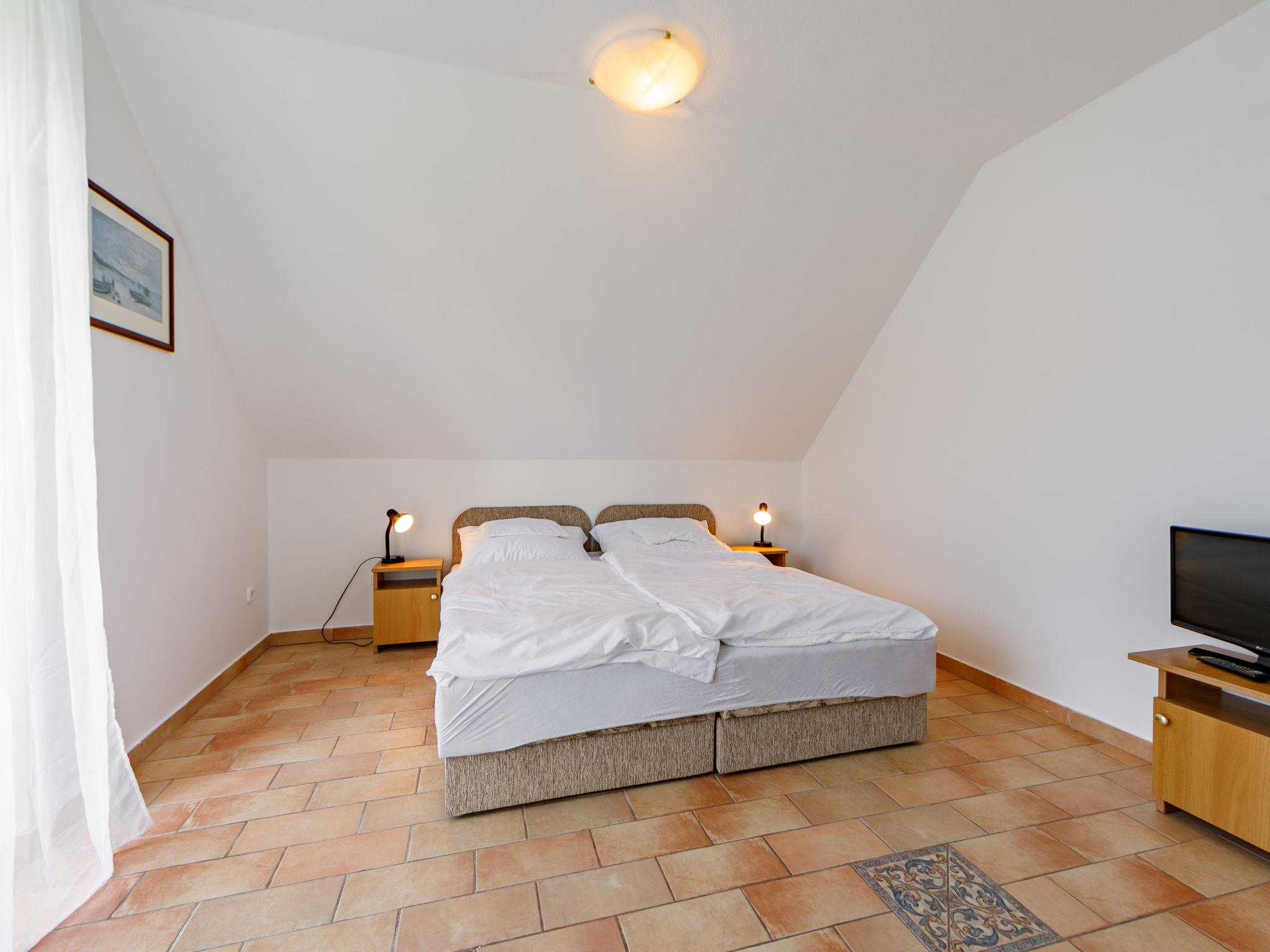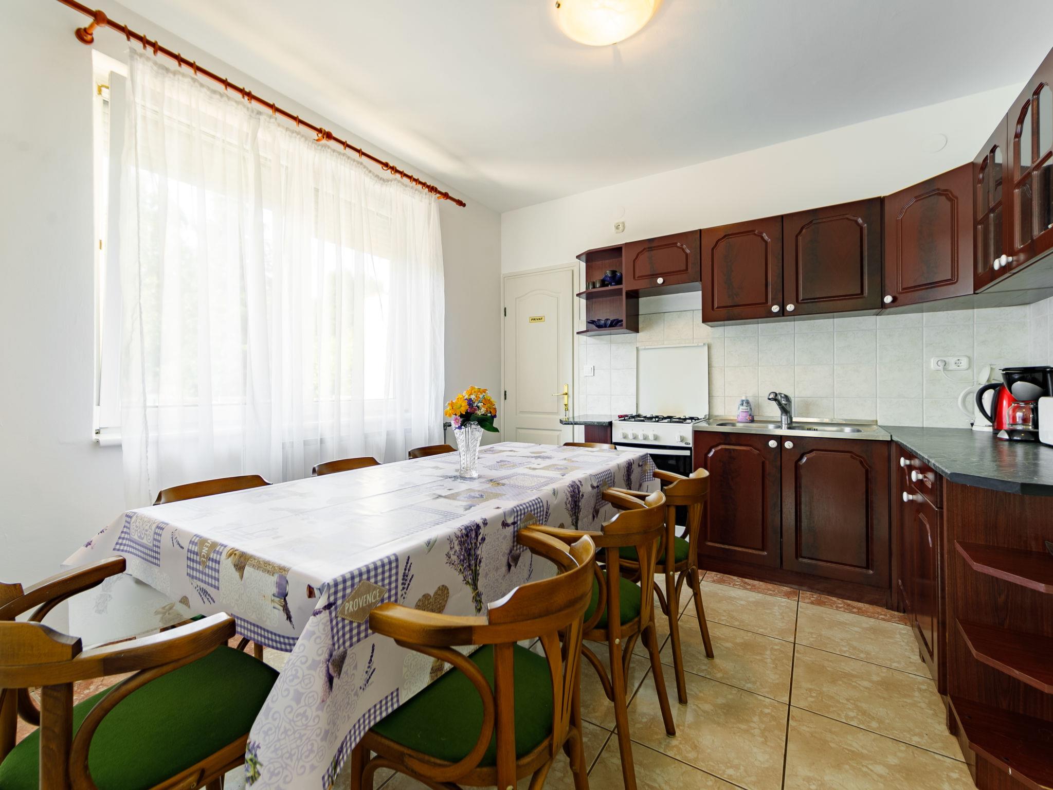 "Edina", 5-room house 160 m2 on 2 levels. Bright, practical furnishings: living room with open-hearth fireplace, satellite TV, DVD and air conditioning. 1 room with 2 beds. Open kitchen (oven, 4 gas rings, toaster, kettle, microwave, electric coffee machine) with dining table. Bathroom, sep. WC. No heating option. Top floor: 3 rooms with sloping ceilings, each room with 2 beds, kitchen corner, shower/WC and satellite TV. Exit to the balcony. Heating not available in all rooms. 3 balconies, 2 terraces. Terrace furniture, balcony furniture, deck chairs (3). Facilities: washing machine, children's high chair, baby cot (extra). Internet (WiFi, free). Please note: non-smoking house. Maximum 1 pet/ dog allowed. MA19009120