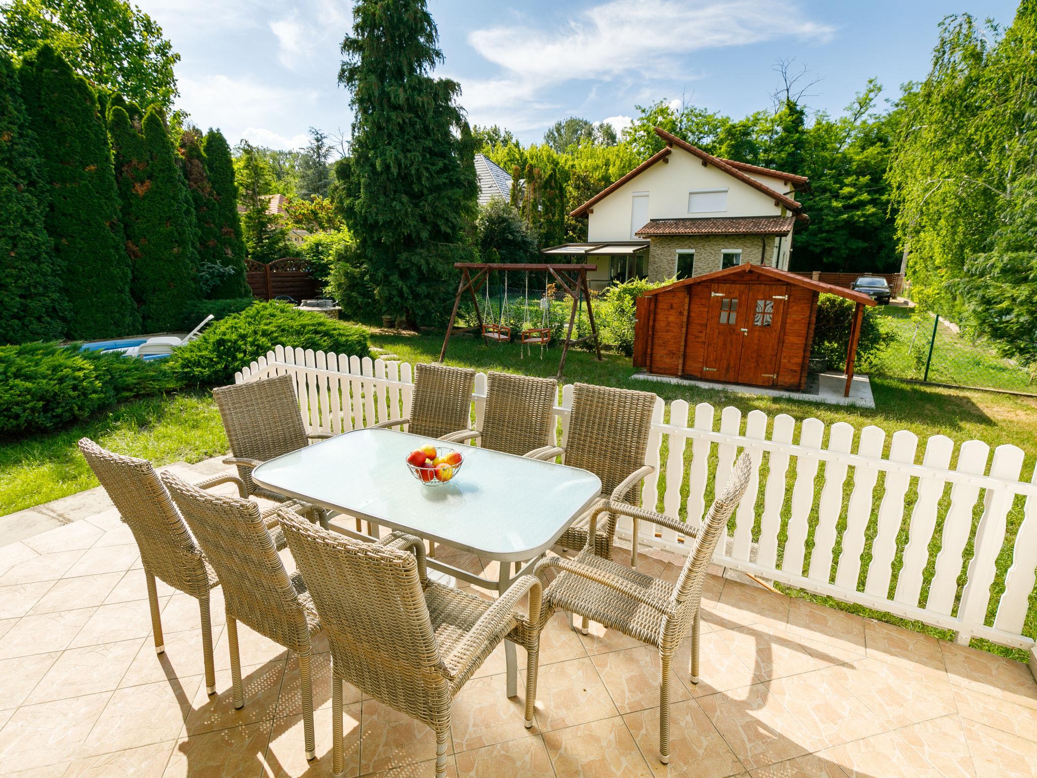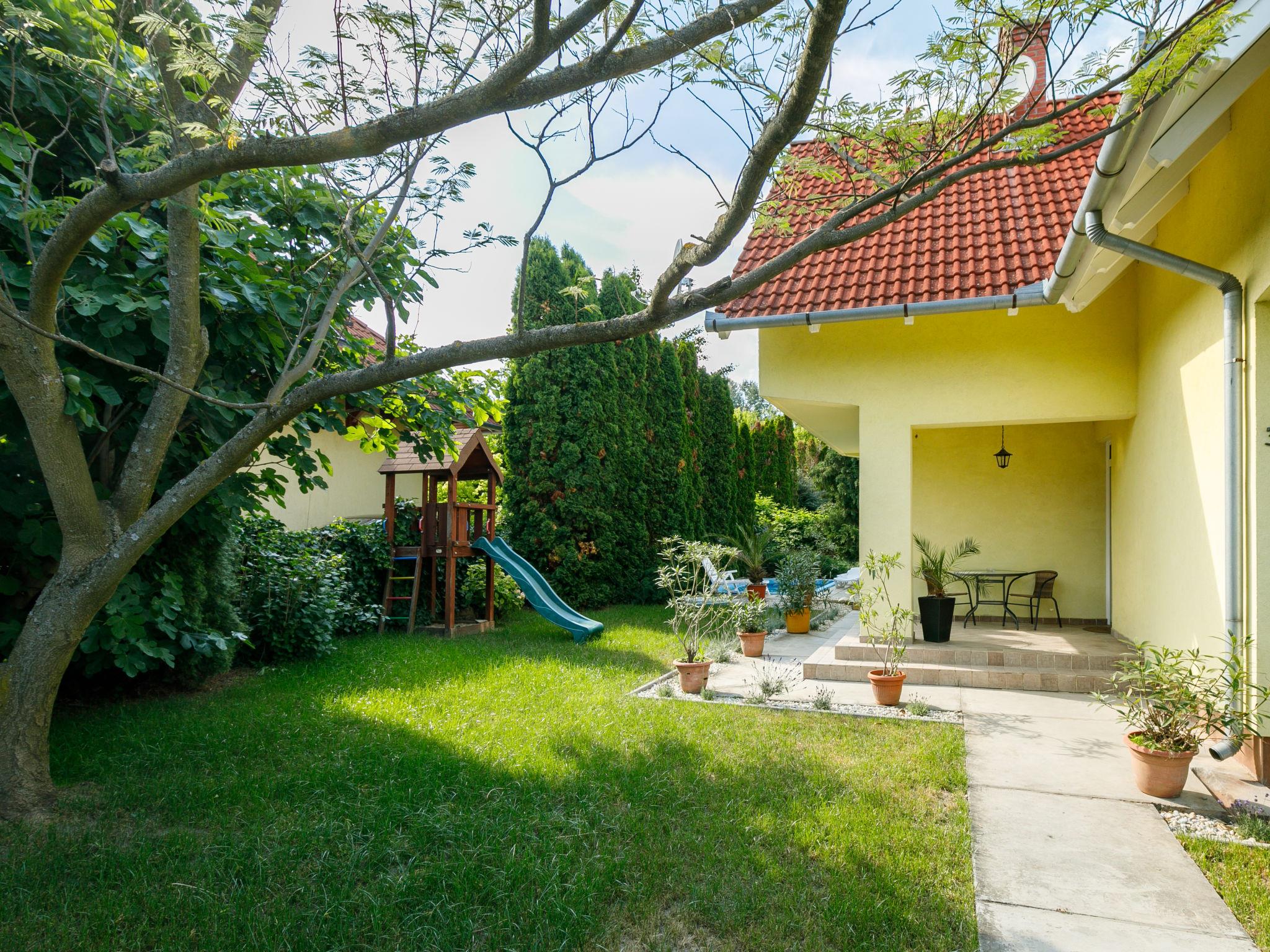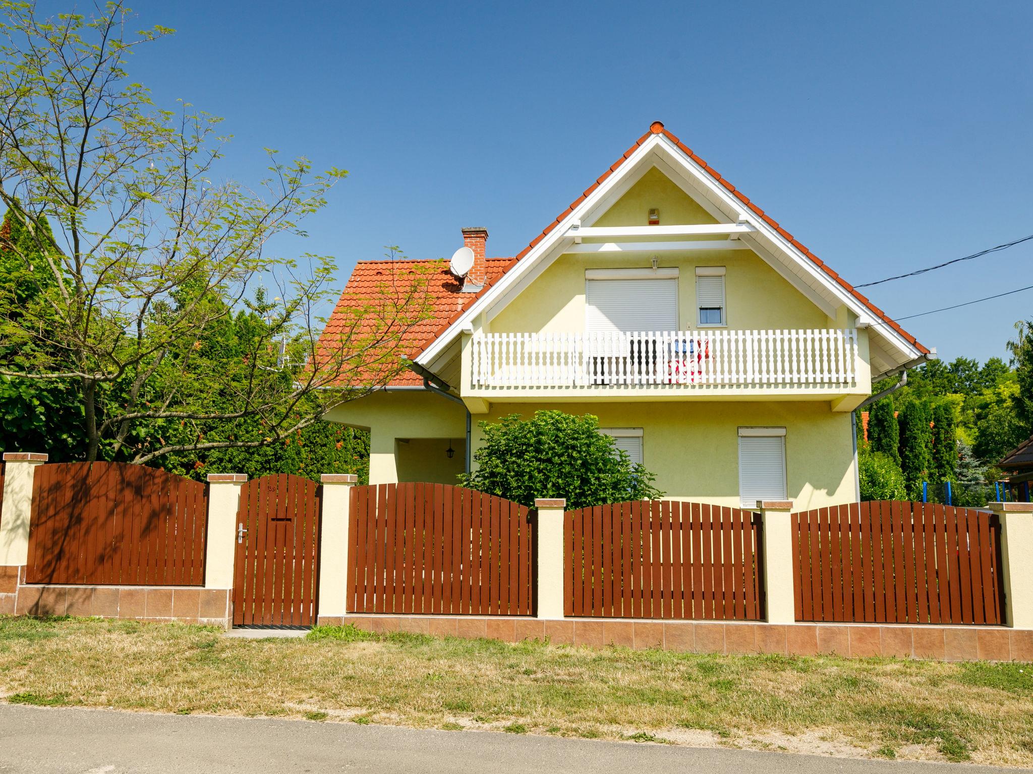 Balatonszárszó 20 km from Siófok: Single-family house "Edina". 750 m from the centre of Balatonszarszo, 25 km from the centre of Siofok, in a sunny position in the residential district, 150 m from the lake, 300 m from the beach. Private: property 600 m2 (fenced) with lawn and trees, swimming pool (5 x 2 m, depth 120 cm, seasonal availability: 15.May. - 30.Sep.). Barbecue, children's playground (slide, swing, sandbox). In the house: WiFi, burglar alarm system. Available: bicycles (3) (extra). Parking (for 2 cars) on the premises. Shop, restaurant 750 m, grass beach 150 m. The owner does not accept any youth groups.