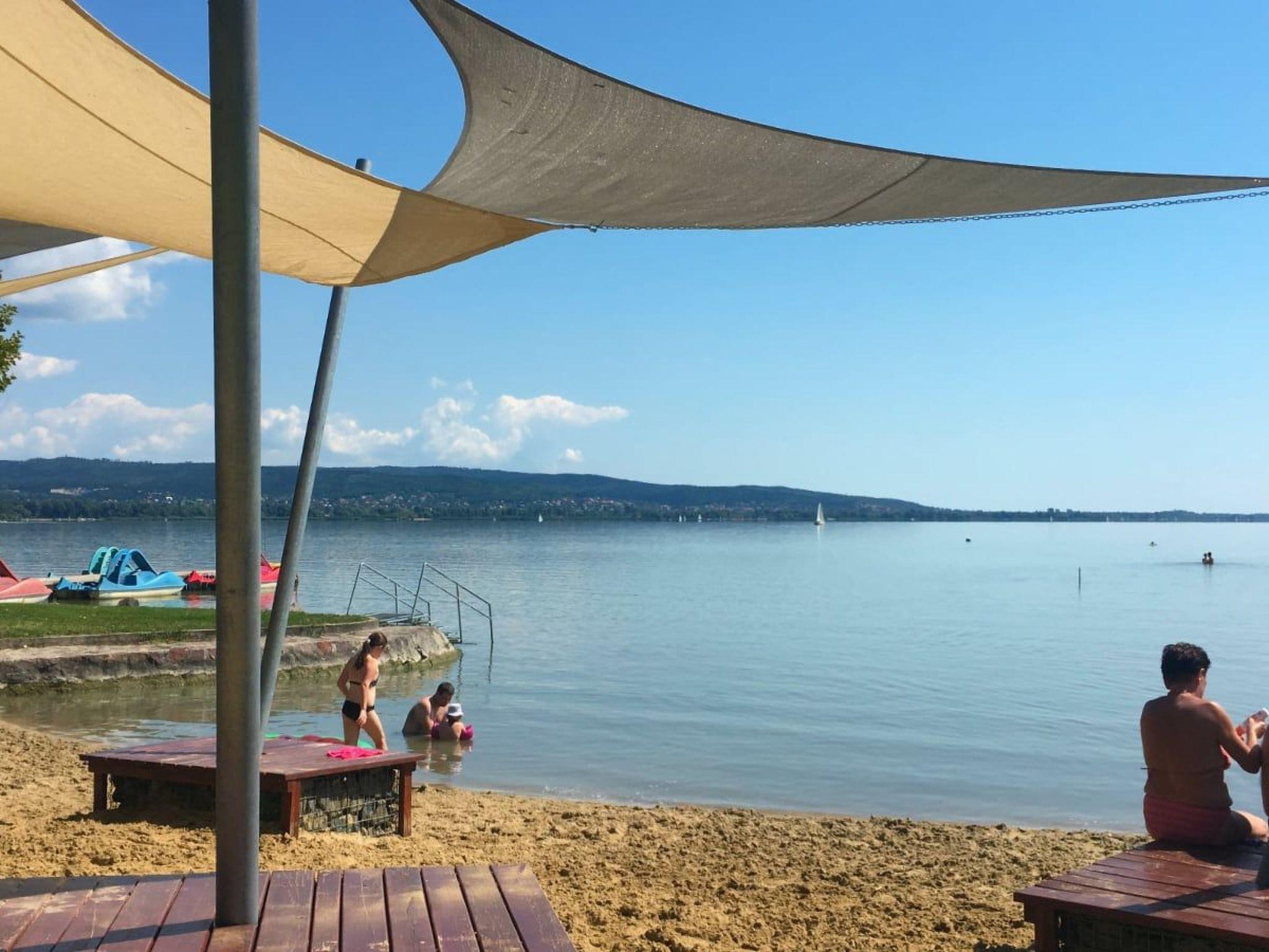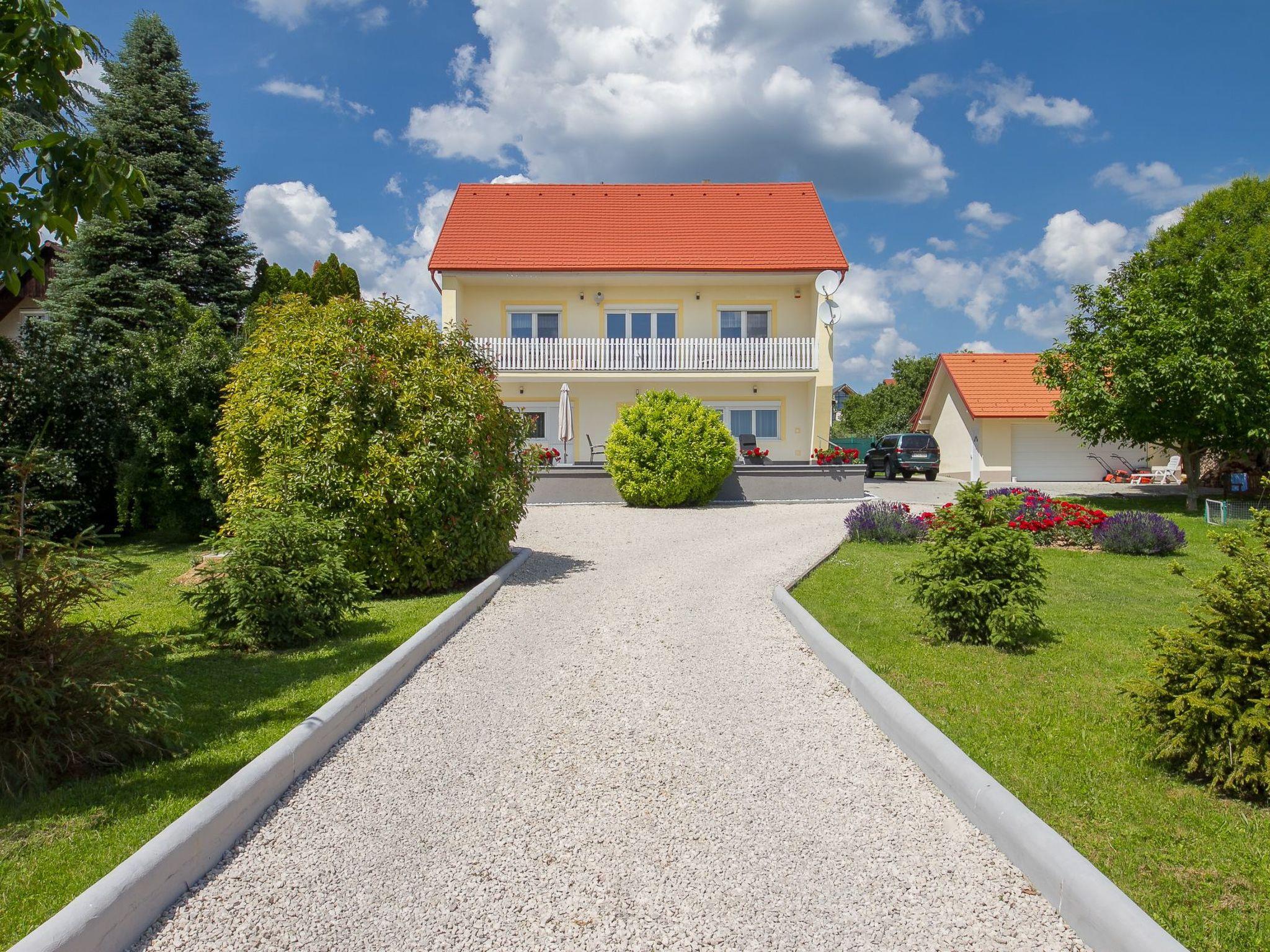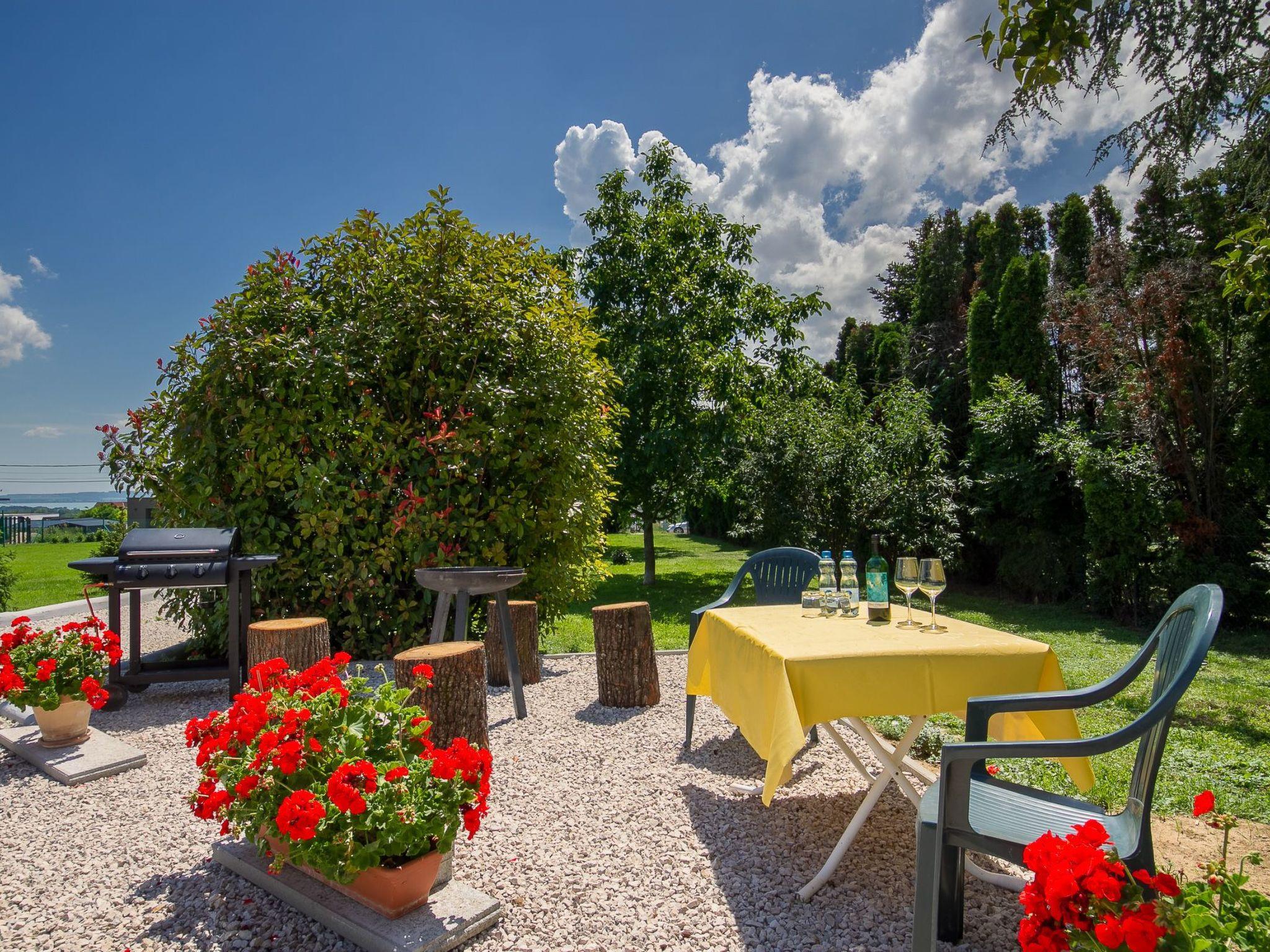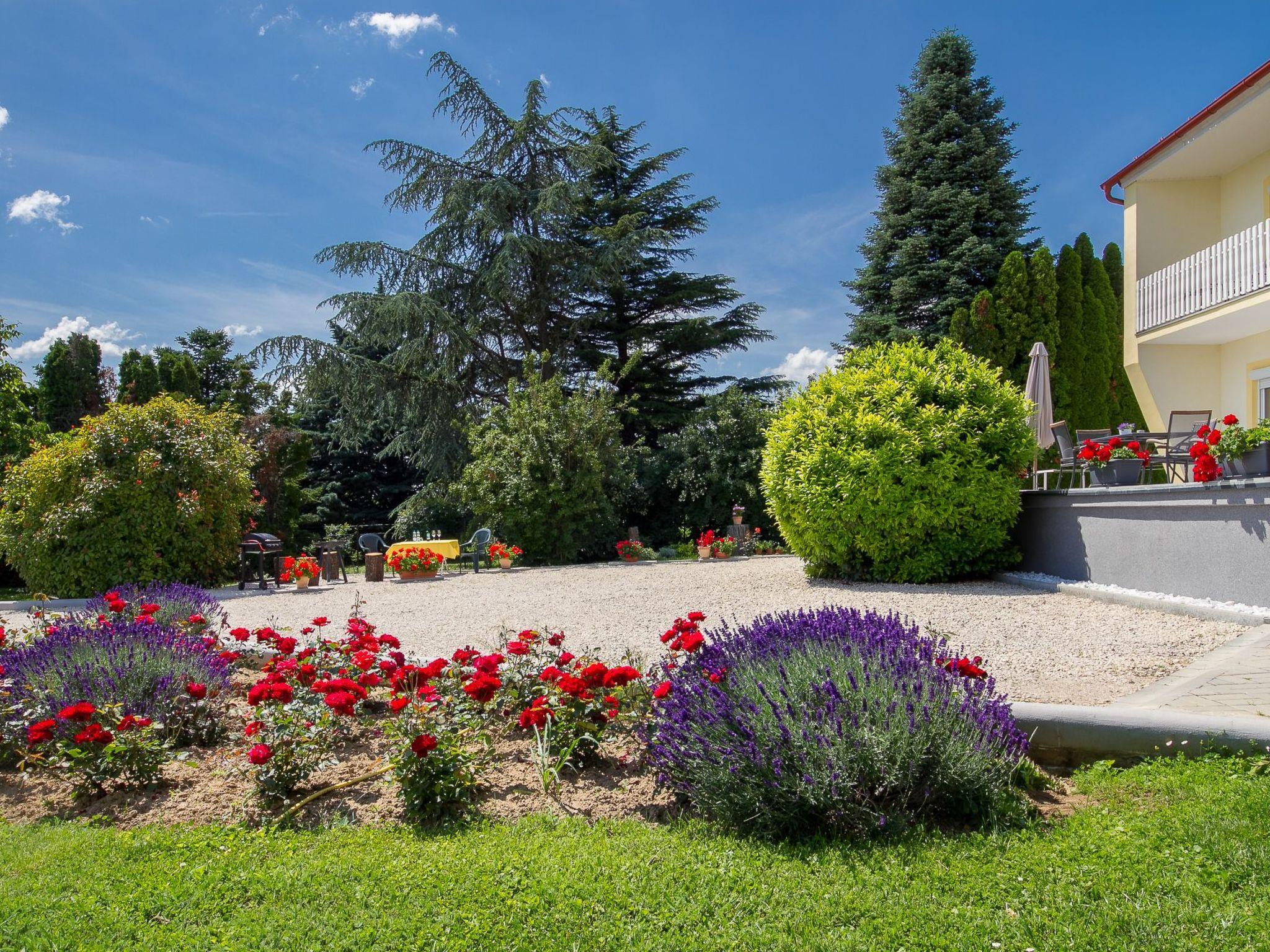 The holiday flat is located on a 1200 square metre enclosed garden plot with meadow, flowers, shrubs and trees, bordered by a fence. The landlord lives permanently in the house, but uses a separate entrance and access is via a side road (tarmac). Parking (for 2 cars) on the property.DistancesShopping 800 m, restaurant 800 m, centre 800 m. Thermal bath, cinema each 5 km in Hévíz. Railway station, indoor swimming pool, sauna, discotheque, doctor, pharmacy, bank each 5 km in Keszthely. Airport in Sármellék 15 km. Railway line 5 km. Main road 450 m. Children's playground 800 m. Lake Balaton 5 km in Keszthely (beach 5 km in Keszthely with meadow and sand). Keszthely: tennis, horse riding, fishing, water sports facilities, boat mooring 5 km each. Dog beach 7 km.