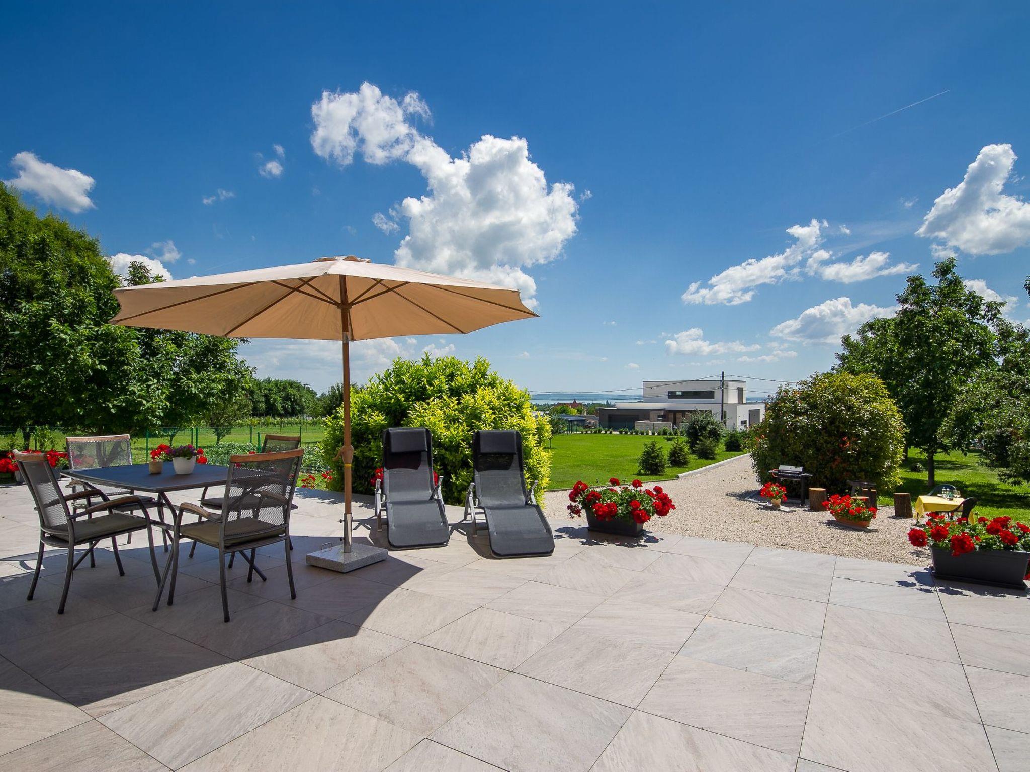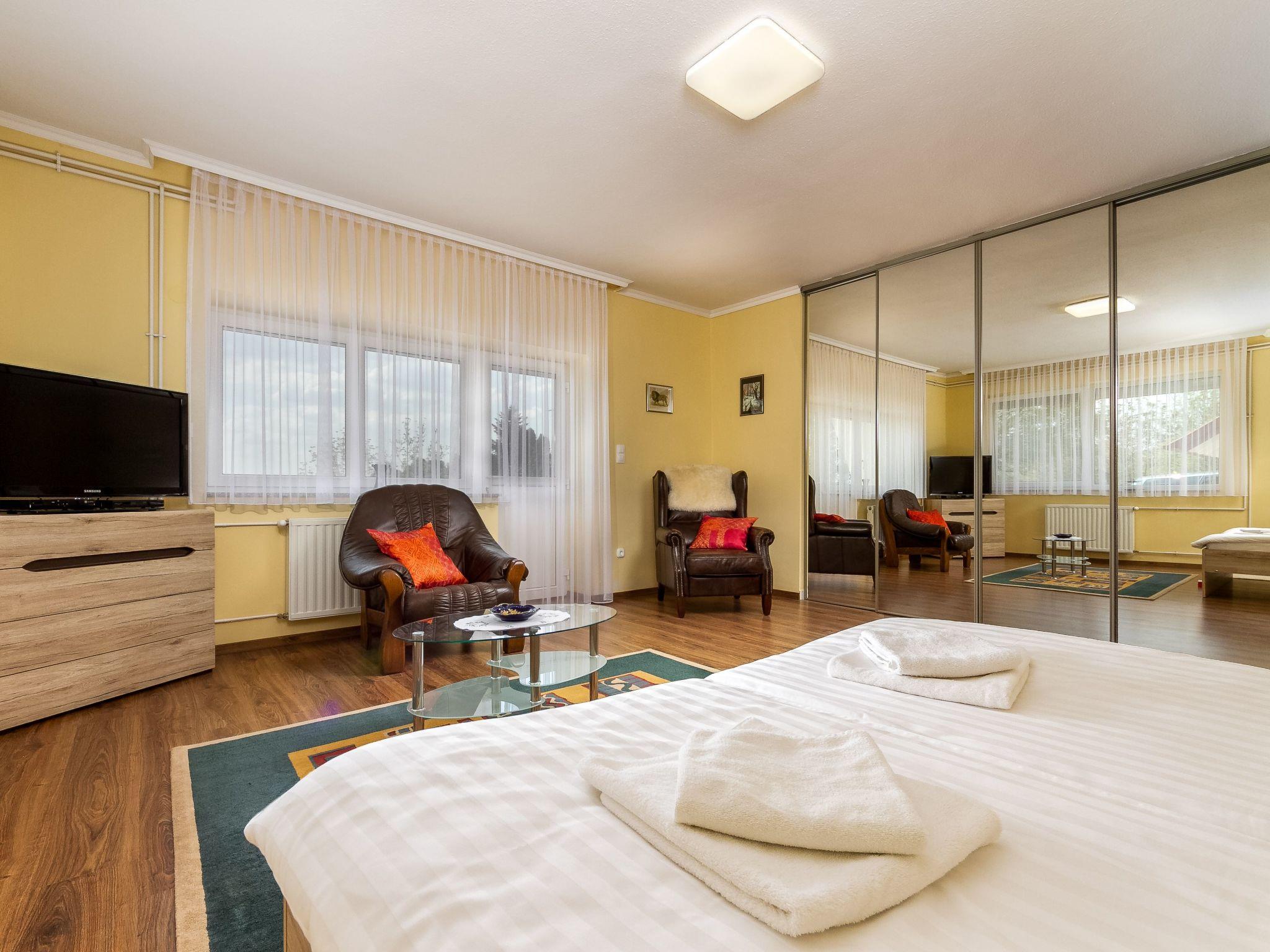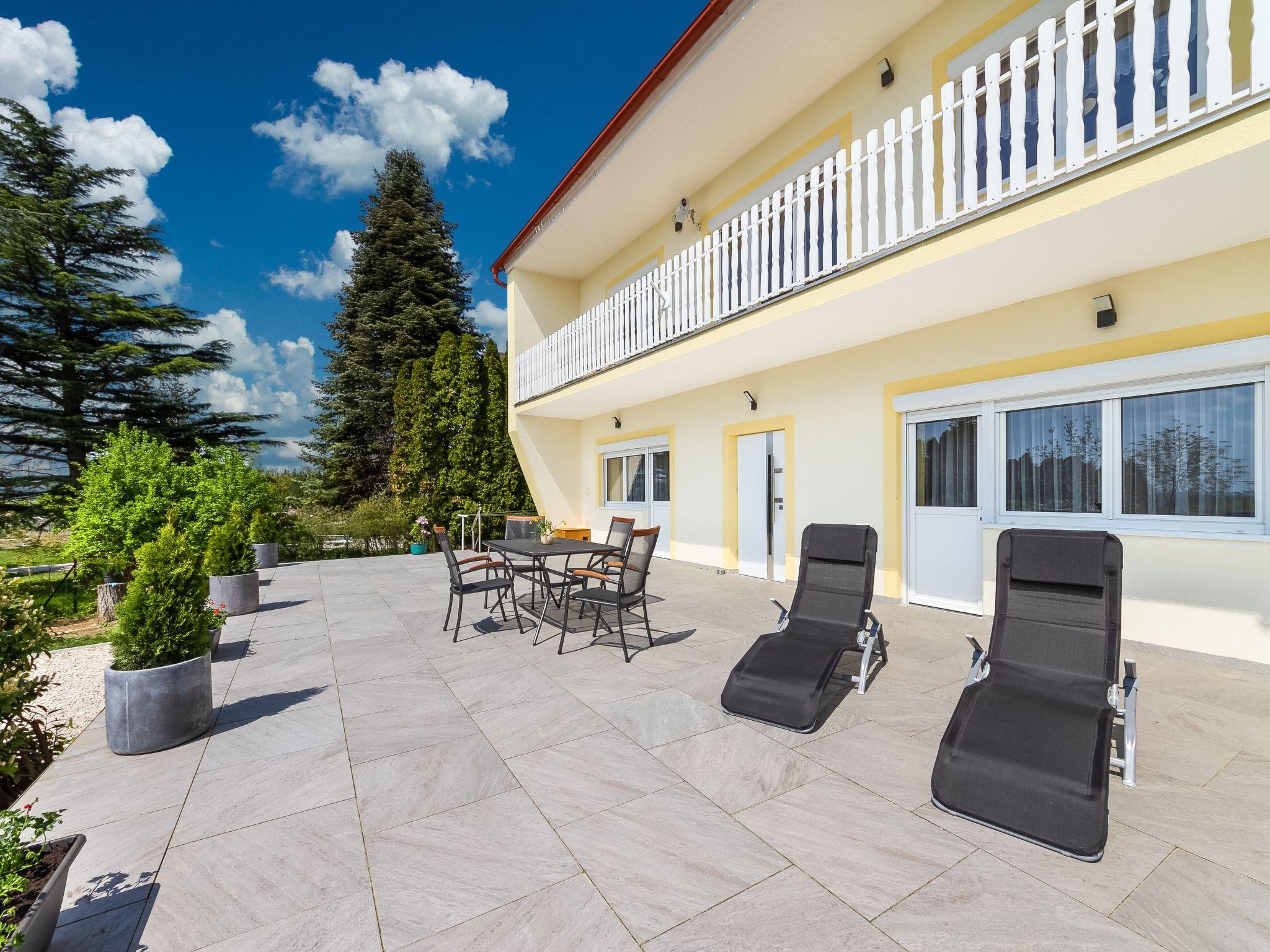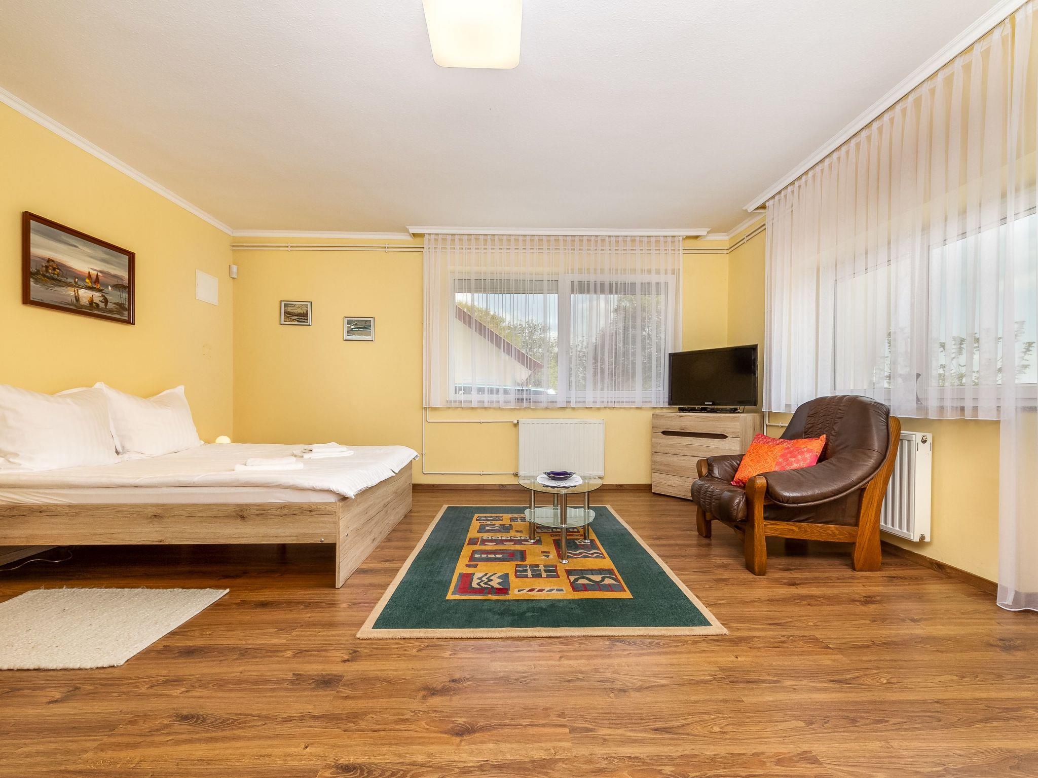 The holiday flat is located on a 1200 square metre enclosed garden plot with meadow, flowers, shrubs and trees, bordered by a fence. The landlord lives permanently in the house, but uses a separate entrance and access is via a side road (tarmac). Parking (for 2 cars) on the property.DistancesShopping 800 m, restaurant 800 m, centre 800 m. Thermal bath, cinema each 5 km in Hévíz. Railway station, indoor swimming pool, sauna, discotheque, doctor, pharmacy, bank each 5 km in Keszthely. Airport in Sármellék 15 km. Railway line 5 km. Main road 450 m. Children's playground 800 m. Lake Balaton 5 km in Keszthely (beach 5 km in Keszthely with meadow and sand). Keszthely: tennis, horse riding, fishing, water sports facilities, boat mooring 5 km each. Dog beach 7 km.