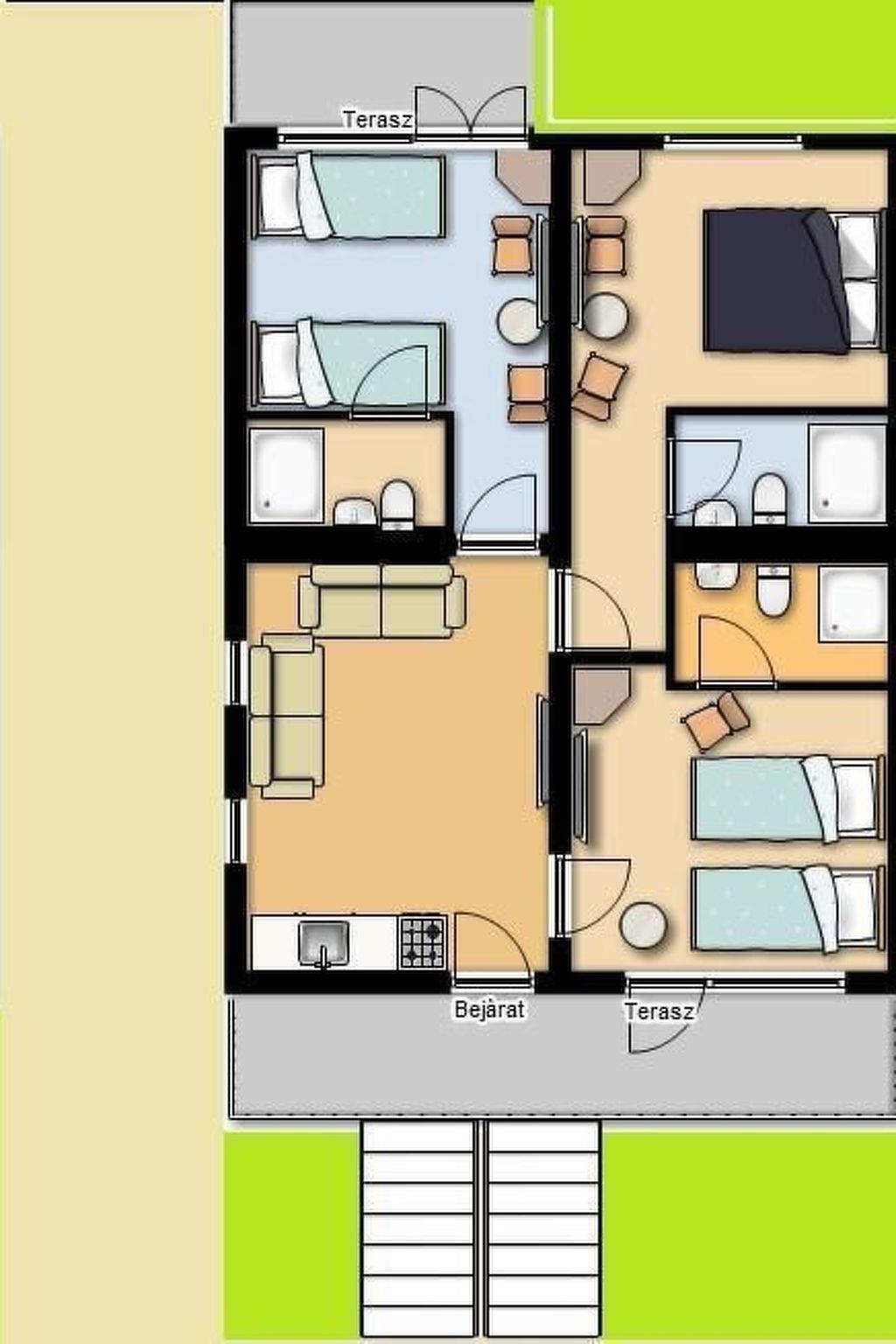 Holiday flat for eight people on the first floor Your flat on the first floor has one bedroom with a double bed and two bedrooms with four single beds. There is also a lounge with a sofa bed (two beds), dining table and kitchen. All rooms are air-conditioned, including the lounge. The Balaton is 50 metres away as the crow flies or a 1-2 minute walk. There are parking spaces per flat via also a barbecue area for common use, to the centre it is only a few minutes walk, via also to the promenade! Netflix and Amazon Prime included on new HD TV.