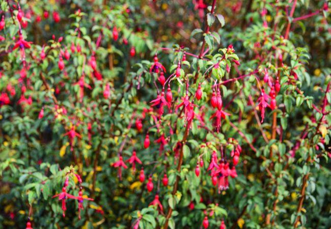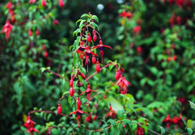 - Patio area with two sunbeds set among beautiful fuchsia plants