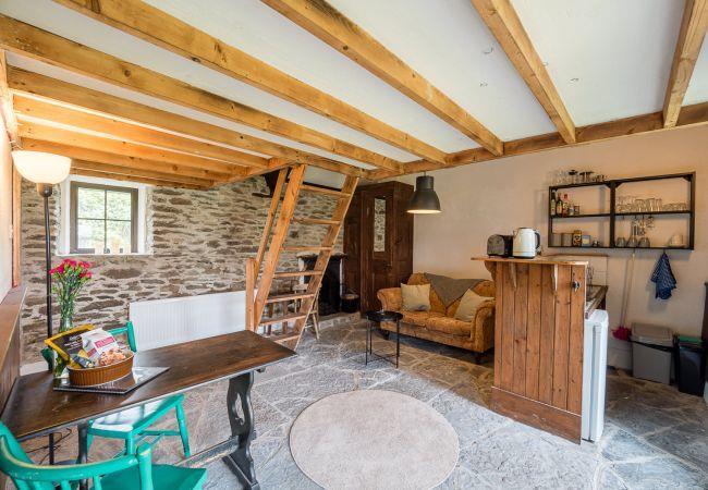 Stylish open plan kitchenette, dining, kitchenette and sleeping area with upstairs mezzanine style bedroom and ground floor double bed: