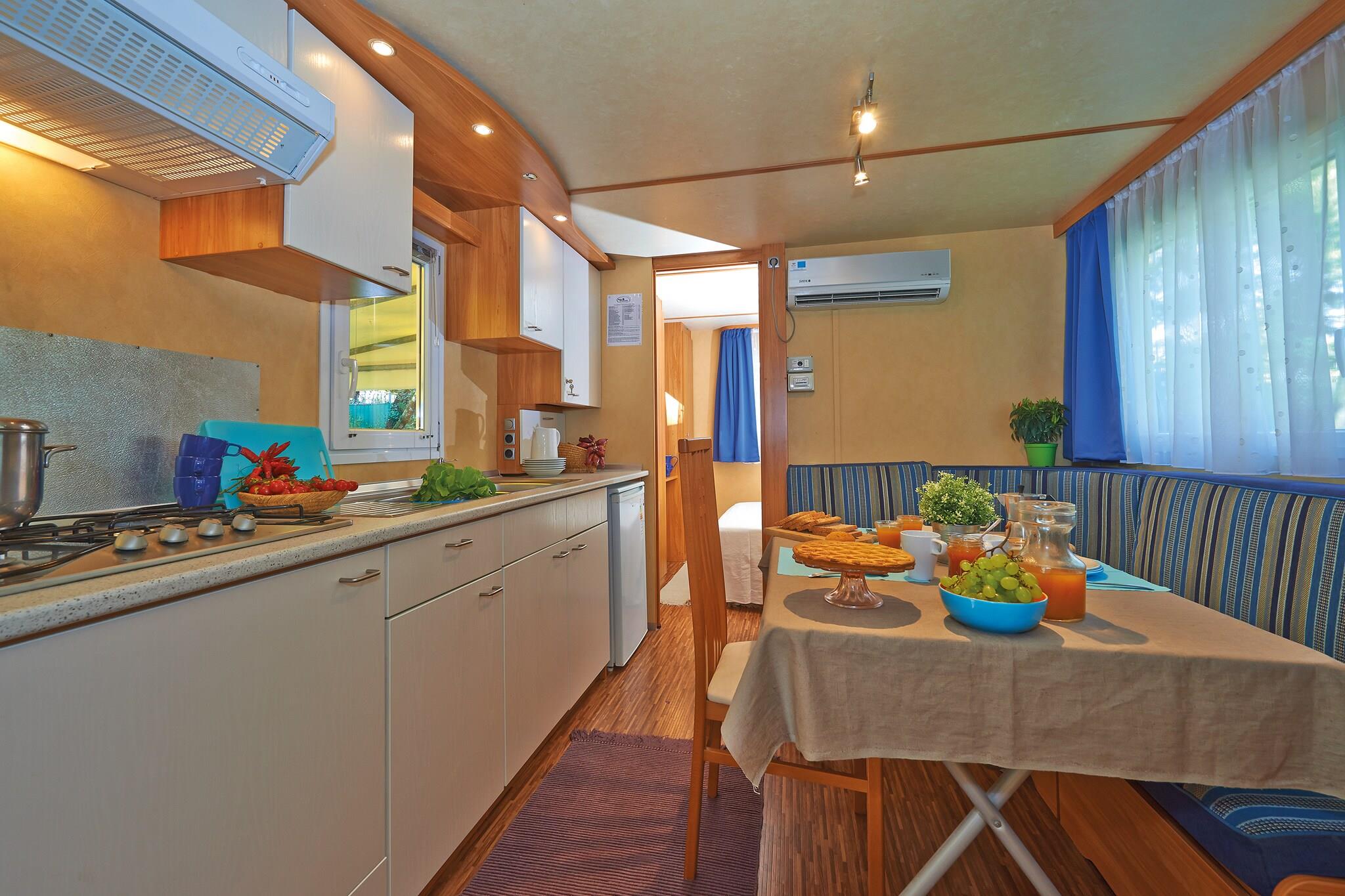 Living room(single sofa bed, TV(satellite)), Kitchenette, bedroom(double bed), bedroom(single bed, single bed), bathroom(shower, washbasin, toilet), veranda, air conditioning, garden furniture, sun loungers, parking, swimming pool(shared with other guests)