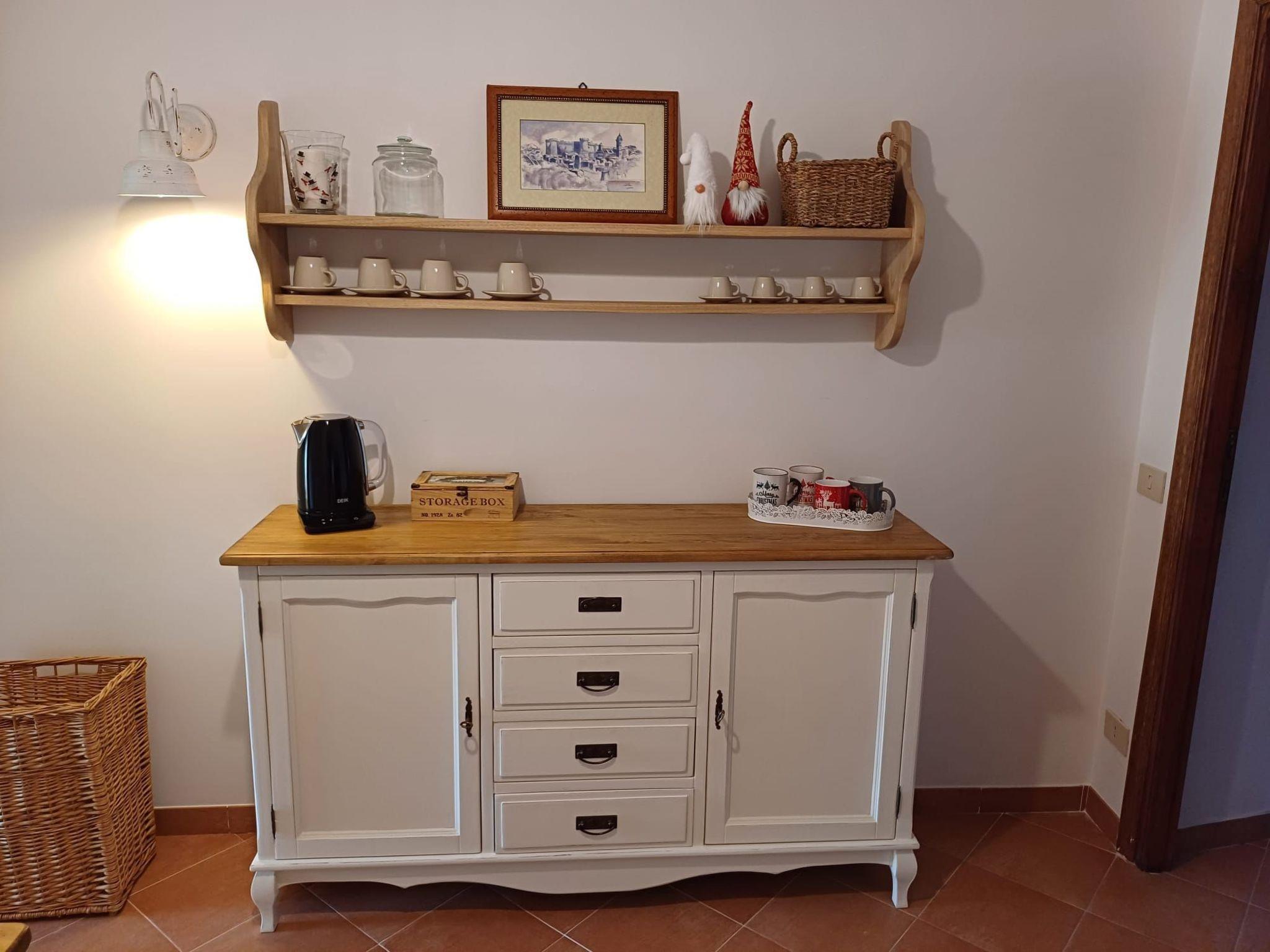 Inside, the flat reveals itself to be a cosy and finely furnished space. The living room, lit by natural light filtering through the windows, offers a beautiful view of the main square and invites you to relax with a comfortable three-seater sofa and a 43-inch Smart TV. The bedrooms are designed for maximum comfort and intimacy: one romantic and private, the other more spacious, both enveloped in a warm atmosphere. The kitchen, equipped with all modern conveniences, offers a charming view over the rooftops of the village, while the bathroom is characterised by functional design and comfort, with a spacious shower and selected toiletries.