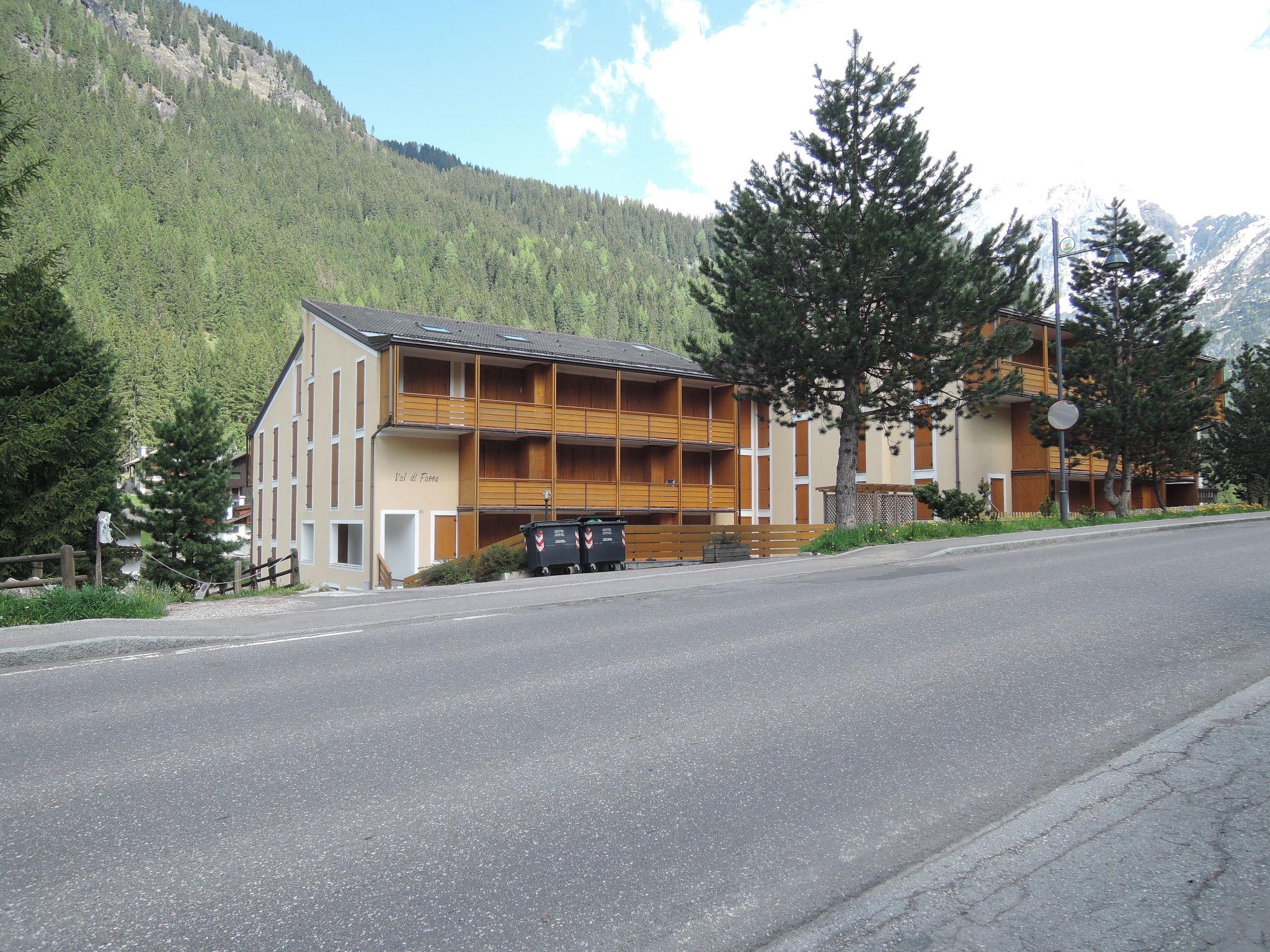 Alba 1 km from Canazei: Large residence "Condominio Val di Fassa", 4 storeys. 700 m from the centre of Alba, 1.5 km from the centre of Canazei, in a quiet position, along the wooded area, 1.1 km from the skiing area. In the house: central heating system, heating available only from 01.Dec. - 01.May.. In Winter: please take snow chains. Parking at the house. Supermarket 500 m, bus stop 20 m. Ski bus stop 20 m. Nearby attractions: Sella Ronda 1.1 km.