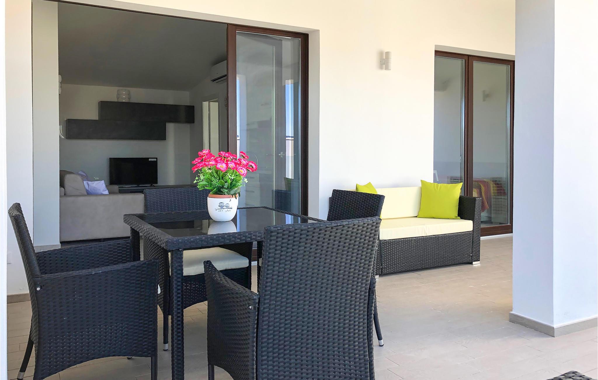 Auf der schönen Terrasse mit Gartenmöbeln können Sie die Urlaubstage in der Sonne verbringen und den Blick auf das Meer und die Umgebung genießen. An heißen Tagen bietet der gemeinschaftlich genutzte Außenpool Abkühlung.
