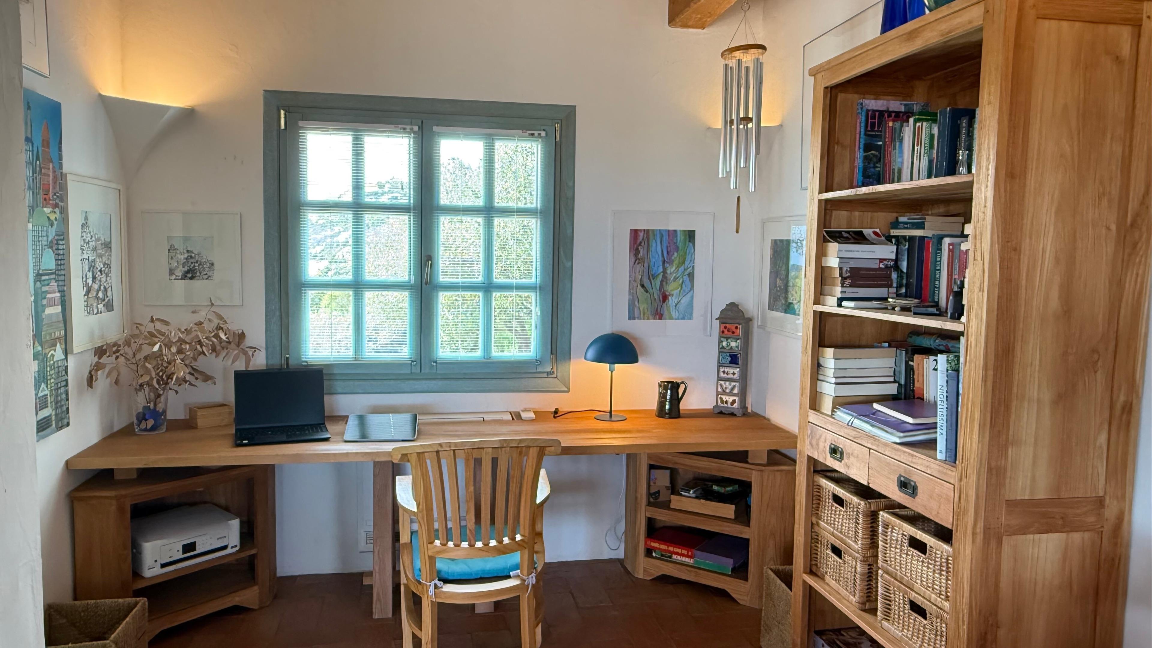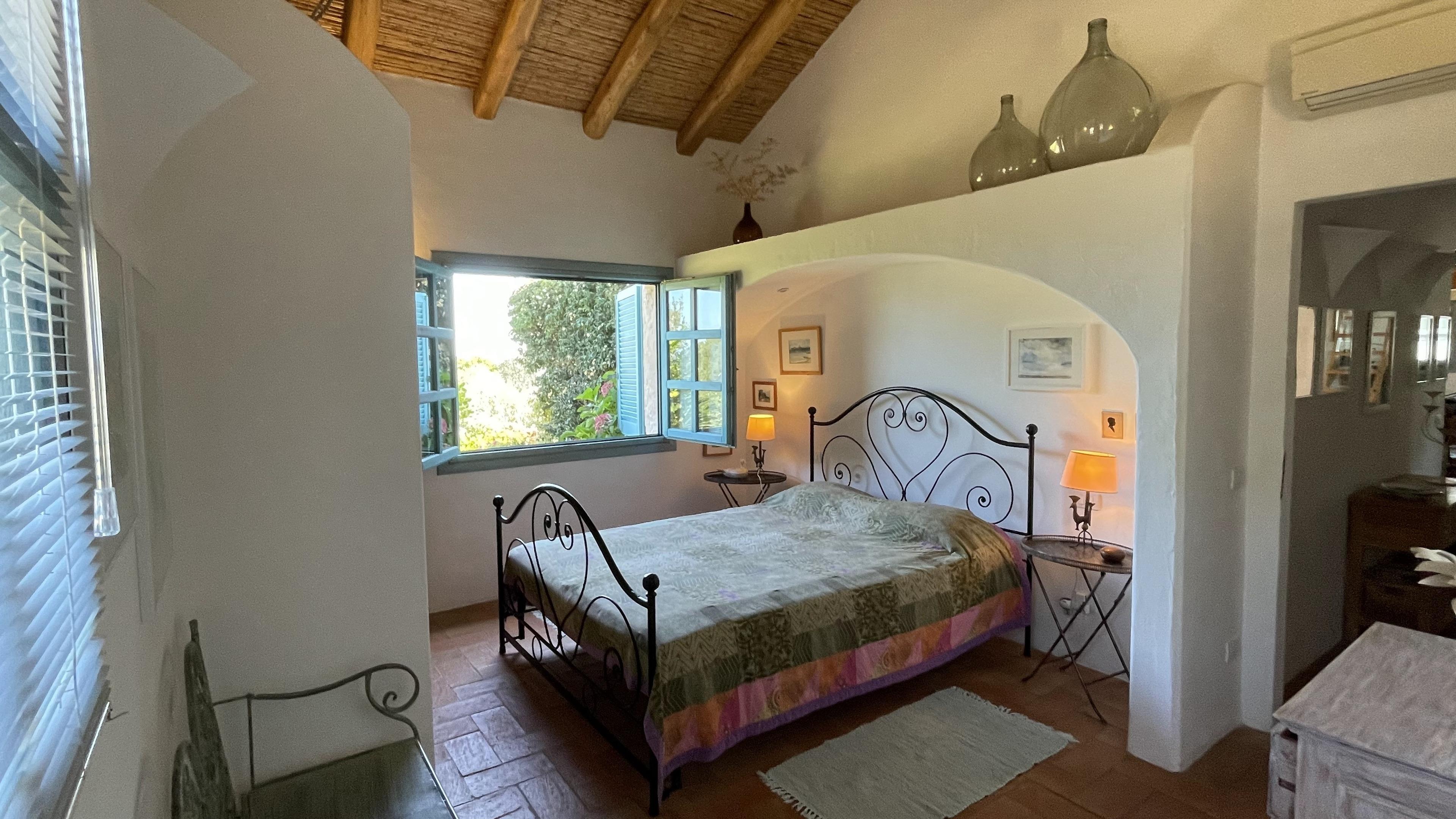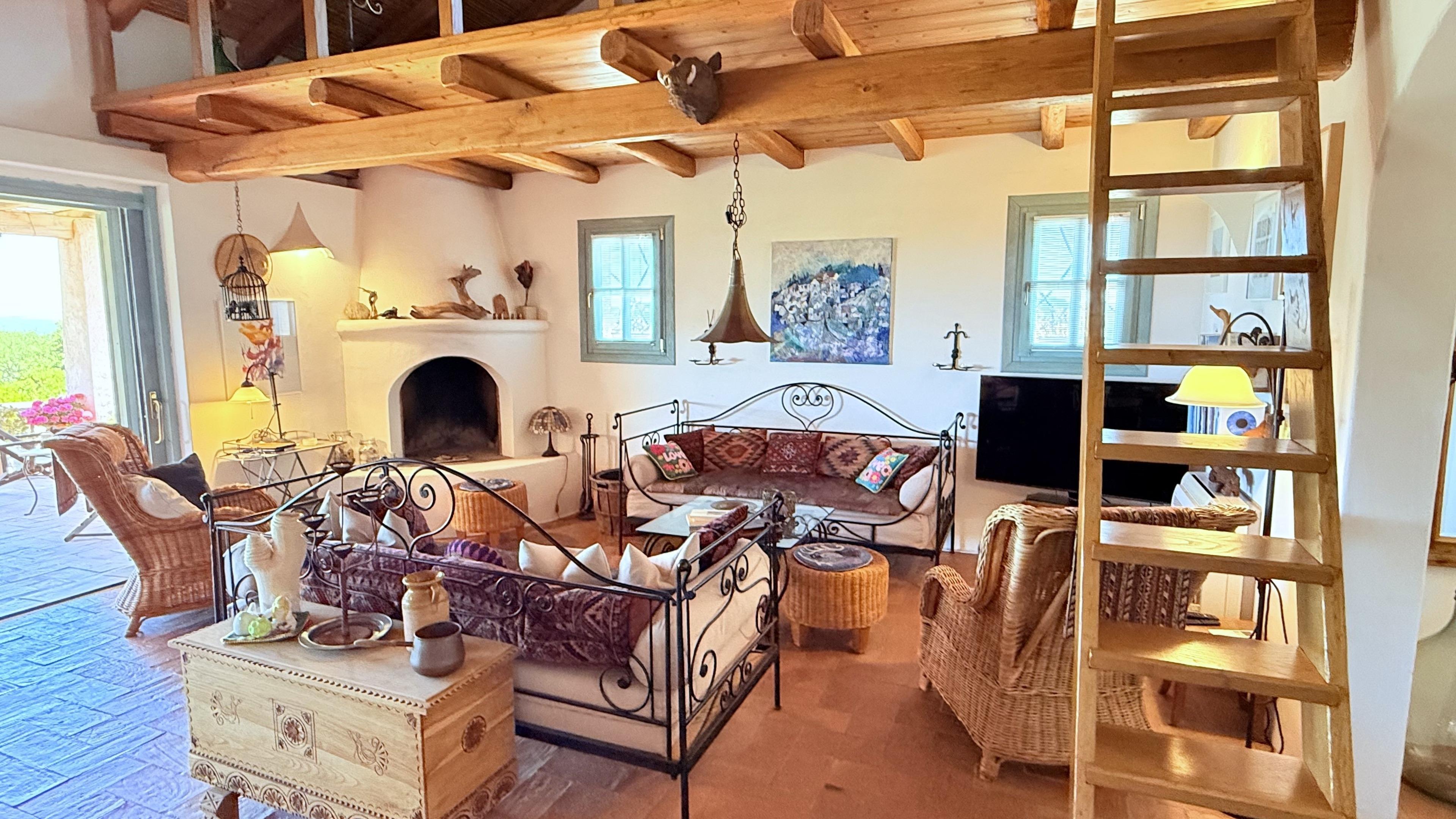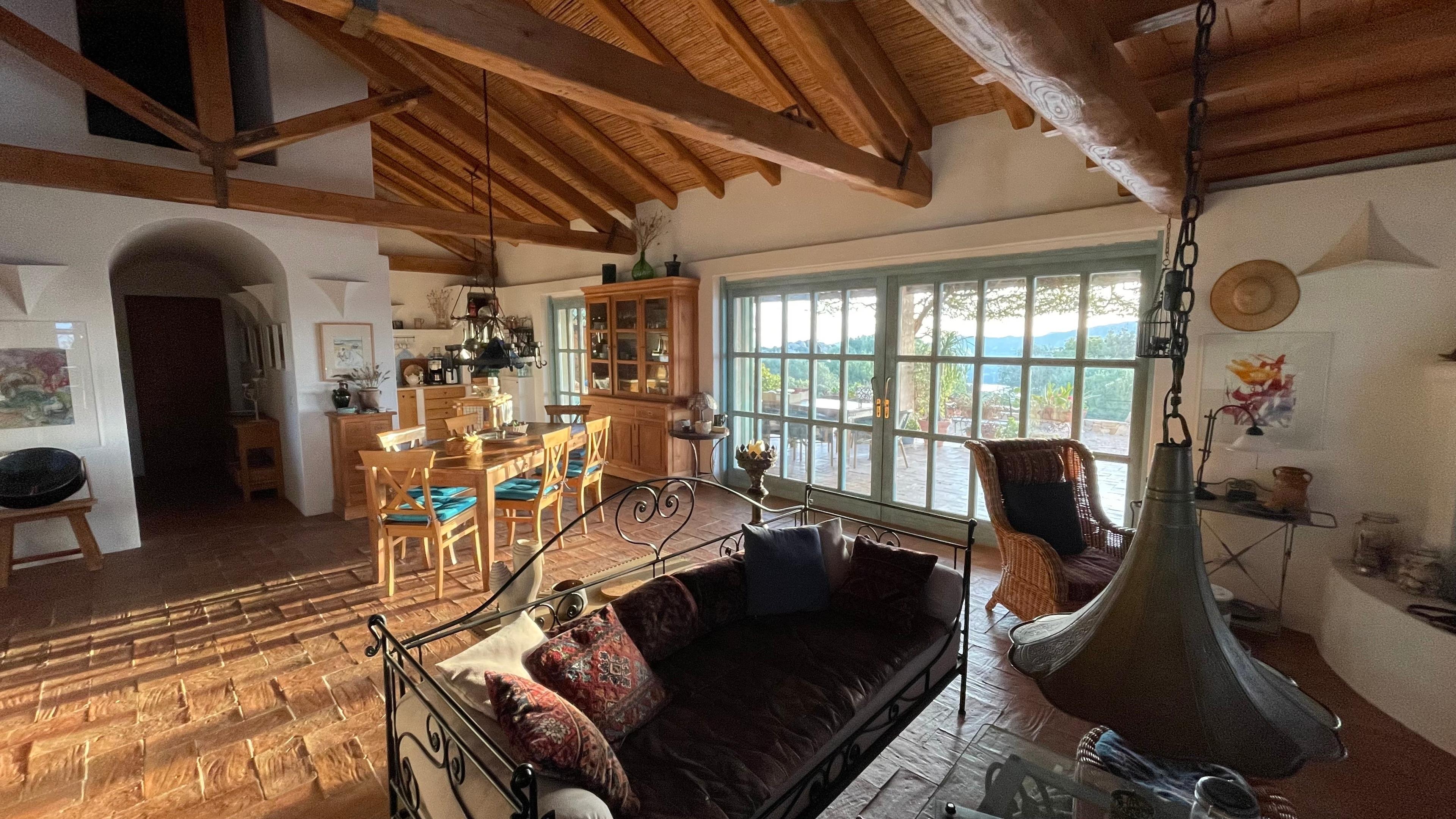 Ein integriertes Homeoffice, mit kostenlosem schnellem Internet, ermöglicht wichtige Arbeiten. Vom offenen Wohnbereich mit Kamin hat man einen großartigen Blick weit über Land und Meer. Über dem Wohnbereich führt eine kleine Treppe zur Empore für den ungestörten Rückzug mit Couch und Lesesessel. Der Essbereich, in unmittelbarer Nähe zur geräumigen, offenen Küche, hat einen Zugang zu Terrasse und Pool. Im hinteren Teil befinden sich noch zwei Schlafzimmer und zwei Bäder. Wäschewechsel alle 14 Tage.