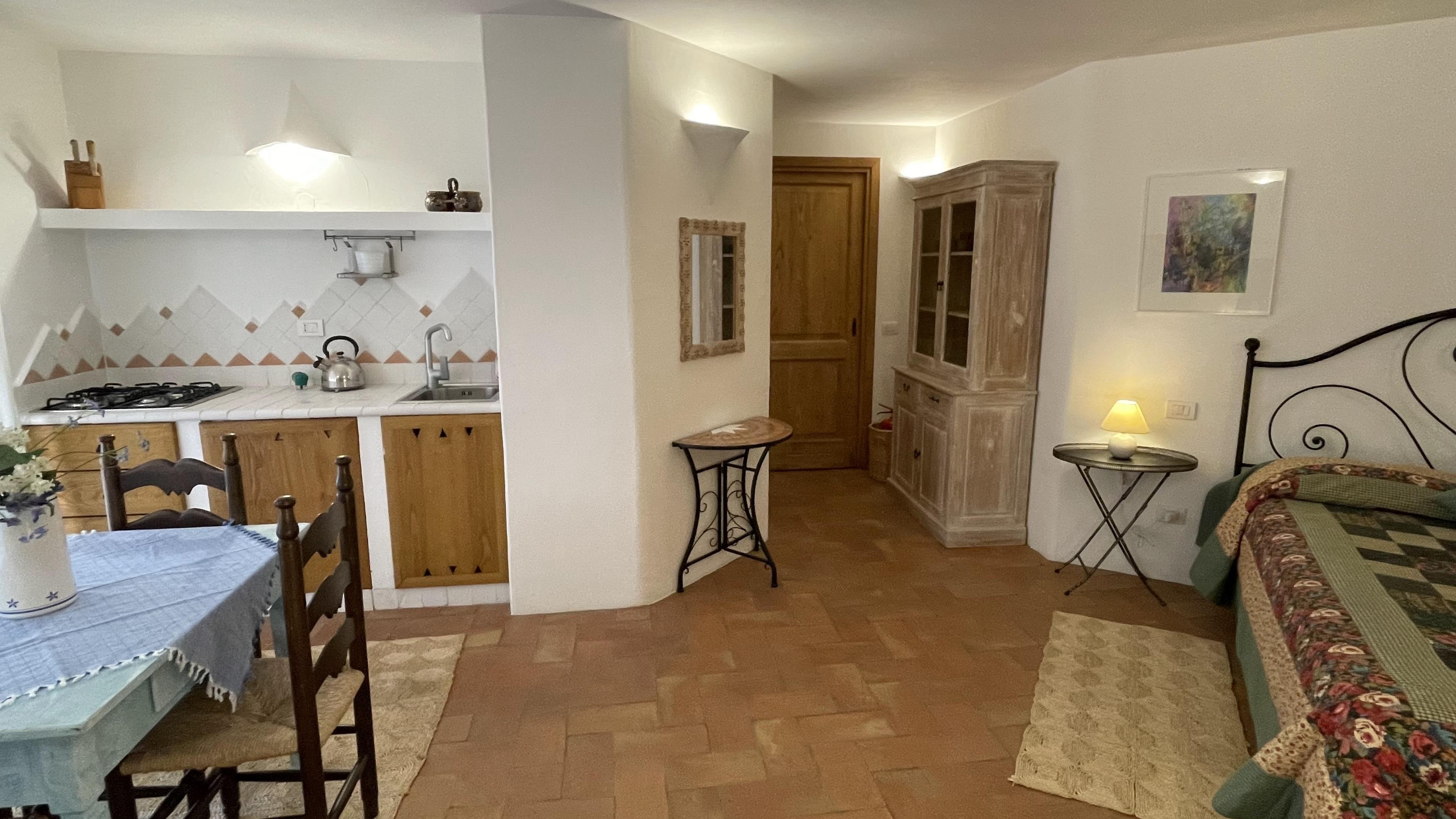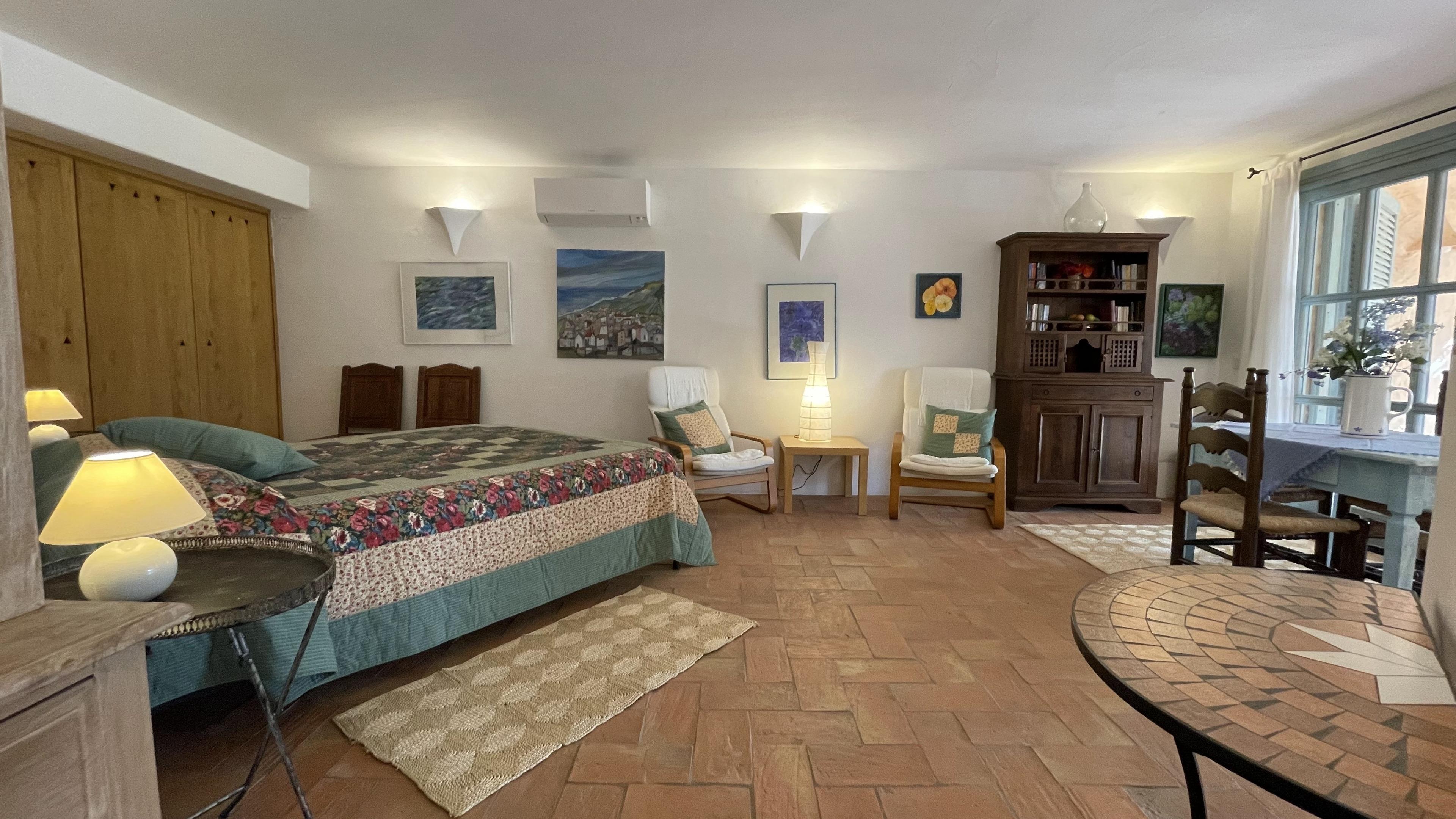 Über eine Steintreppe, innerhalb des Hauses, gelangt man von der Hauptetage zum Apartment der Gartenetage. Hier befindet sich auch der Hauswirtschaftsraum mit Waschmaschine, Trockner und Bügelbrett etc. Das geräumige Apartment verfügt über Küche, Ess- und Schlafbereich mit eigenem Bad. Das Apartment hat eine teilweise überdachte Terrasse und einen eigenen Ausgang zum Garten und Pool.