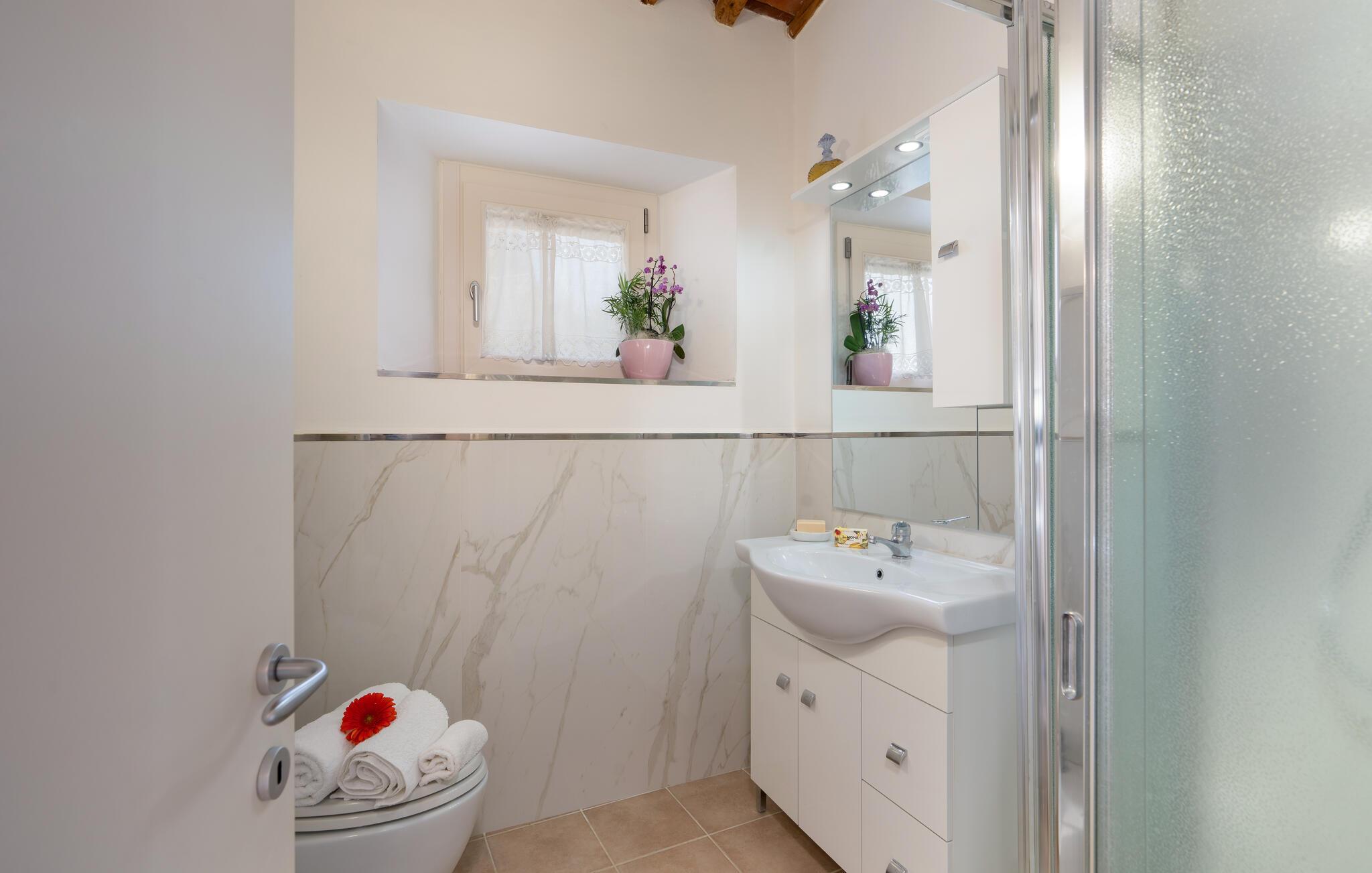 Die Unterkunft bietet einen atemberaubenden Blick auf die sanften Hügel der Toskana und ist von malerischen Olivenhainen umgeben. Entspannen Sie sich am privaten Pool, der von grüner Natur eingerahmt ist, und genießen Sie den ruhigen Ausblick. Verbringen Sie den Tag im Schatten der Veranda, wo Sie in geselliger Runde speisen können. Machen Sie es sich im gemütlichen Wohnbereich bequem, der durch rustikale Holzbalken und helle Wände eine einladende Atmosphäre schafft. Nutzen Sie die schöne Küche, um regionale Spezialitäten zuzubereiten, und lassen Sie sich von den frischen Produkten der Toskana inspirieren.
