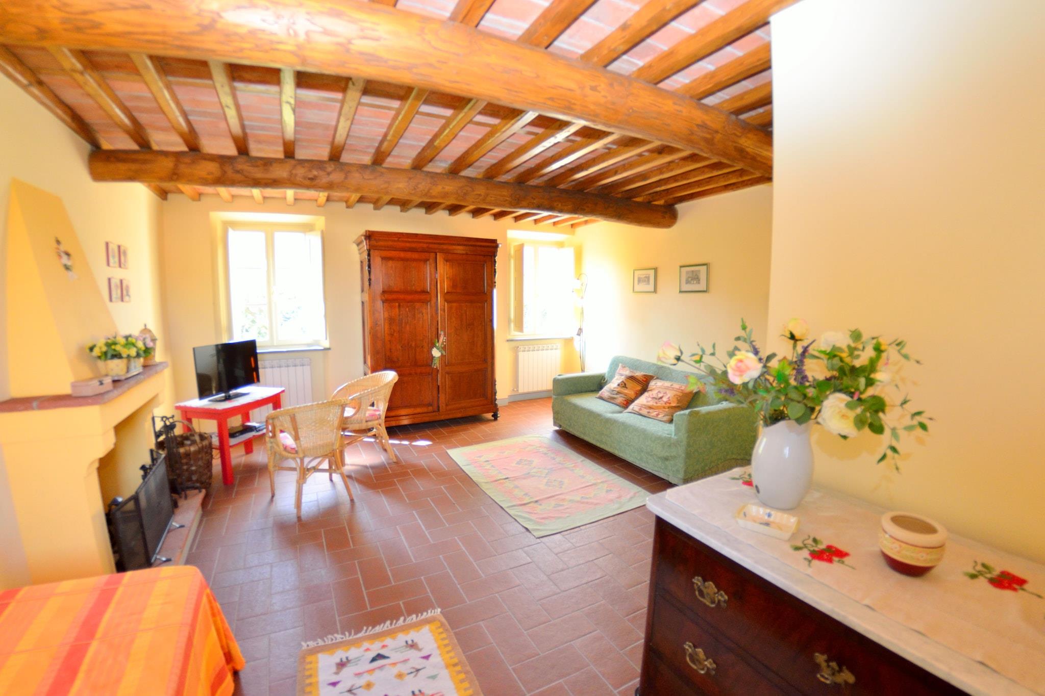 This spacious, bright and cosy apartment is located in the inner of an ancient mansion. The apartment dispose of an independent entrance. The garden is at the full disposal of the guests, equipped with a table, chairs, barbeque, deckchairs and a paddle pool for children. Ideal choice for families with children – the garden is spacious and your children may play securely, there is also a baby bed and a highchair. Shopping and restaurant reachable on foot. There is an office within the grounds, disposes of an own access. Attractions Spend an active outdoor holiday! The village of Colle di Compito is located on the bottom of the medieval hamlet of Castelvecchio – excellent departing point for strolls and mountain bike tour to the nearby villages such as Ruota, San Ginese di Compito, S. Andrea, San Giusto, all surrounded by olive groves and wine yards. Perfect for lovers of the Tuscan cuisine – restaurants and pizzerias only 500m from the holiday home. The wonderful therapeutic springs of San Giuliano are only 20 km from the property away and the sandy beaches of the Versilia 40 km. The art cities of Tuscany are within an easy reach: Lucca 14 km, Pisa 26 km and Florence 76 km. There is an office within the grounds, disposes of an own access. Interior Description Entrance on the ground floor: stairs to the 1st floor: spacious living room with couch, upholstered chairs, SAT-TV, there is a single bed in an angle, utility room with washing machine, kitchen-cum-dining with dishwasher, stove, oven, fridge/freezer, toaster, filter coffee brewer. Stairs to the 2nd floor: 1 spacious double bedroom with 1 en-suite bathroom with shower, wc, bidet, basin, 1 twin bedroom, 1 bathroom with shower, wc, bidet, basin. Tasteful furnishings in country style with beamed ceilings and terracotta tiled floors. Parking within the grounds.Internet WiFi max 3 GB/week Included