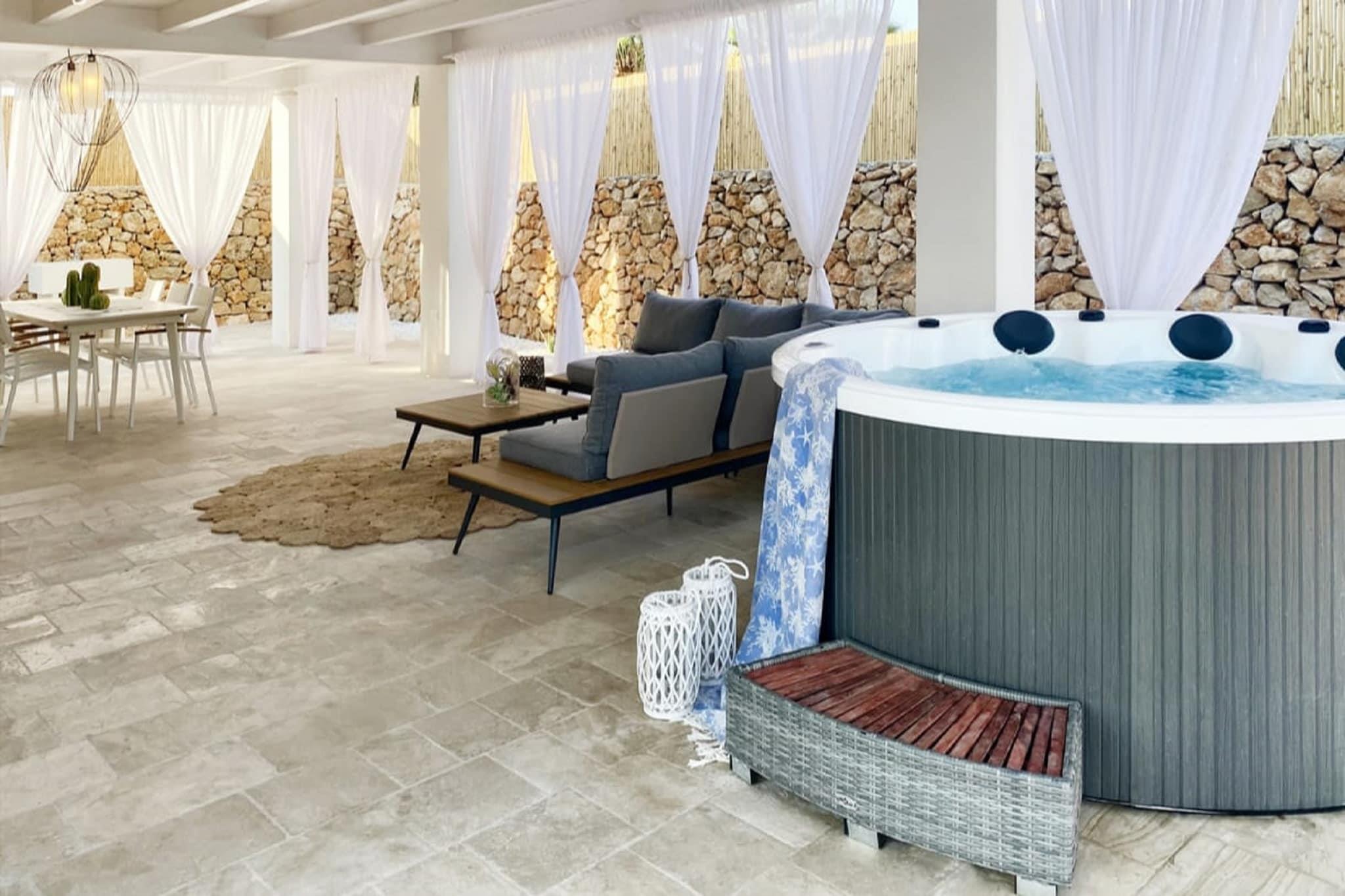 Ground floor: (open kitchen(hob, hood, espresso machine, oven, microwave, dishwasher, fridge-freezer), Living/diningroom(TV, dining table), bedroom(double bed, air conditioning, air conditioning), bedroom(double bed), bathroom(shower, washbasin, toilet, bidet), Bubble bath(private), patio, heating, air conditioning, garden furniture, insect screens) outdoor kitchen, garden, garden furniture, sun loungers, BBQ, parking
