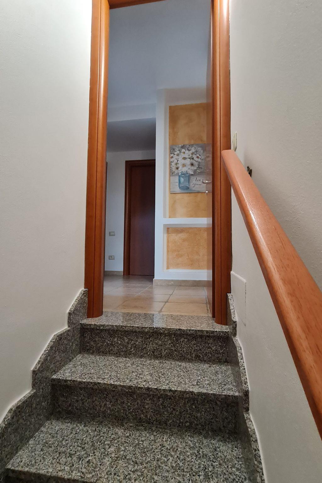 The villa is accessed by a pedestrian entrance or by car from the internal car park with sliding gate. A wide walkway leads to the front door of the house. Inside, the villa is on two levels. The main entrance on the ground floor leads directly to the living room with TV and dining area. A single room houses the living room and the large, well-equipped kitchen. The bright sliding glass door of the living room and the kitchen leads to a veranda and to the covered gazebo equipped with table and chairs, ideal for dinners tasting the typical products of our Sardinian land. From the living room you reach the corridor leading to the bathroom and the double bedroom. From the corridor you reach the staircase leading to the sleeping area on the upper floor composed of a double bedroom, a twin bedroom with joinable beds and a bathroom.