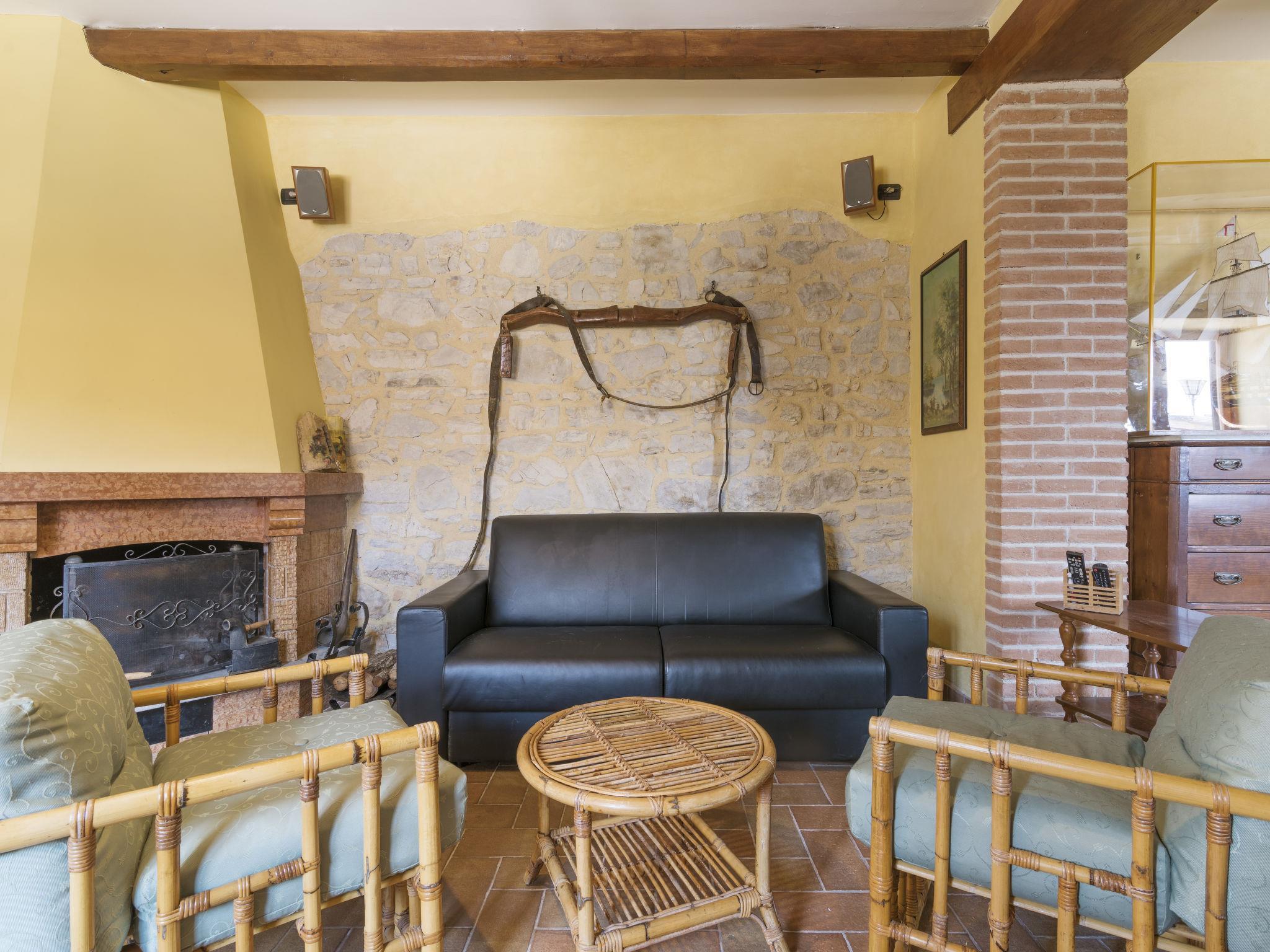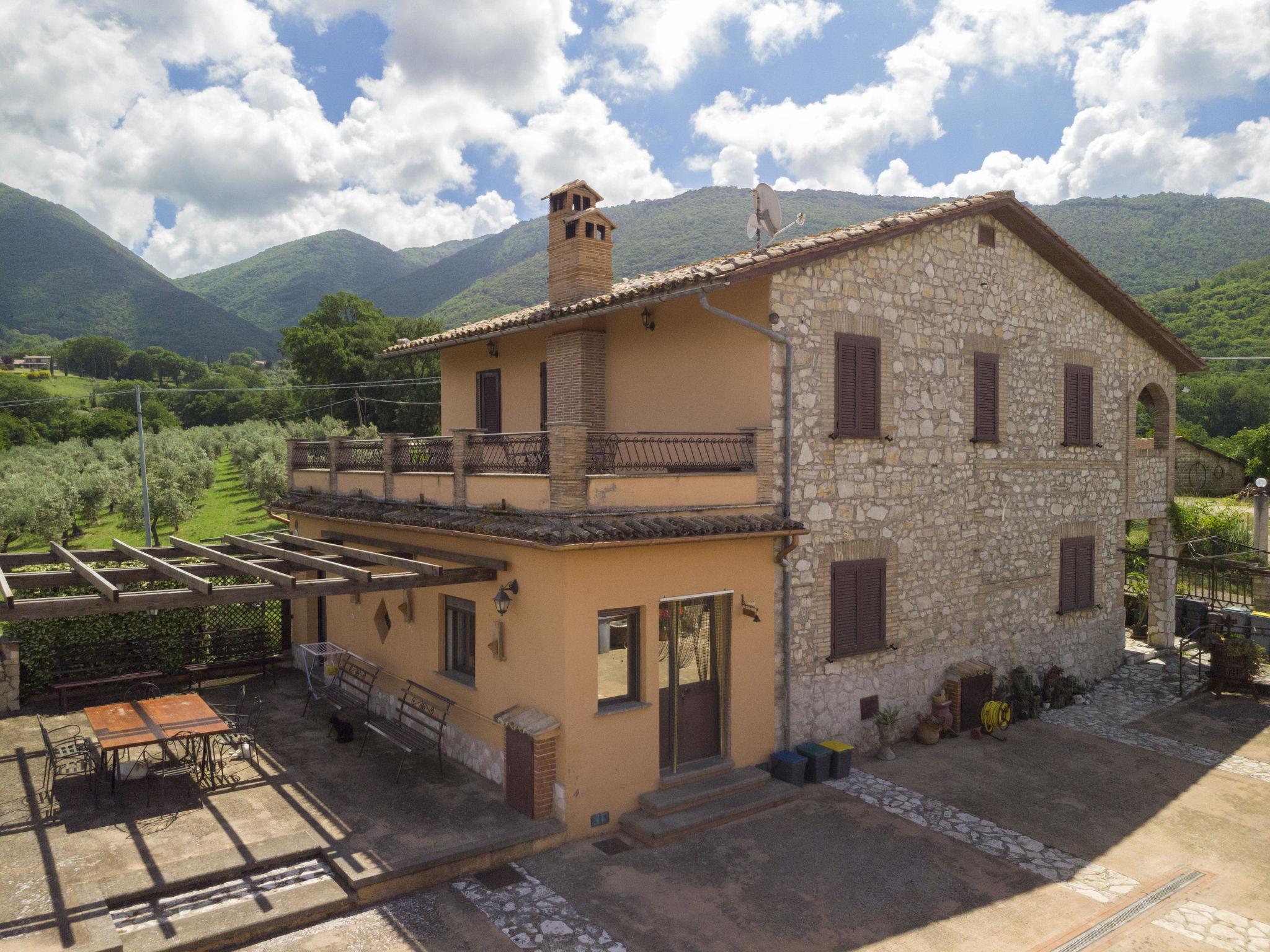"Colleflaviano", 4-room house 200 m2 on 2 levels. Rustic furnishings: living/dining room with 1 double sofabed, open-hearth fireplace, dining table, satellite TV, hi-fi system and DVD. Kitchen (oven, dishwasher, 5 gas rings, microwave, freezer, electric coffee machine) with wood-burning stove. Shower/WC. Gas heating. Upper floor: 1 double bedroom. 1 double bedroom. 1 room with 2 beds. 3 showers/WC. Gas heating. Balcony, terrace 60 m2, terrace. Terrace furniture, barbecue. Facilities: washing machine, children's high chair, baby cot. Internet (WiFi, free). Please note: non-smoking house. Maximum 3 pets/ dogs allowed. IT057012B5475U55CE