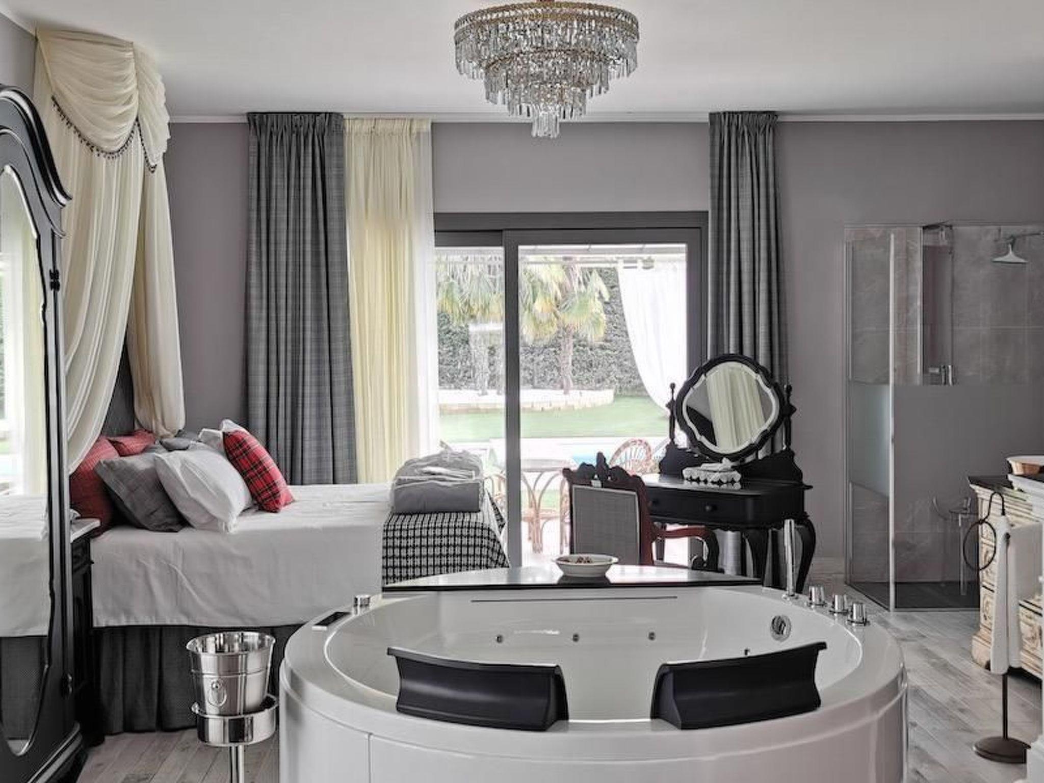 The villa's refined and elegant interior can comfortably accommodate up to 12 people. The interior layout is designed to guarantee comfort and luxury: two rooms on the first floor with king-size beds, bathrooms with shower, solarium, and on the ground floor two more rooms with king-size beds, a spacious bathroom with jacuzzi, a 70-square-metre "Prince of Wales" SUITE equipped with every comfort, and a "Country Flowers" MINI SUITE, also well-equipped and with access to an outdoor pergola facing the pool.