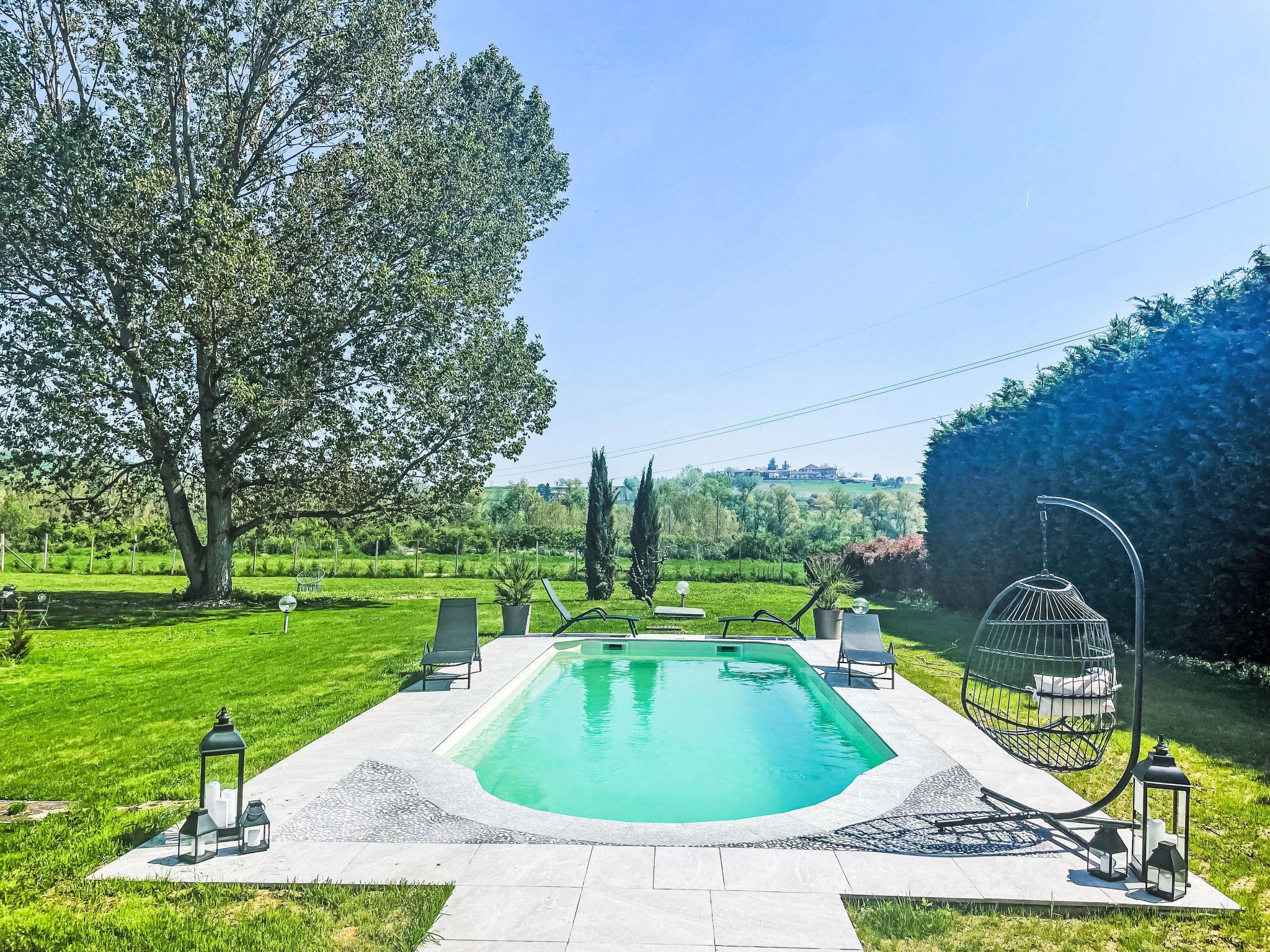 Cosy 2-family house "Tenuta Beatrice", 2 storeys, surrounded by meadows. 200 m from the centre of Castell' Alfero, in a busy position, on a main road. For shared use: property 5'000 m2, garden with lawn 500 m2, trees. Private: swimming pool (10 x 4 m, depth 160 cm, seasonal availability: 01.May. - 15.Oct.) with salt water. Outdoor shower, pool house with fridge and cooking stove, patio, terrace, garden furniture, barbecue. In the house: storage room for bicycles. Parking at the house on the premises. Supermarket 1 km, restaurant 400 m, bus stop 300 m. Nearby attractions: Asti 12 km, Alba 43 km. Please note: car recommended. On the estate animal husbandry. The owner lives in the same residence. The owner has a dog.