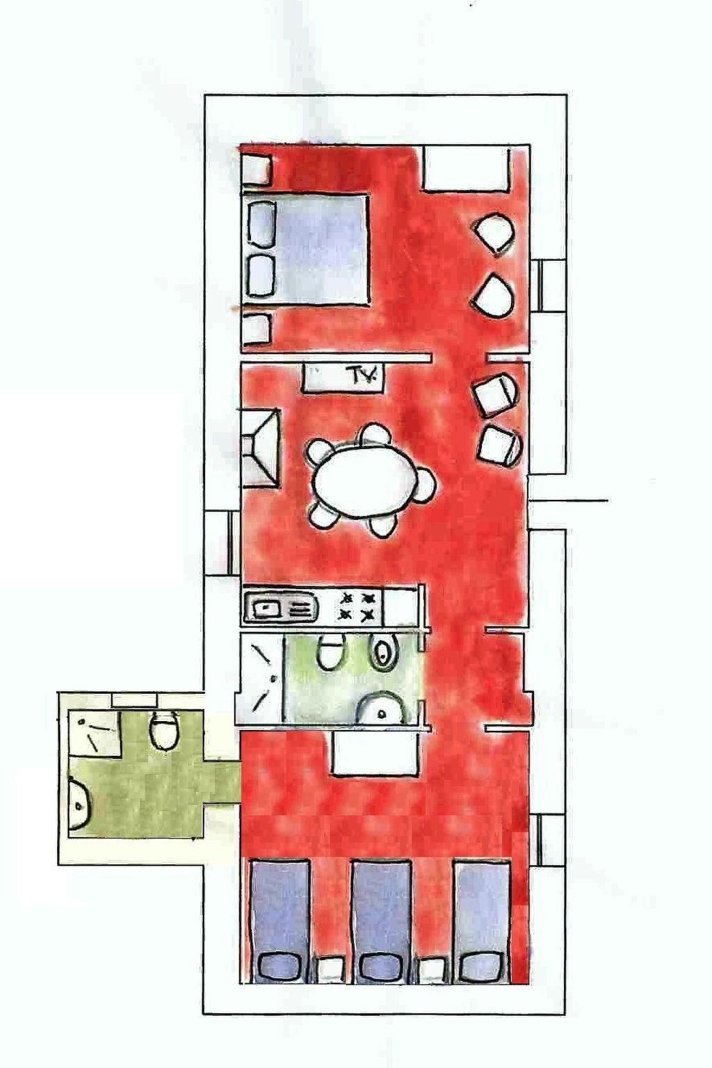 70 sqm ground floor flat for 5 persons. Living room with satellite TV and fireplace, kitchenette (cooker, oven, refrigerator with freezer, toaster, microwave, kettle, Italian coffee maker), one double bedroom, one large room with three beds and private bathroom with shower, one bathroom with shower (hairdryer). Private lounge/terrace area. Large communal garden with children's playground. Amenities: Air conditioning in bedrooms, Wi-Fi, mosquito nets on windows. Pets are welcome.