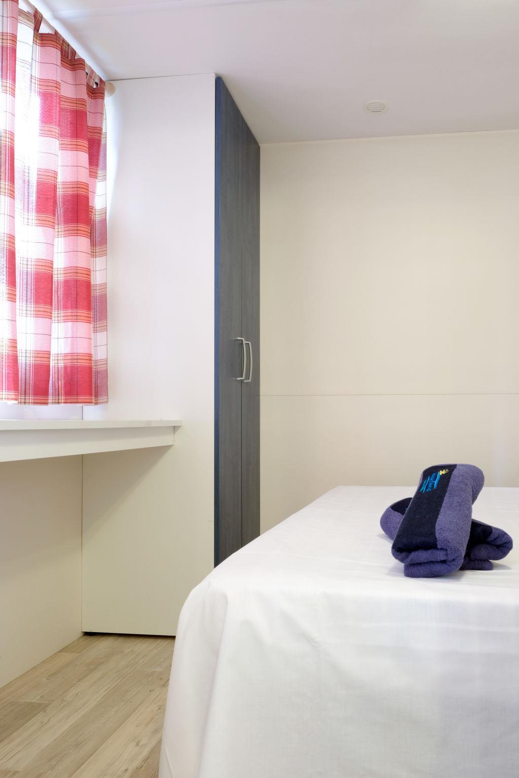 "Happy Easy", 3-room mobile home 25 m2. Object suitable for 4 adults + 1 child. Practical furnishings: living/sleeping room with 1 sleeping facility, dining table, electric heating and air conditioning. 1 room with 1 french bed (140 cm, length 190 cm). 1 room with 2 beds (70 cm, length 190 cm), 1 x 1 bunk beds (65 cm, length 179 cm). Open kitchen (4 hot plates). Shower/WC. Air-conditioning (extra). Terrace partly roofed. Terrace furniture, electric barbecue (portable), deck chairs (2). Facilities: mosquito net. Parking (1 car) at the house. Please note: non-smokers only. IT027044B259ZBAHXC