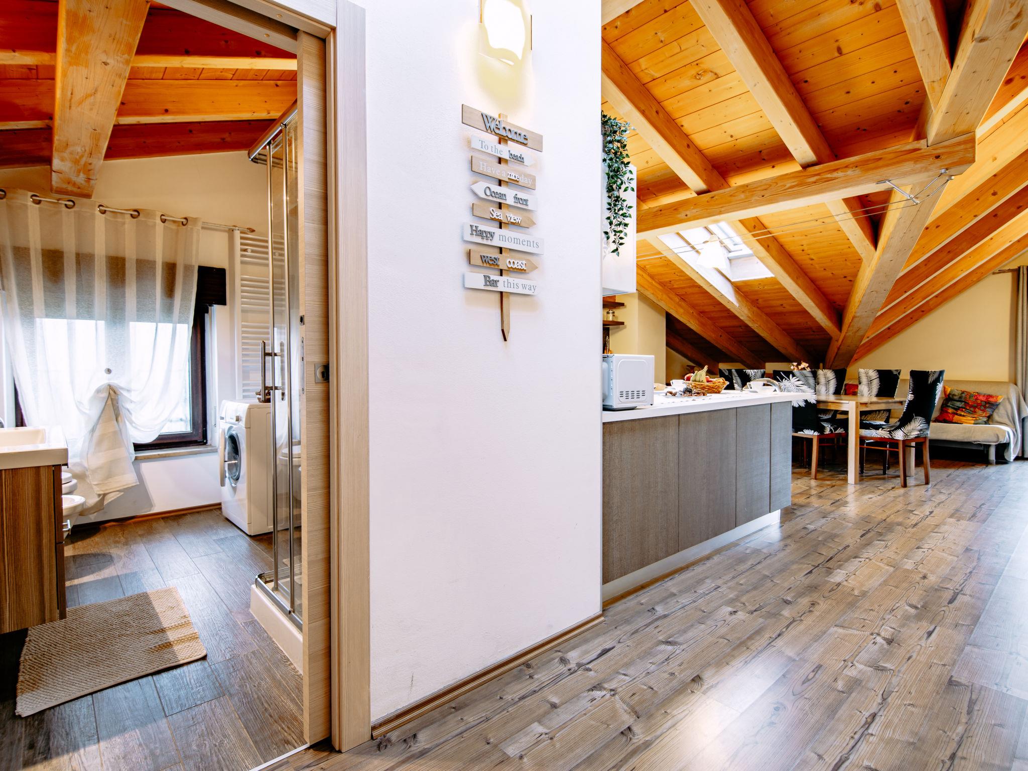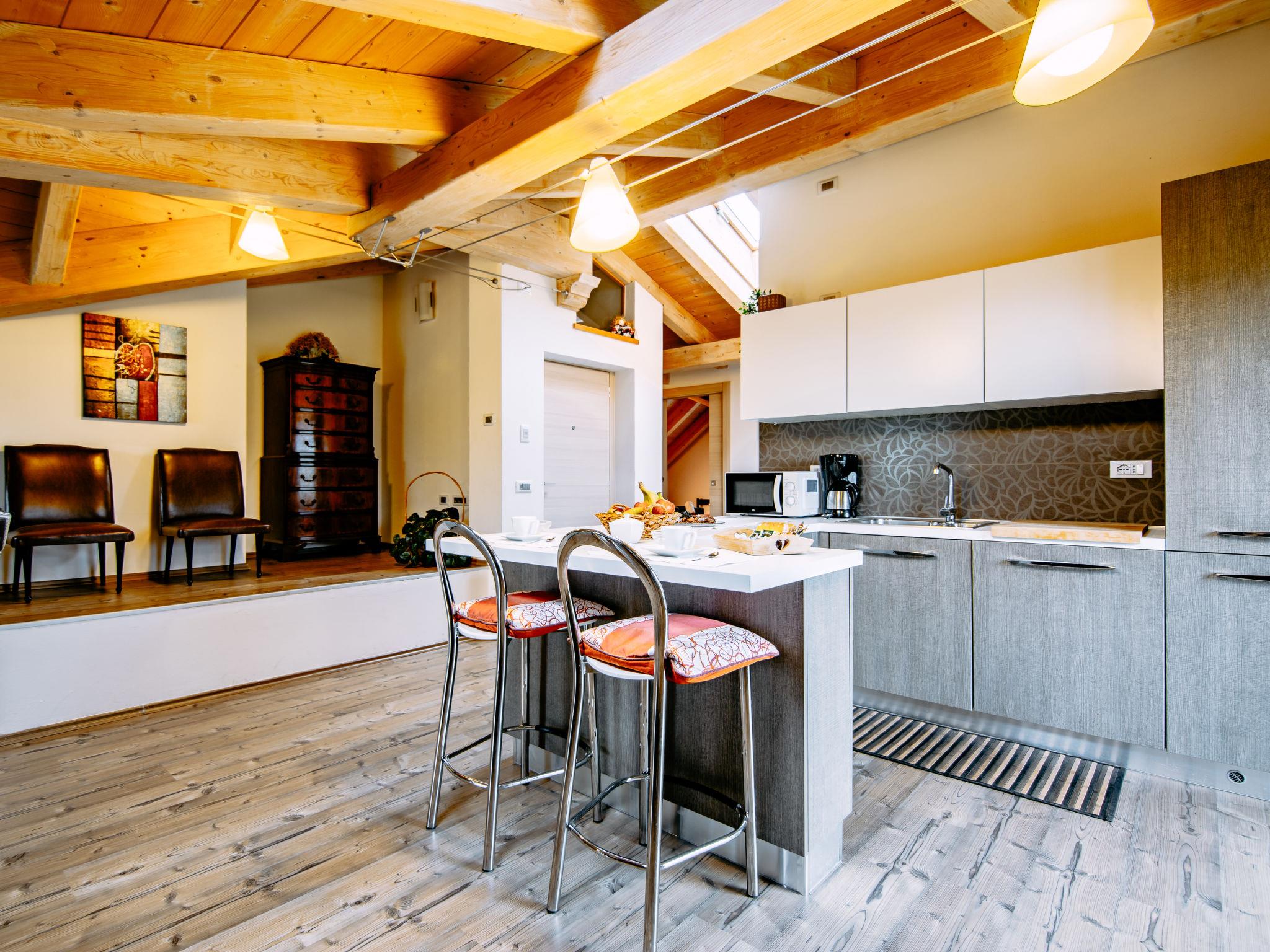 3-room apartment 90 m2, on the top floor. Renovated, tasteful and cosy furnishings: large living/dining room with sloping ceilings with 1 sofabed, dining table and satellite TV. Exit to the balcony. 1 double bedroom. Exit to the balcony. 1 room with 3 beds (80 cm). Open kitchen (oven, dishwasher, Gas stove, 4 gas rings, toaster, microwave, freezer, electric coffee machine). Exit to the balcony. Shower/bidet/WC. Gas heating. 3 balconies. Balcony furniture. View of the mountains and the countryside. Facilities: children's high chair, baby cot (extra). Internet (WiFi, free). Please note: non-smokers only. Maximum 1 pet/ dog allowed. No mandatory extra charges to be paid on-site except for local tax. Bedlinen, final cleaning and all energy costs are included. IT022032C2FMFIBJH7
